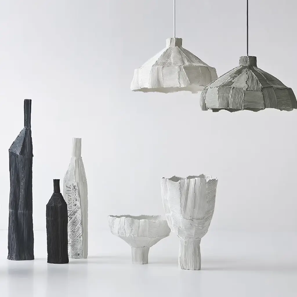 Dramatic and elegant, this superb hanging lamp has a simple silhouette marked by a narrow base, elegantly tapering out into a conical shape culminating in a wide rim. Handmade of paper clay, this piece boasts horizontal and vertical ridges, their distinctive texture achieved by adding paper pulp and natural fibers to the clay mixture. The ridges and the irregular rim of the lamp contrasts with the gold finish along the inside of the lamp, creating a visually striking final product. Every one of Paola Paronetto’s creations is unique. Slight variations in shape, colour and size are to be considered a guarantee of authenticity and value. They are finished with non-toxic satin-finish enamels. It comes with beige rope and white rosette.