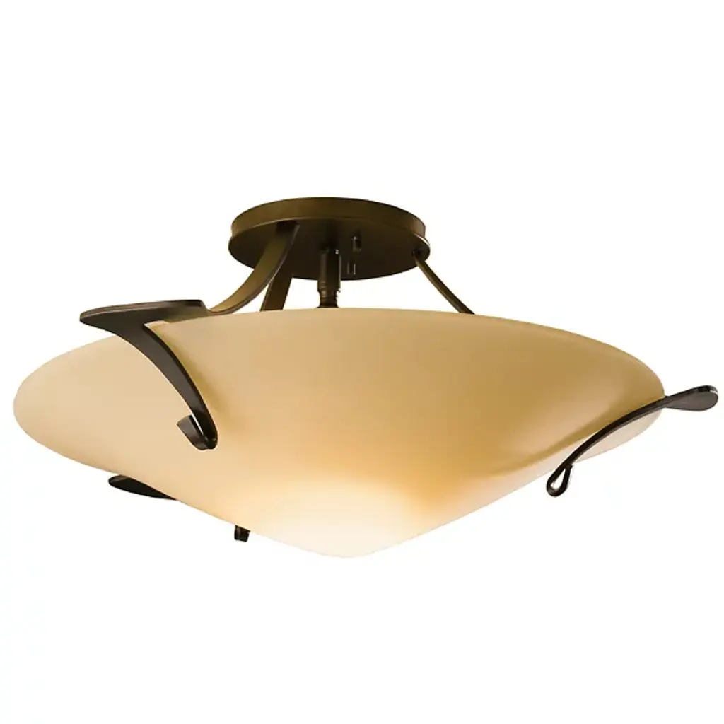 The Antasia ceiling light featuring sinuous curves of iron cradling a glass bowl and the bowl itself, that looks like a dome of water ready to stretch into a drop, was inspired by the art Nouveau movement. Created by artisans at our forge here in Vermont.