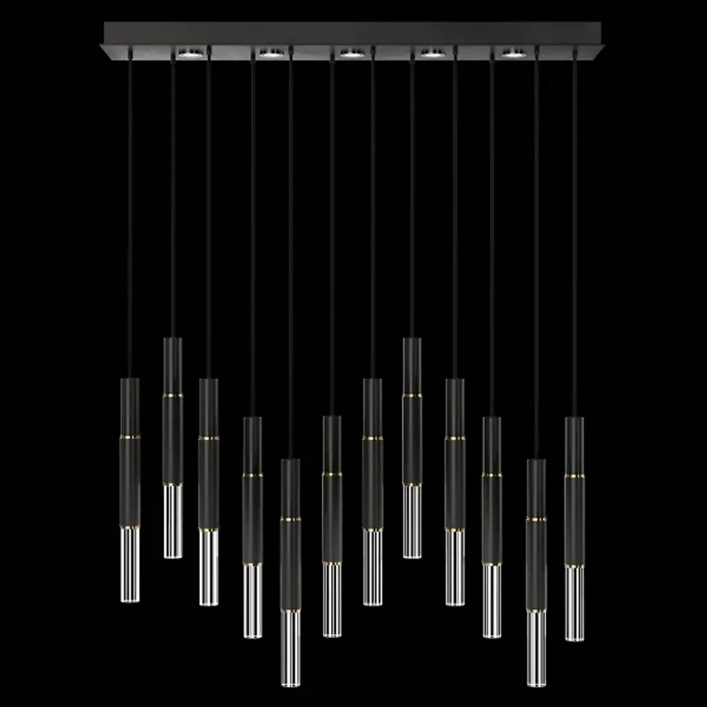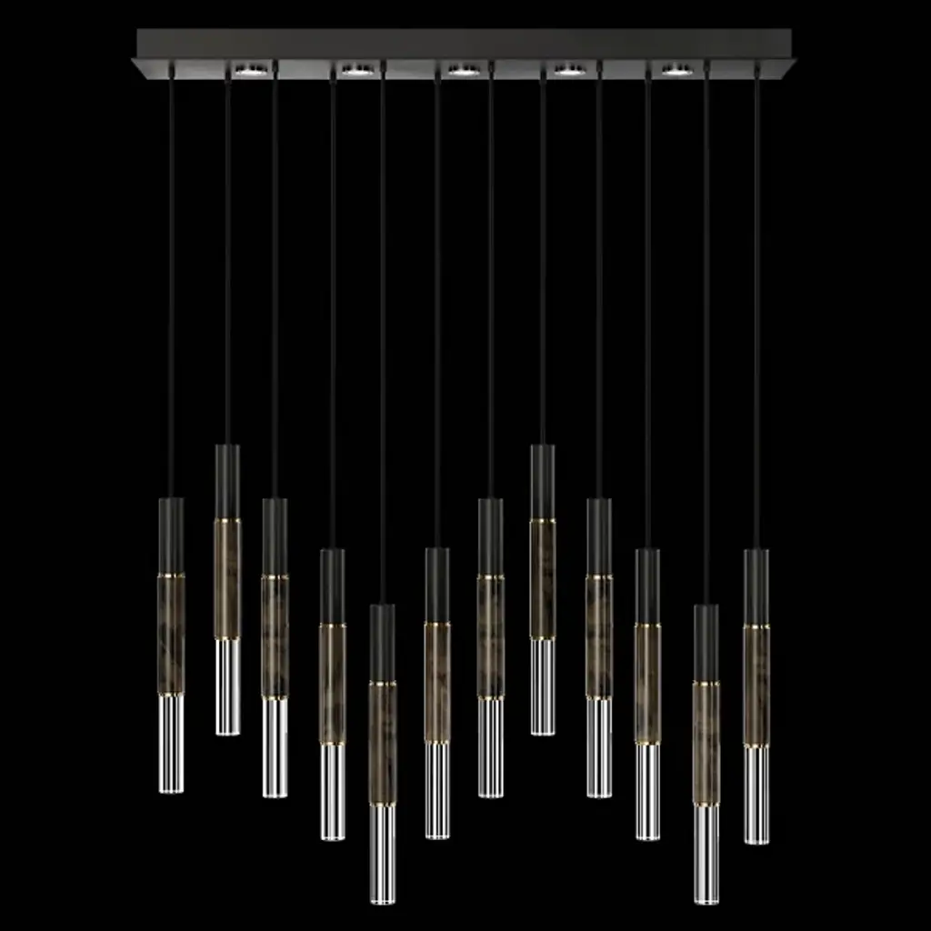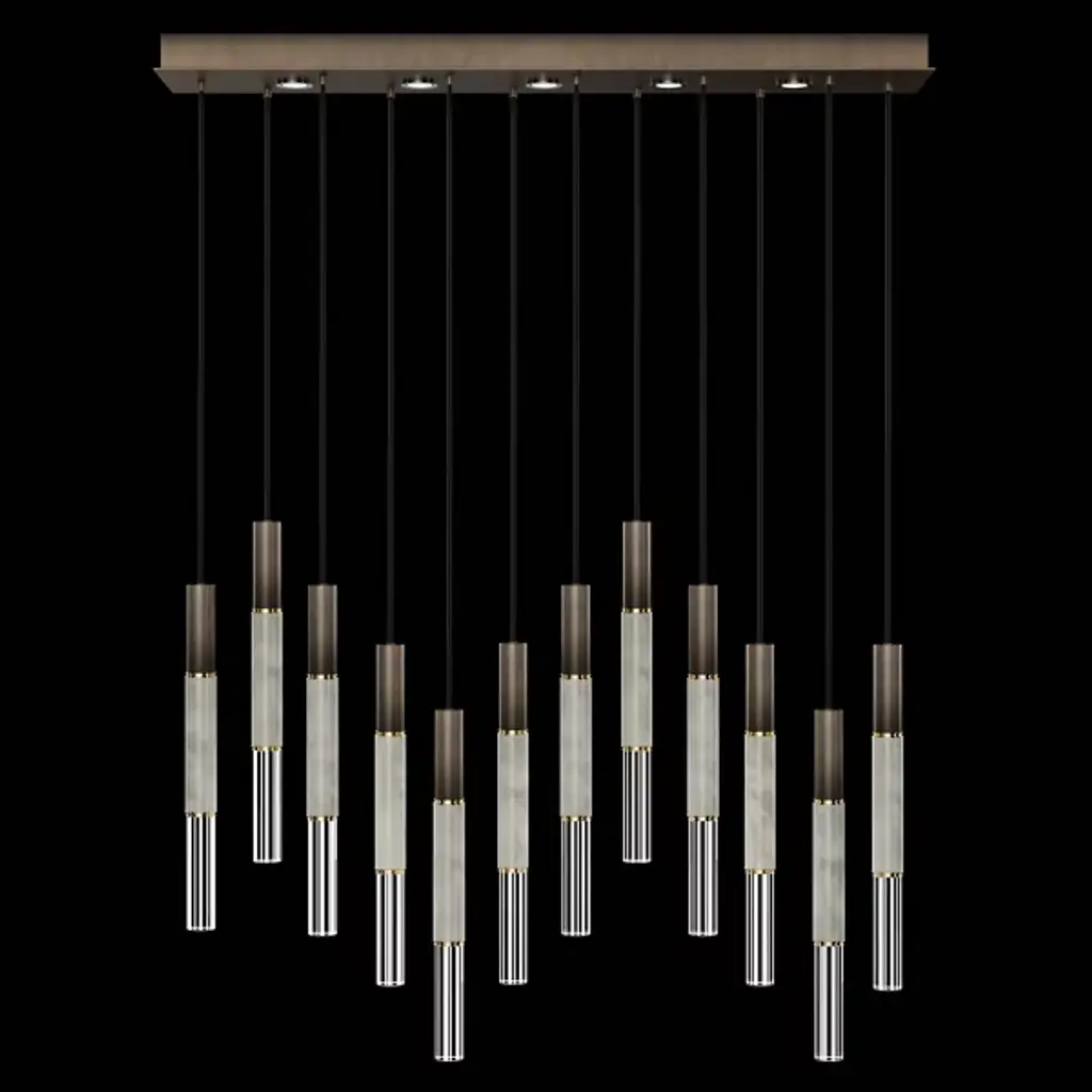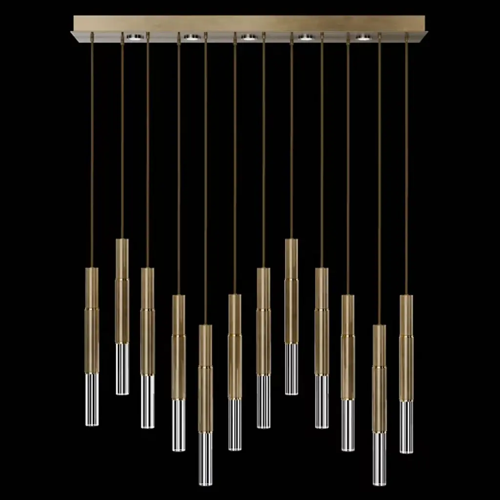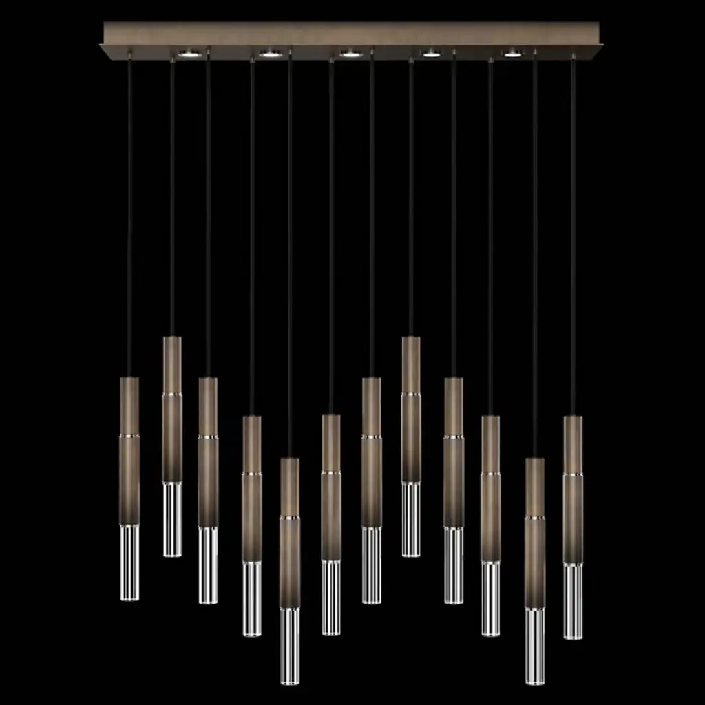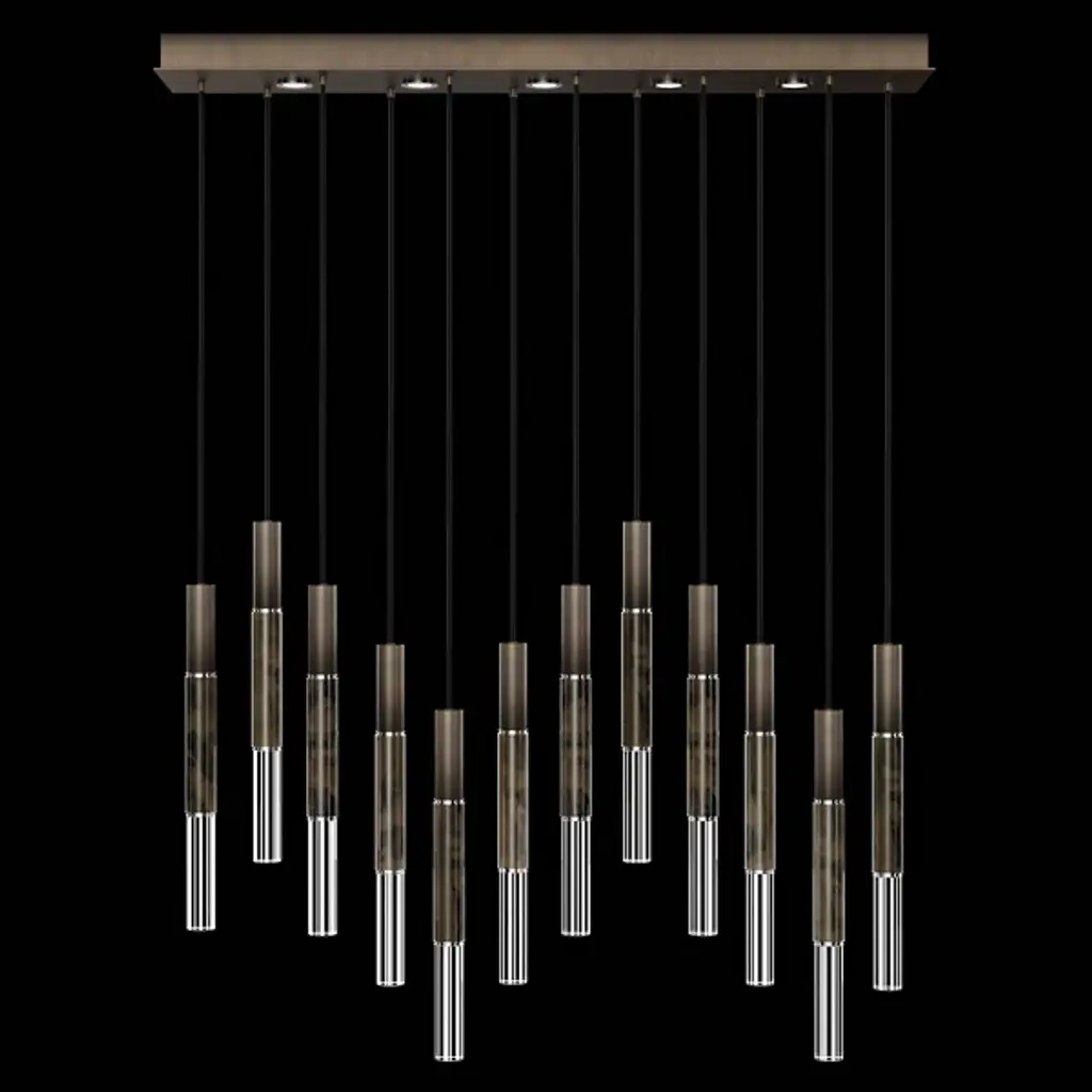 The Antonia LED Linear Suspension from Fine Art Handcrafted Lighting incorporates multiple tubular light elements suspended at varied heights from a rectangular ceiling mount. Created by Antonia Caicedo, each pendant consists of metal and glass sections arranged vertically, creating slender columns of light. The fixture hangs from adjustable braided cords, allowing for customized positioning. Its tubular design directs light both downward and upward, providing ambient illumination throughout the space. This linear arrangement works well above dining areas and kitchen islands, where light must be distributed evenly along the entire length.