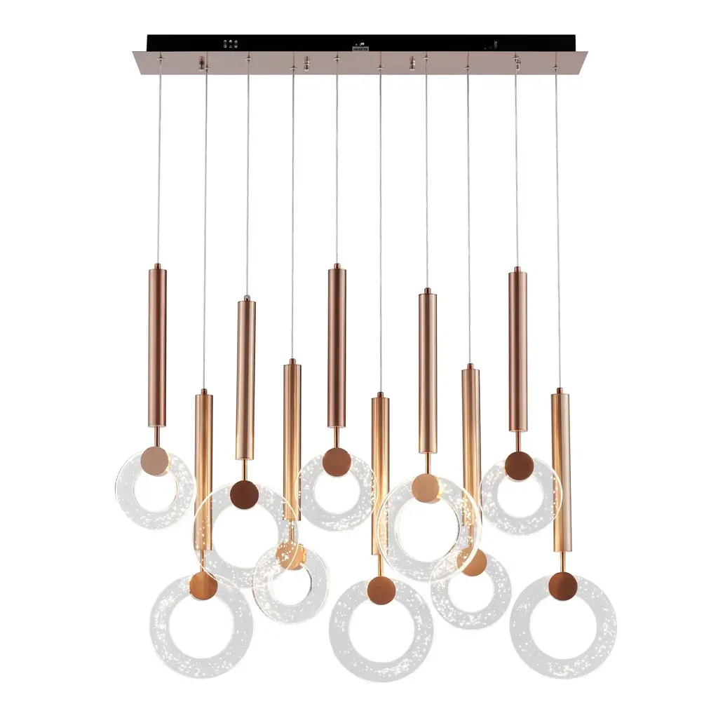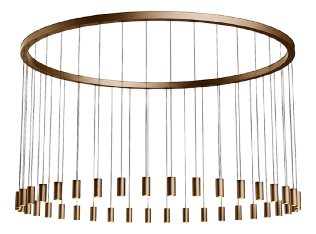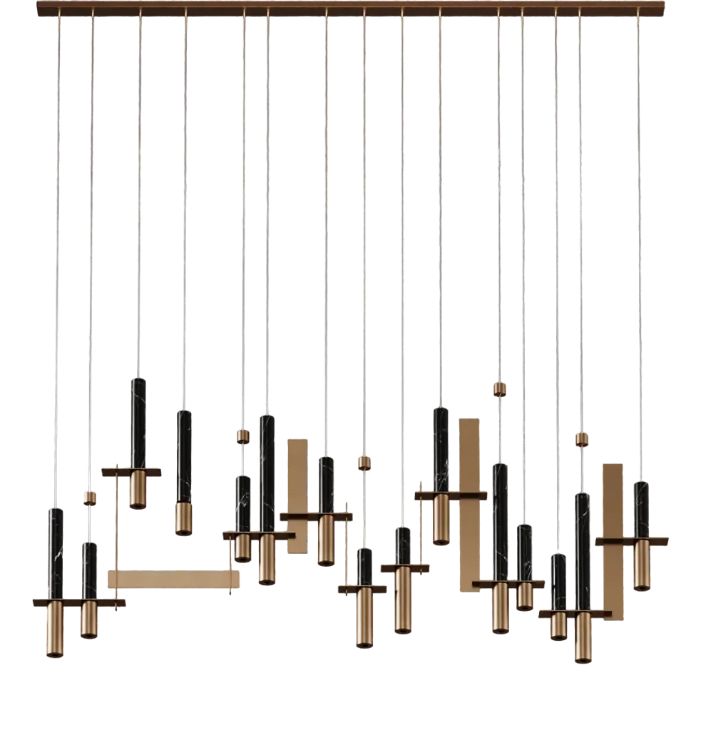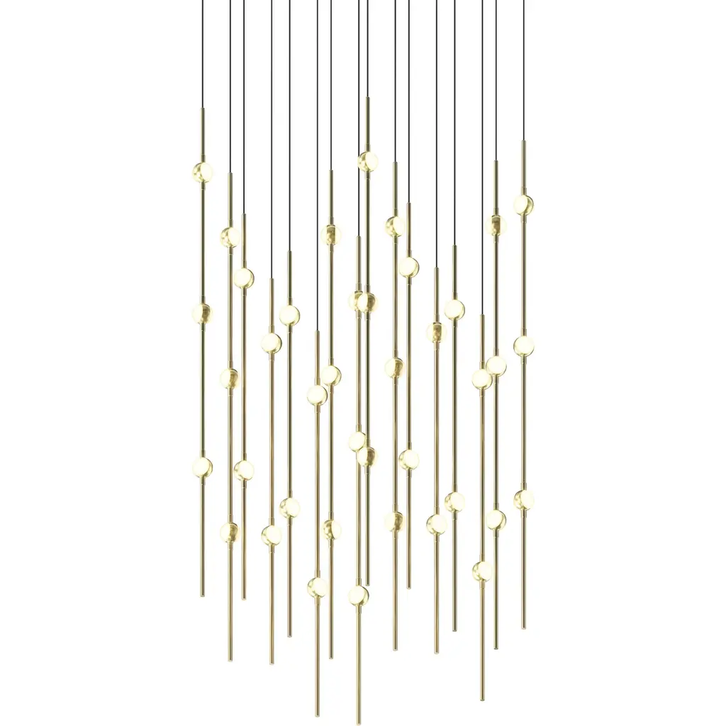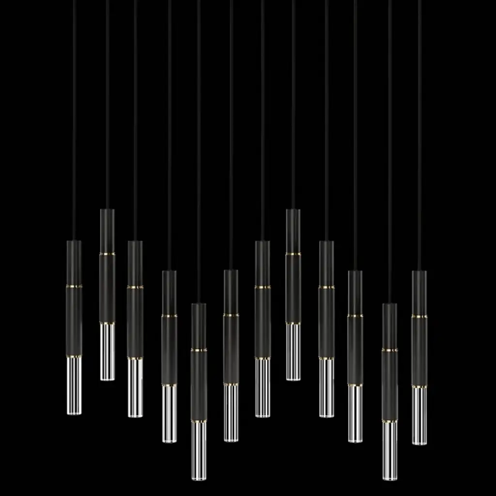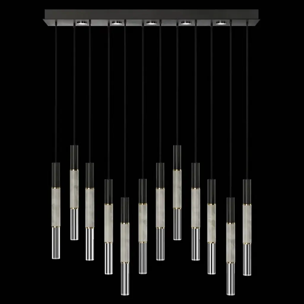 The Antonia LED Linear Suspension from Fine Art Handcrafted Lighting incorporates multiple tubular light elements suspended at varied heights from a rectangular ceiling mount. Created by Antonia Caicedo, each pendant consists of metal and glass sections arranged vertically, creating slender columns of light. The fixture hangs from adjustable braided cords, allowing for customized positioning. Its tubular design directs light both downward and upward, providing ambient illumination throughout the space. This linear arrangement works well above dining areas and kitchen islands, where light must be distributed evenly along the entire length.