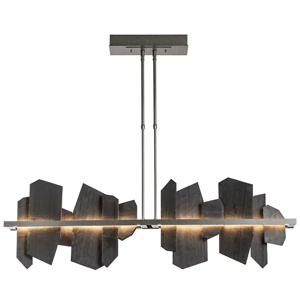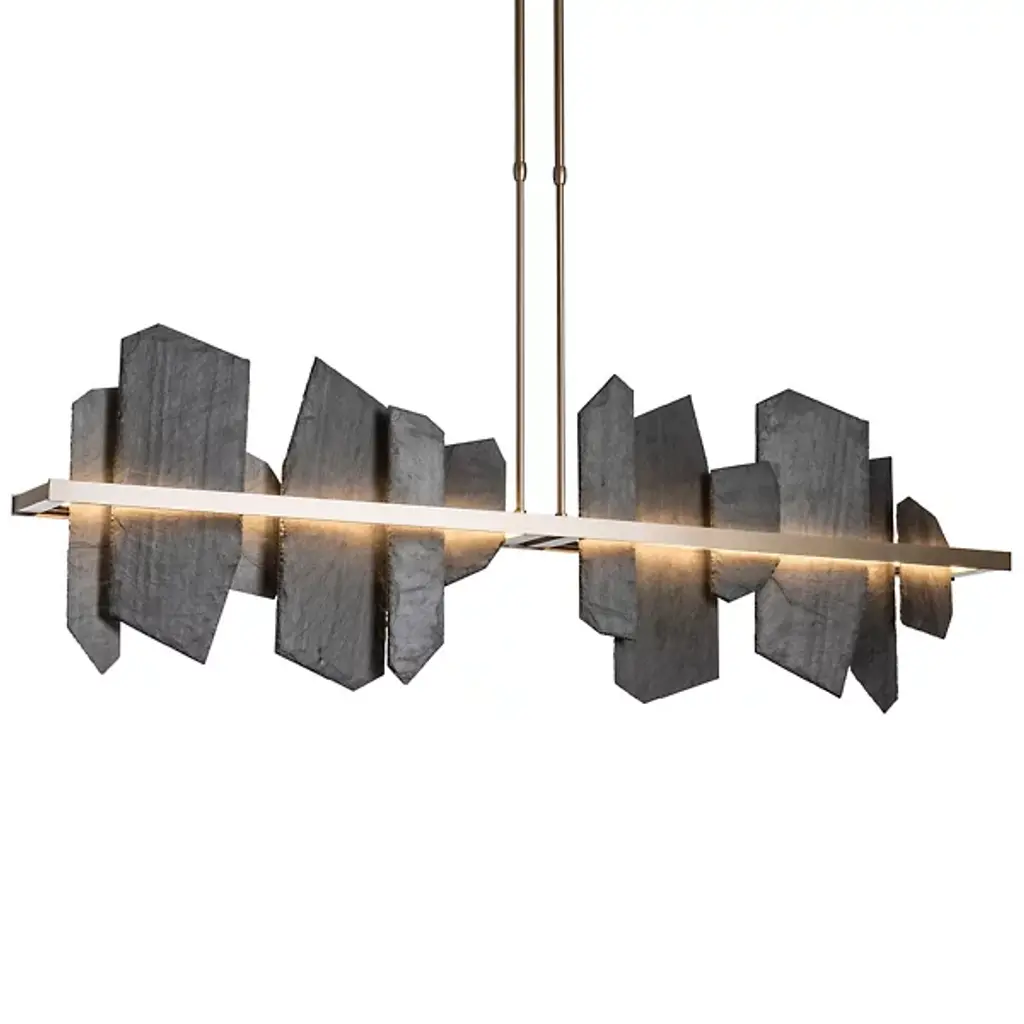 Combining sleek metal with natural slate, the Ardesia LED Linear Suspension by Hubbardton Forge brings a modern edge to interiors. A stepped canopy sends two downrods to a clean, open frame in a smooth metal finish. Vermont black slate pieces are cut and chiseled by hand to form various shapes and sizes as they stand vertically inside the frame. LEDs highlight the slates’ striking textures and cast an even layer of light throughout the room.