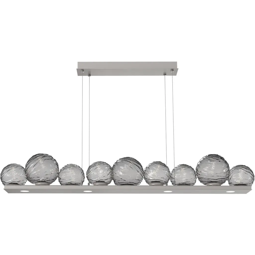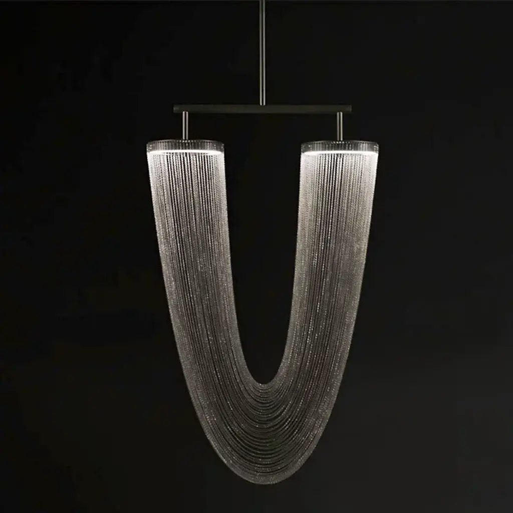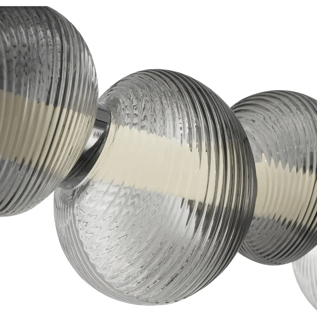 The Ariel Collection LED linear chandelier is a striking fusion of contemporary design and refined sophistication. Its ribbed smoke ombre reflective glass encases a radiant LED white tube, creating a captivating interplay of light and shadow. Complemented by sleek chrome accents and a black-plated frame, this height-adjustable design adds a touch of elegance and adaptability to any setting.
