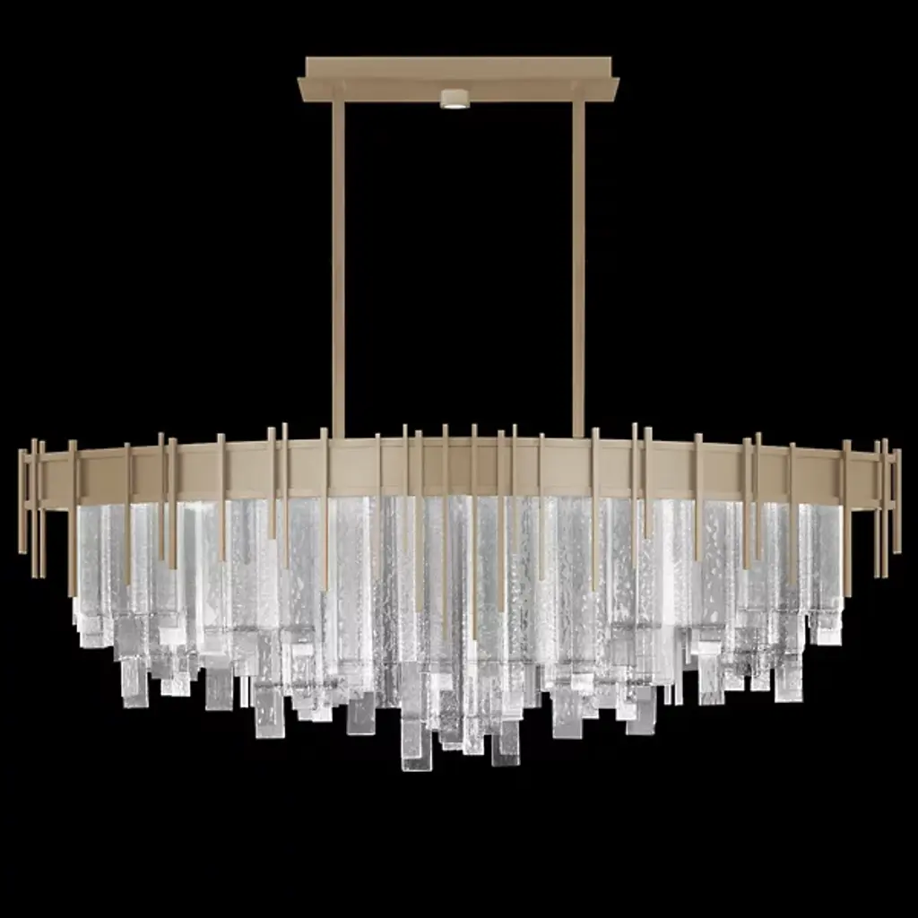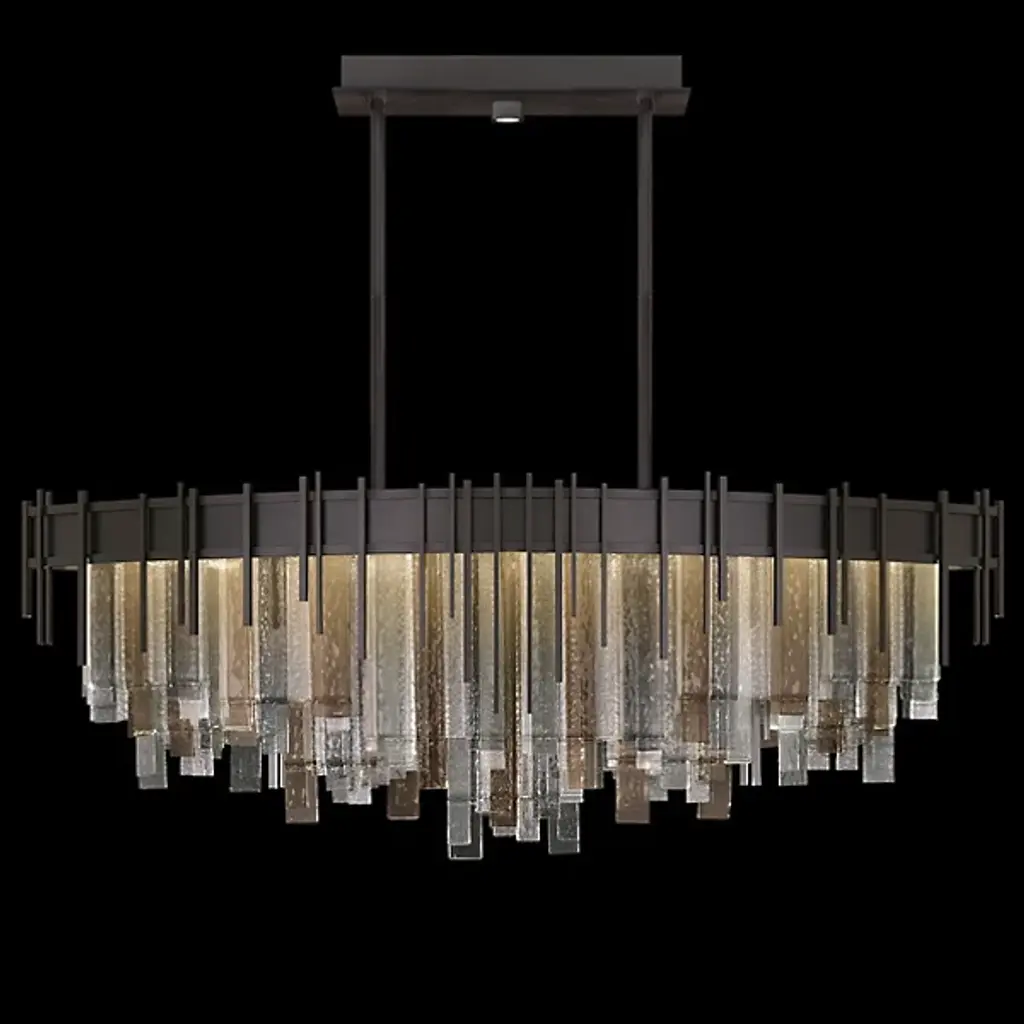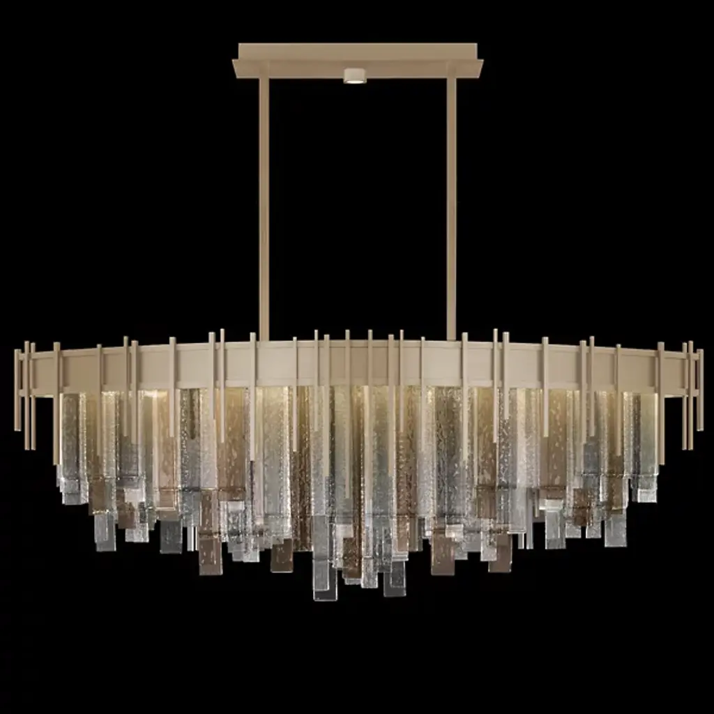 The Arpeggio Large LED Linear Suspension from Fine Art channels the rhythm of jazz through light and form. Suspended from a stepped rectangular canopy by dual stems, its elongated frame holds an array of hand-fused studio glass panels in a mix of clear and tinted hues. Each panel hangs at a different level, creating visual cadence and flow. Integrated LED lighting highlights the layered textures with a warm, ambient glow. With its sculptural presence and Art Deco undertone, it brings a sense of movement and an artistic mood to any modern setting.