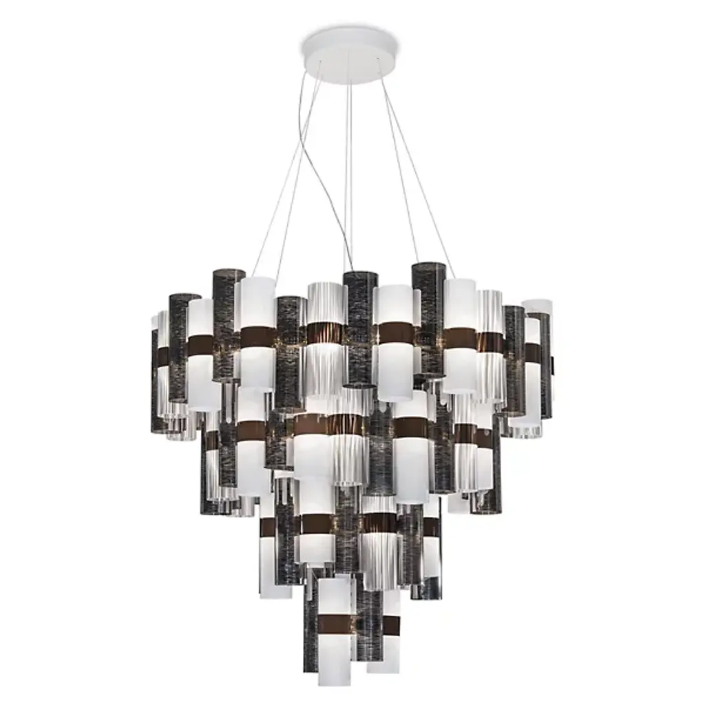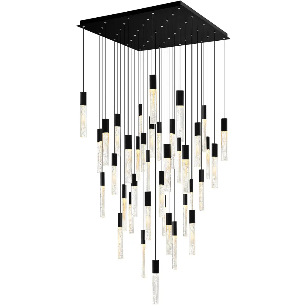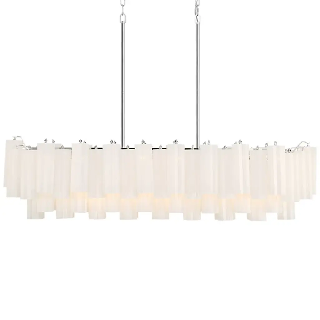 The Arpeggio Large LED Linear Suspension from Fine Art channels the rhythm of jazz through light and form. Suspended from a stepped rectangular canopy by dual stems, its elongated frame holds an array of hand-fused studio glass panels in a mix of clear and tinted hues. Each panel hangs at a different level, creating visual cadence and flow. Integrated LED lighting highlights the layered textures with a warm, ambient glow. With its sculptural presence and Art Deco undertone, it brings a sense of movement and an artistic mood to any modern setting.