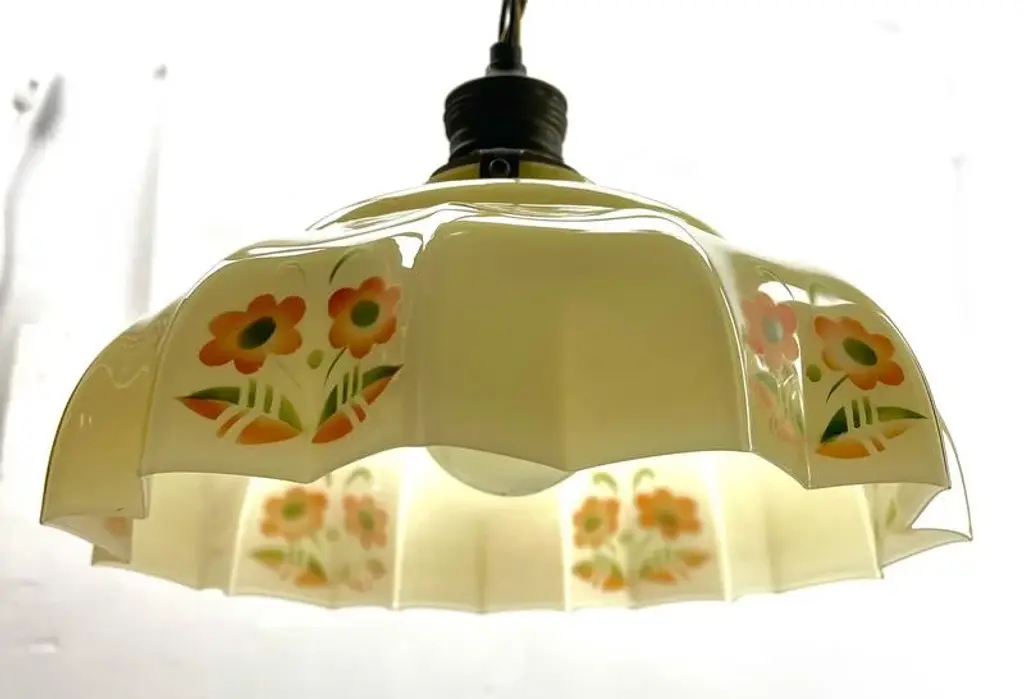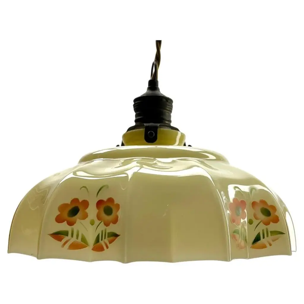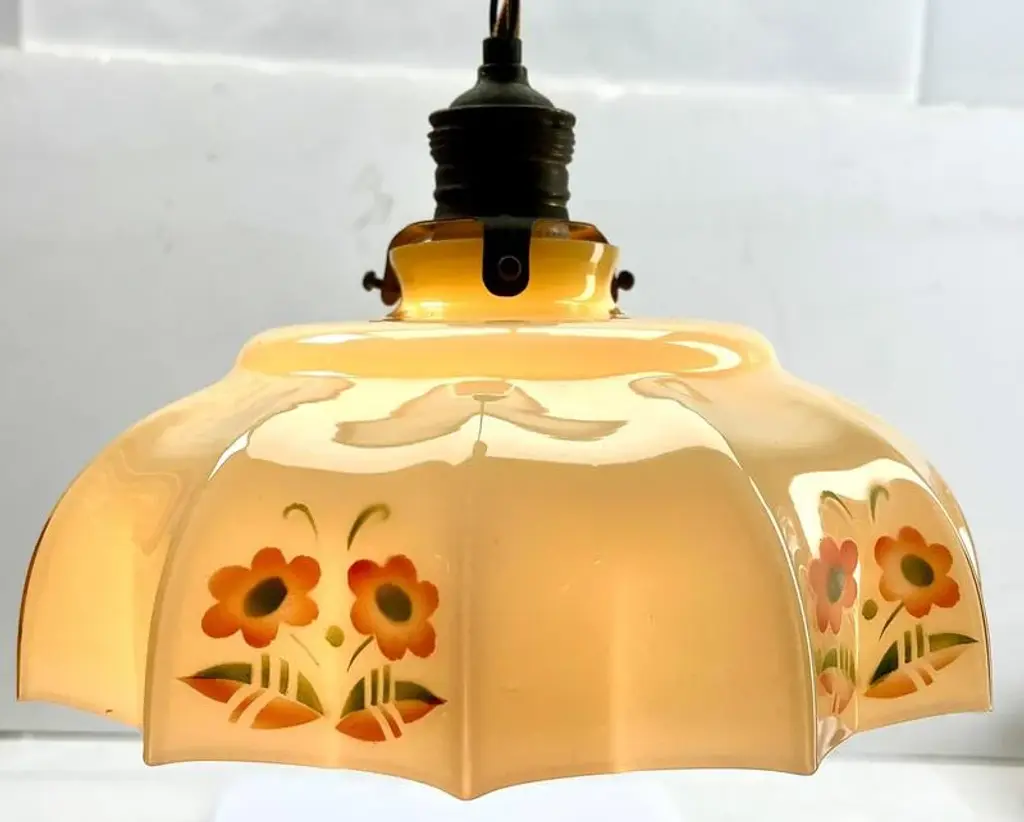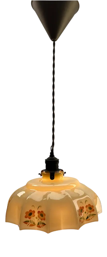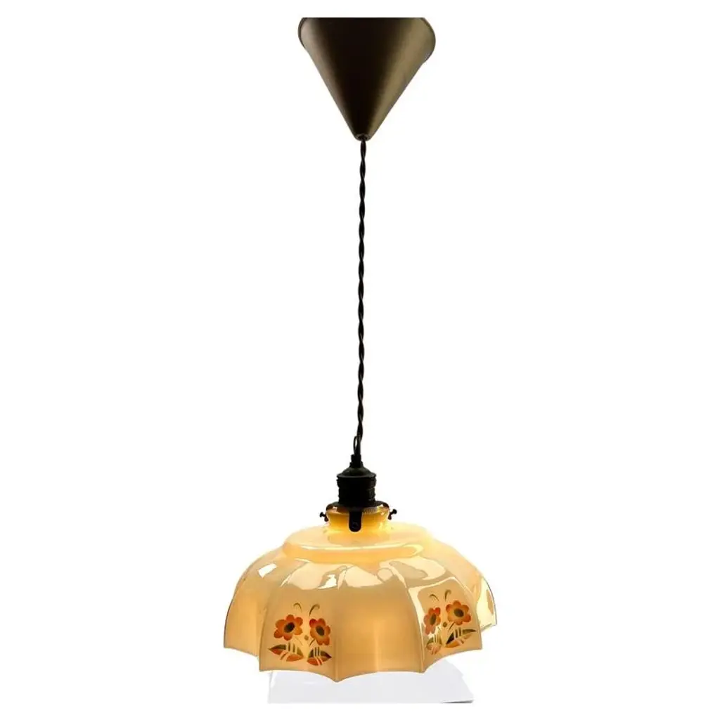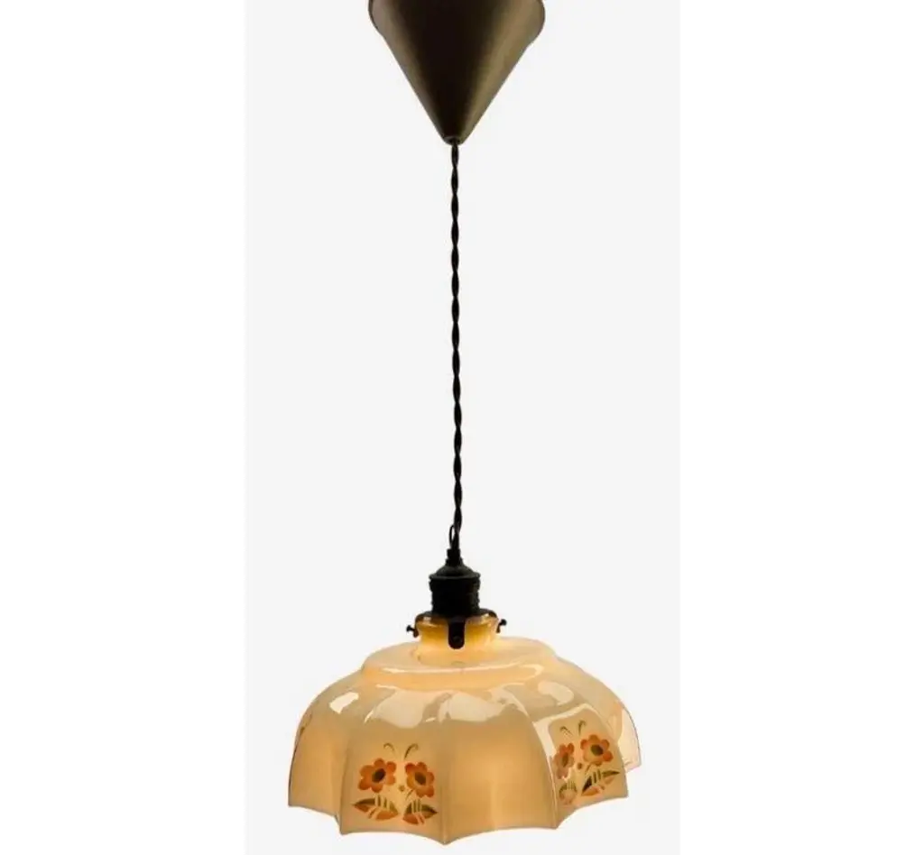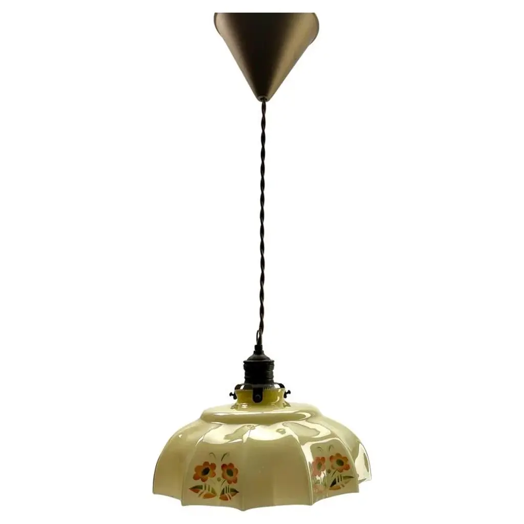 Art nouveau ceiling lamp. Photography fails to capture the simple elegant illumination provided by this lamp. Fitting messing pendant ceiling light with fixing to hold a stylish belgian art deco lampshade. Good distribution of darker and lighter bleu shades. A perfect example of art nouveau decorative arts, an original piece, made in the period 1930. Measures: shade 24 cm x 12 cm. On an adjustable wiring. We are happy to adjust the height to your wishes at no extra cost. In excellent condition and in full working order. New wiring originel fitting e27 and safe for immediate usage in the world. this piece is attributed to the mentioned designer/maker. It has no attribution mark and no official proof of authenticity, however it is well documented in design history. I take full responsibility for any authenticity issues arising from misattribution, up to 250v (europe/uk standard).the wiring of this item may be original and might need replacement, if not specified otherwise.