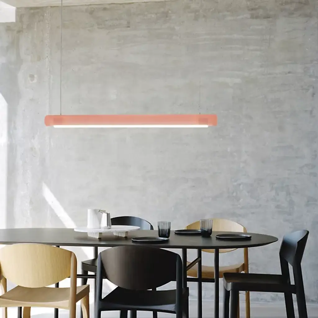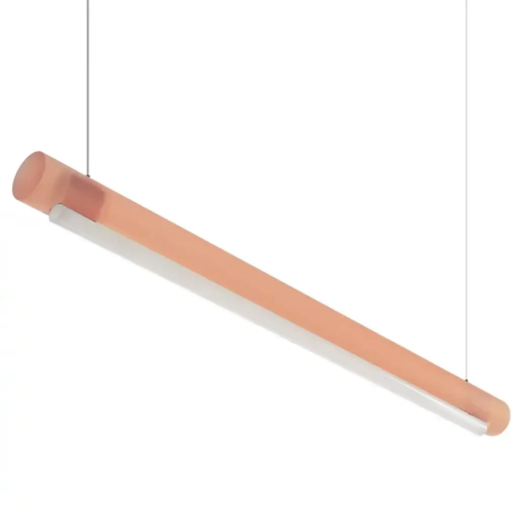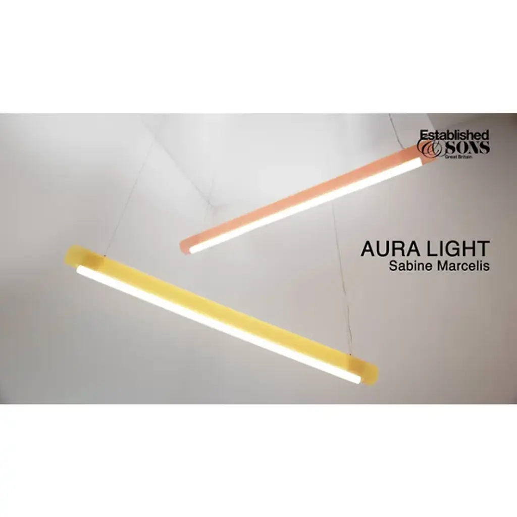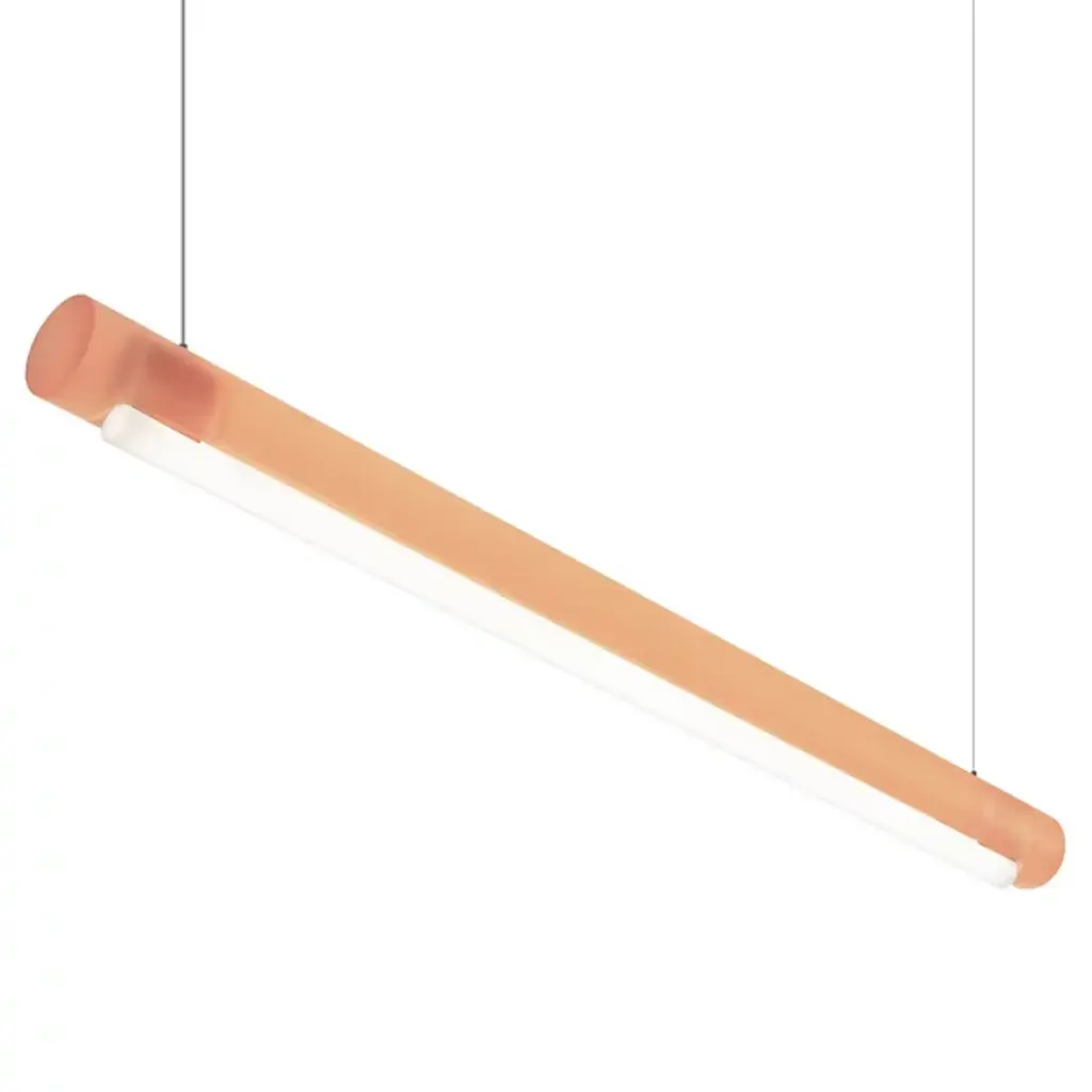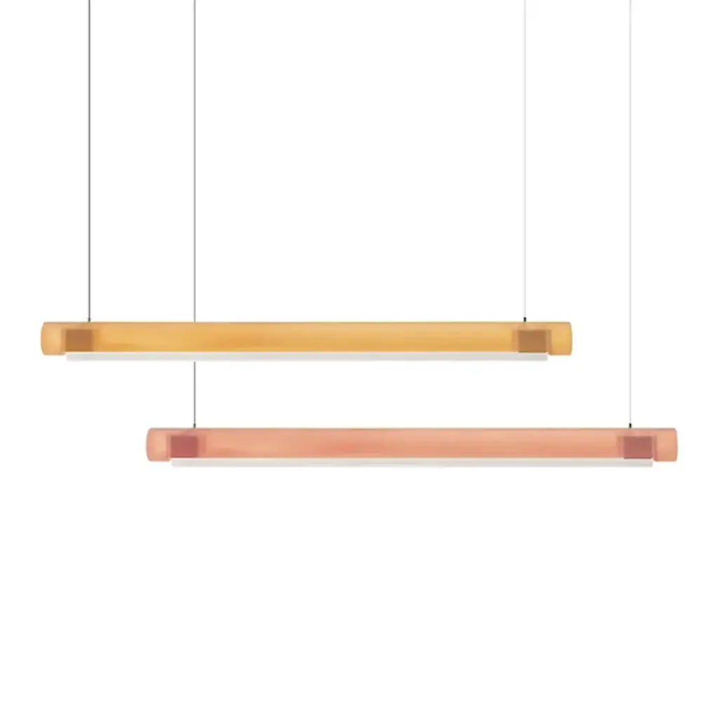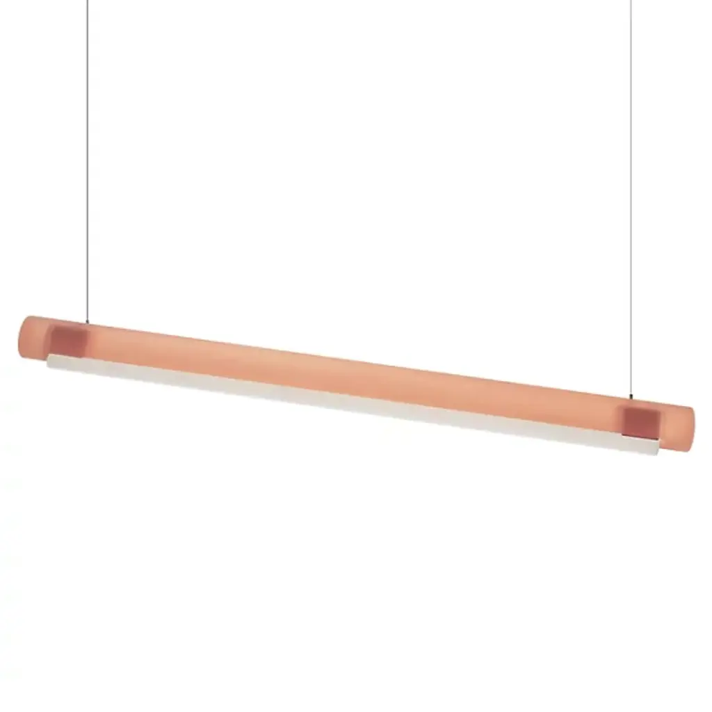 Transform open interiors with the organic artistry of the Aura LED Linear Suspension from Established & Sons. A mix of contemporary simplicity and Mid-Century Modern refinement, this Sabine Marcelis design leverages her experience with cast translucent materials, relying on a cylinder-shaped bar suspended via a cable that houses LED lamping within. The polyester and acrylic structures are recyclable and soften direct light through their translucent material, casting a softer ambiance that can work in larger living spaces or even a home office.
