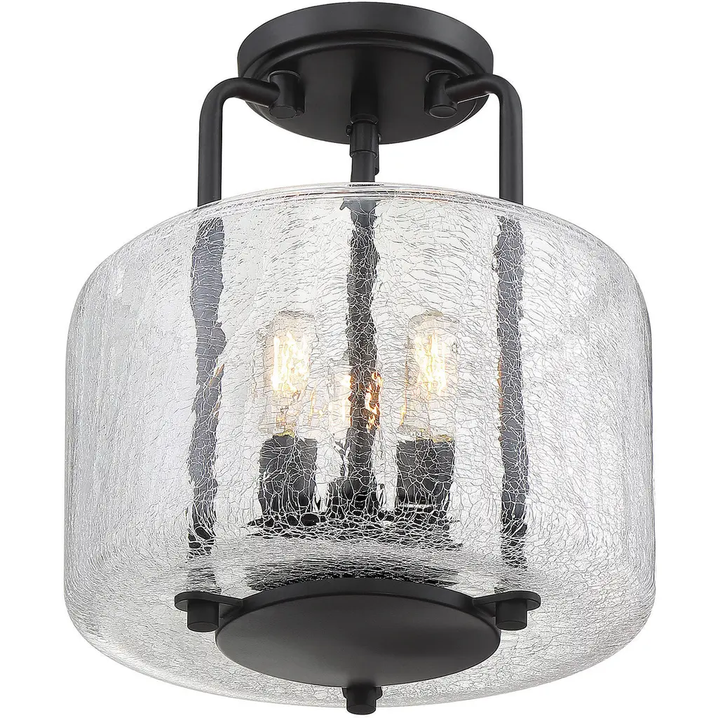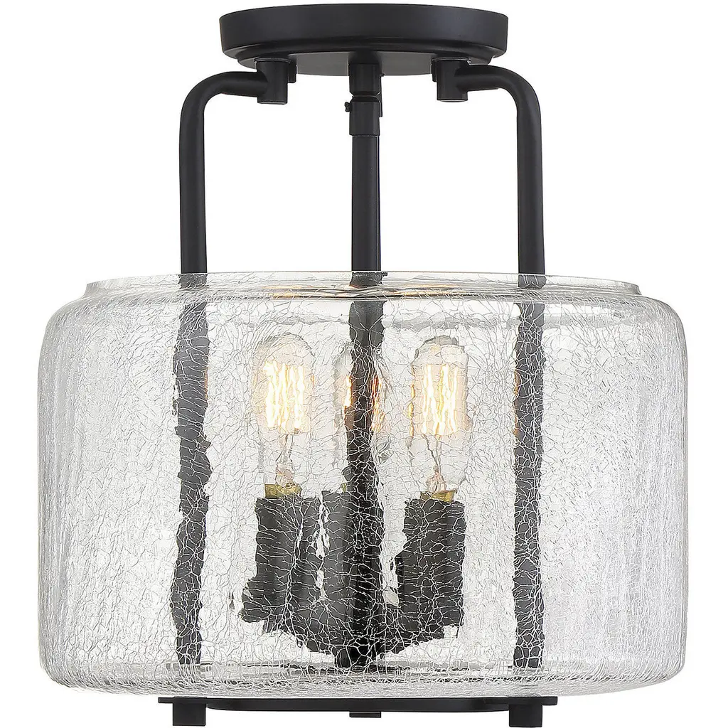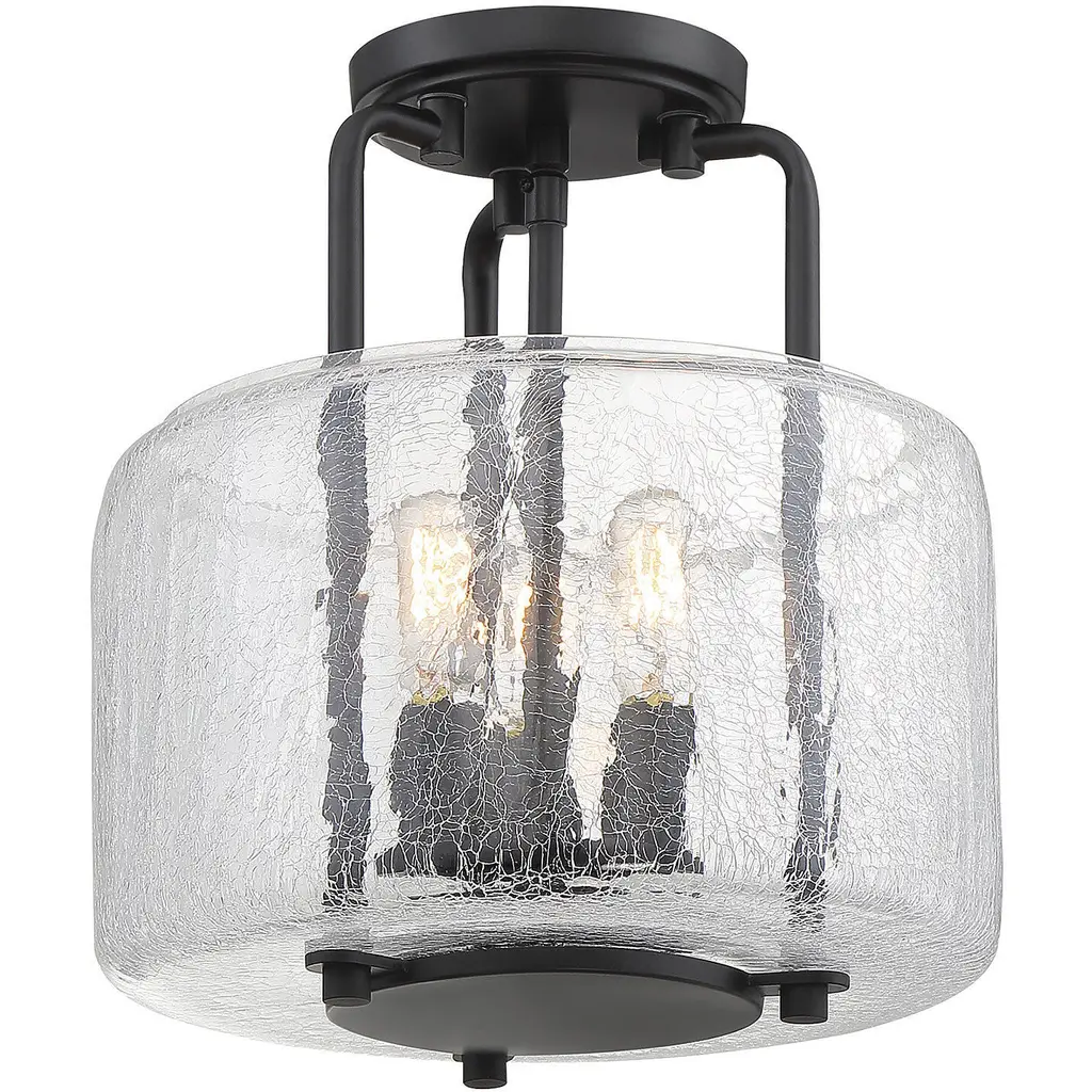 A perfect blend of traditional and contemporary creates the classic, timeless design of the Avalon. This ceiling fixture is an excellent fit for your transitional, traditional or modern farmhouse decor style. The circular ceiling plate holds a frame of three bold vertical bars, flat round finial and inner 3-light structure with metal candle covers, all with a black finish. The large drum-shaped shade is made of delightful clear crackled glass. Within the glass shade, three 60W candelabra size bulbs provide plenty of illumination. The Avalon measures 11.38" wide and 12.25" high with a semi-flush mounting, making it ideal for your living room, dining room, kitchen, family room, bedroom, foyer, great room, closet, office or hallway.