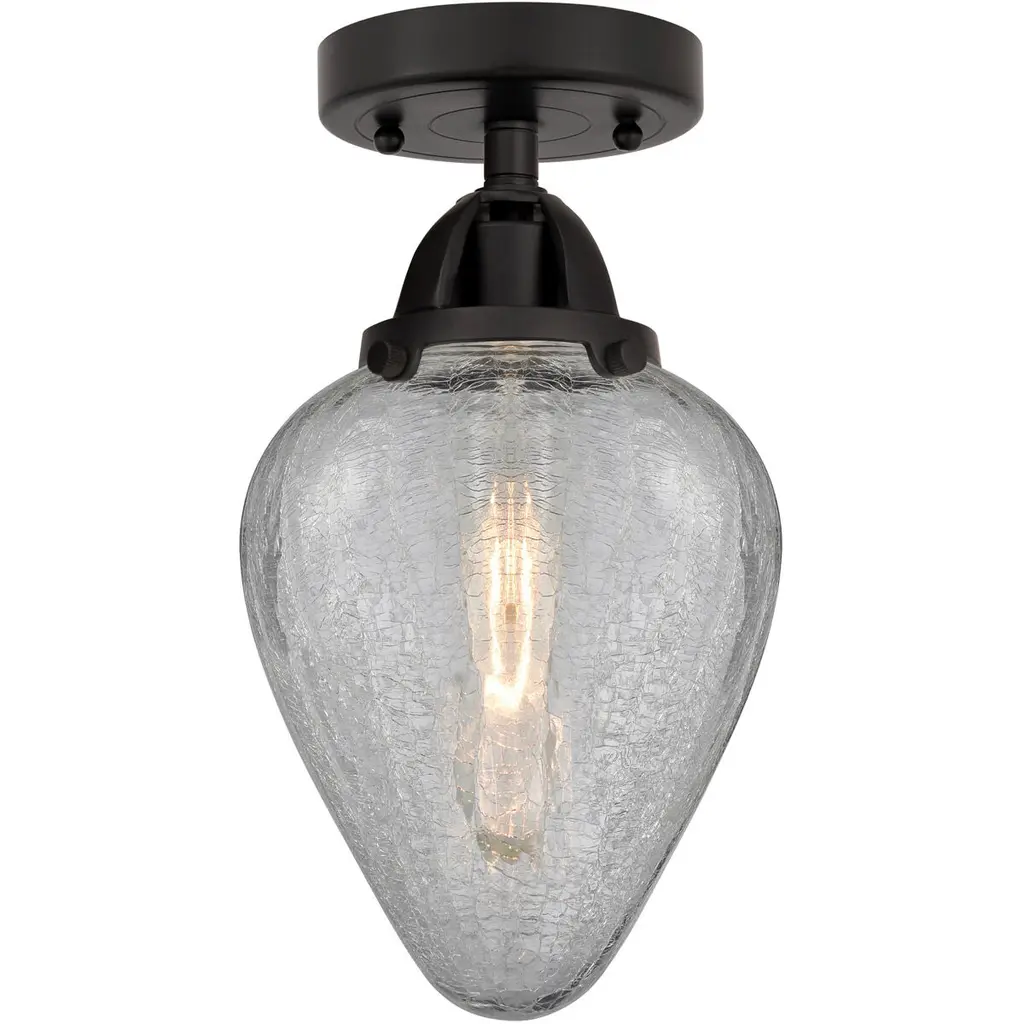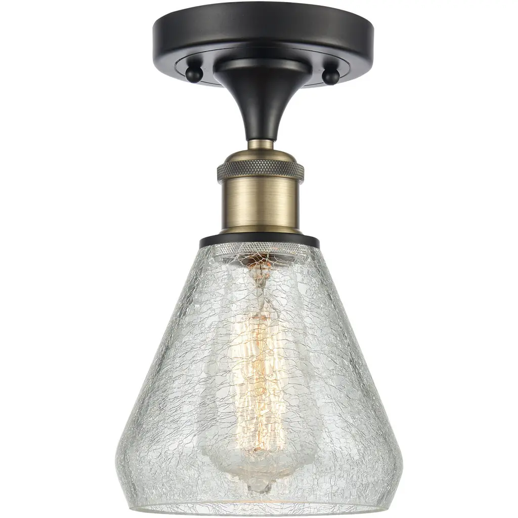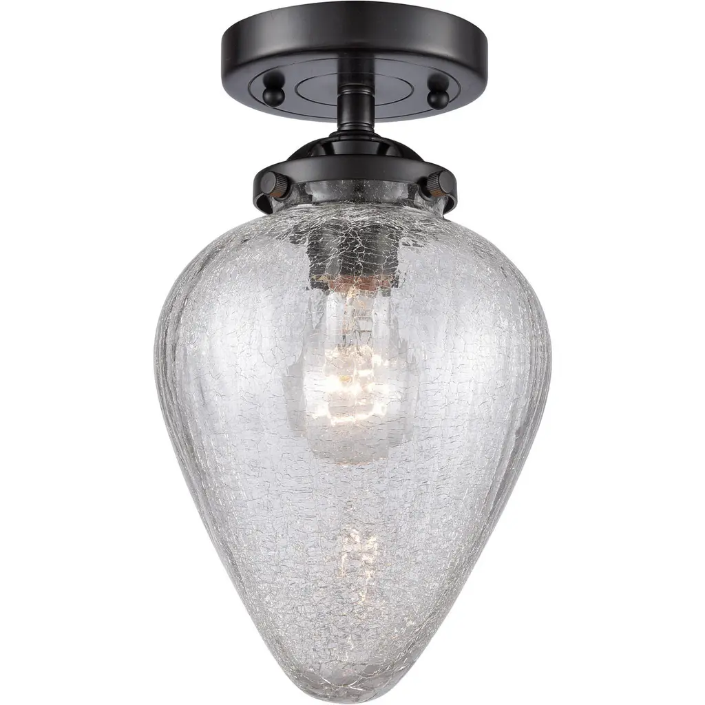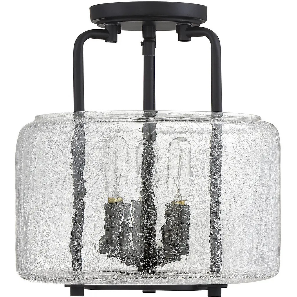 A perfect blend of traditional and contemporary creates the classic, timeless design of the Avalon. This ceiling fixture is an excellent fit for your transitional, traditional or modern farmhouse decor style. The circular ceiling plate holds a frame of three bold vertical bars, flat round finial and inner 3-light structure with metal candle covers, all with a black finish. The large drum-shaped shade is made of delightful clear crackled glass. Within the glass shade, three 60W candelabra size bulbs provide plenty of illumination. The Avalon measures 11.38" wide and 12.25" high with a semi-flush mounting, making it ideal for your living room, dining room, kitchen, family room, bedroom, foyer, great room, closet, office or hallway.