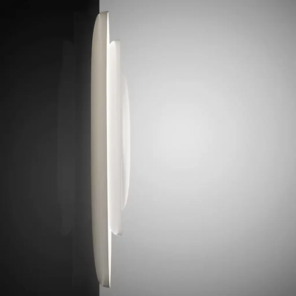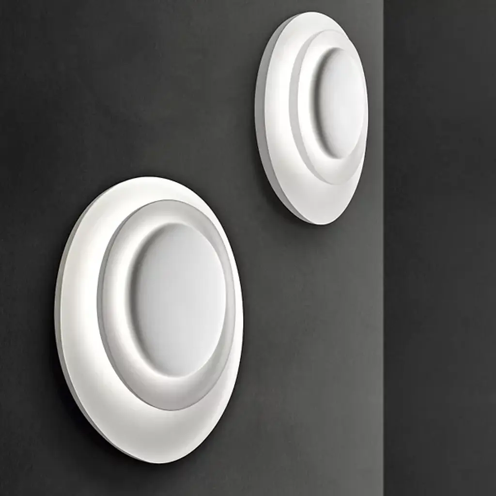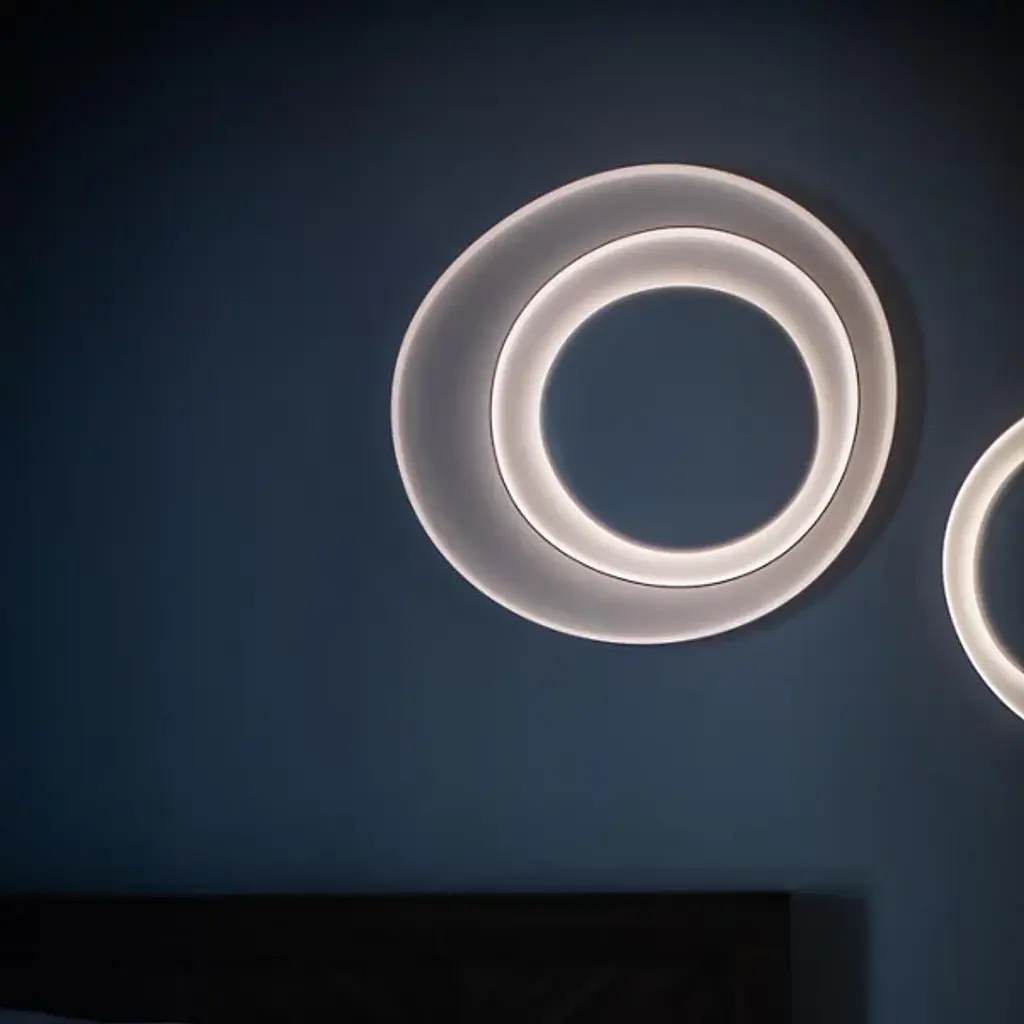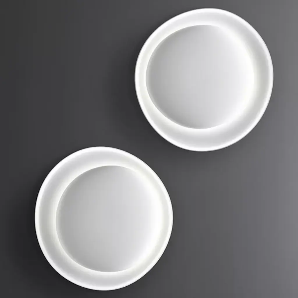 The Foscarini Bahia Wall/Ceiling Light seems to have harnessed the shape of ripples on water, featuring layered disks of indirect light. Composed of white polycarbonate, the central diffuser obscures the LED light source, revealing halos of light as the rings pan outward. An intriguing source of illumination for both wall and ceiling applications, the slender profile provides both functional and artful light that craves to be installed in modular applications.