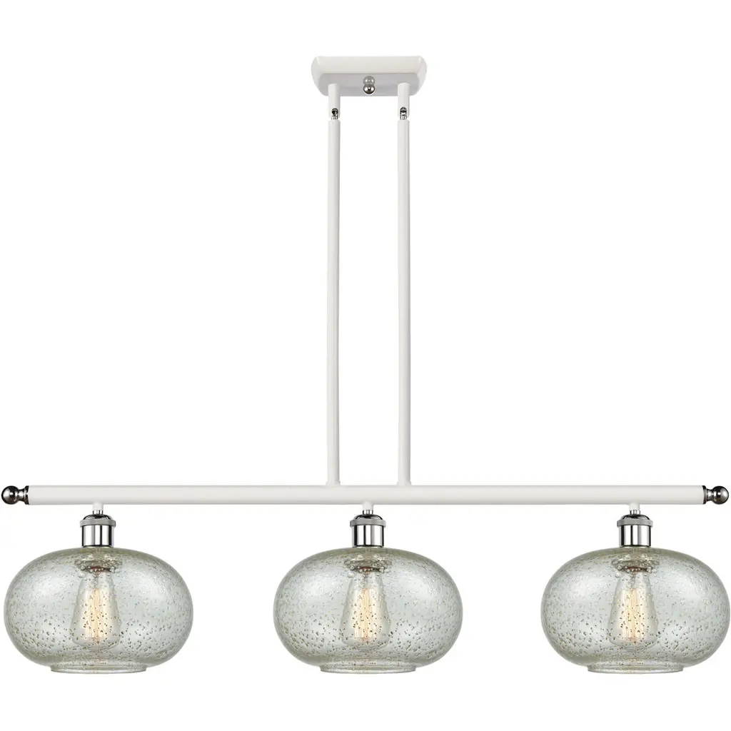The Gorham 3 Light Island Light is part of the Ballston Collection. Includes 10 Feet Wire. Includes 2-6 and 4-12 inch Stems. Additional Stems sold separately.. Solid Brass 90 Degree Hang Straight Swivel for Sloped Ceilings Included