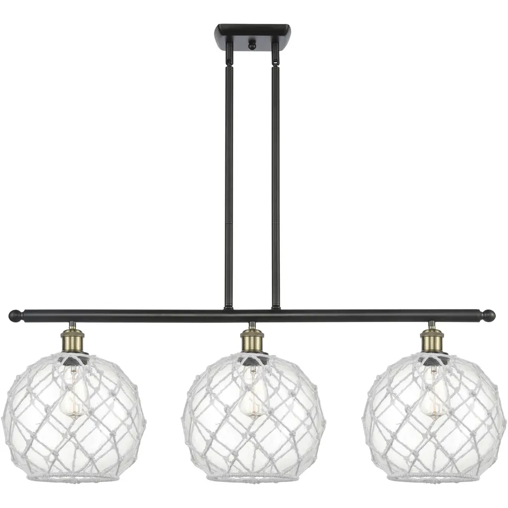 The Large Farmhouse Rope 3 Light Island Light is part of the Ballston Collection. Includes 10 Feet Rope. Includes 2-6 and 4-12 inch Stems. Additional Stems sold separately.. Solid Brass 90 Degree Hang Straight Swivel for Sloped Ceilings Included