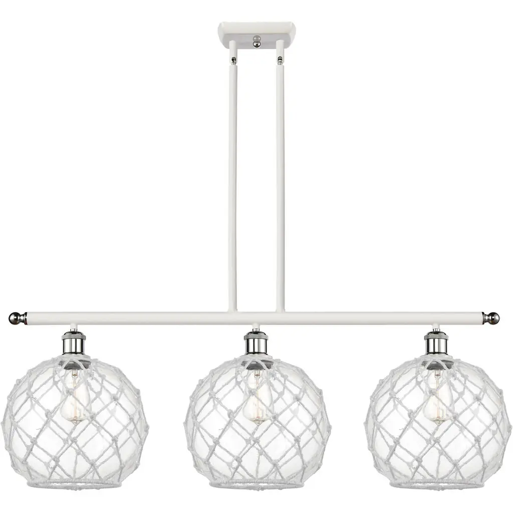 The Large Farmhouse Rope 3 Light Island Light is part of the Ballston Collection. Includes 10 Feet Rope. Includes 2-6 and 4-12 inch Stems With Solid Brass 90 Degree Hang Straight Swivels for Sloped Ceilings. Solid Brass 90 Degree Hang Straight Swivel for Sloped Ceilings Included