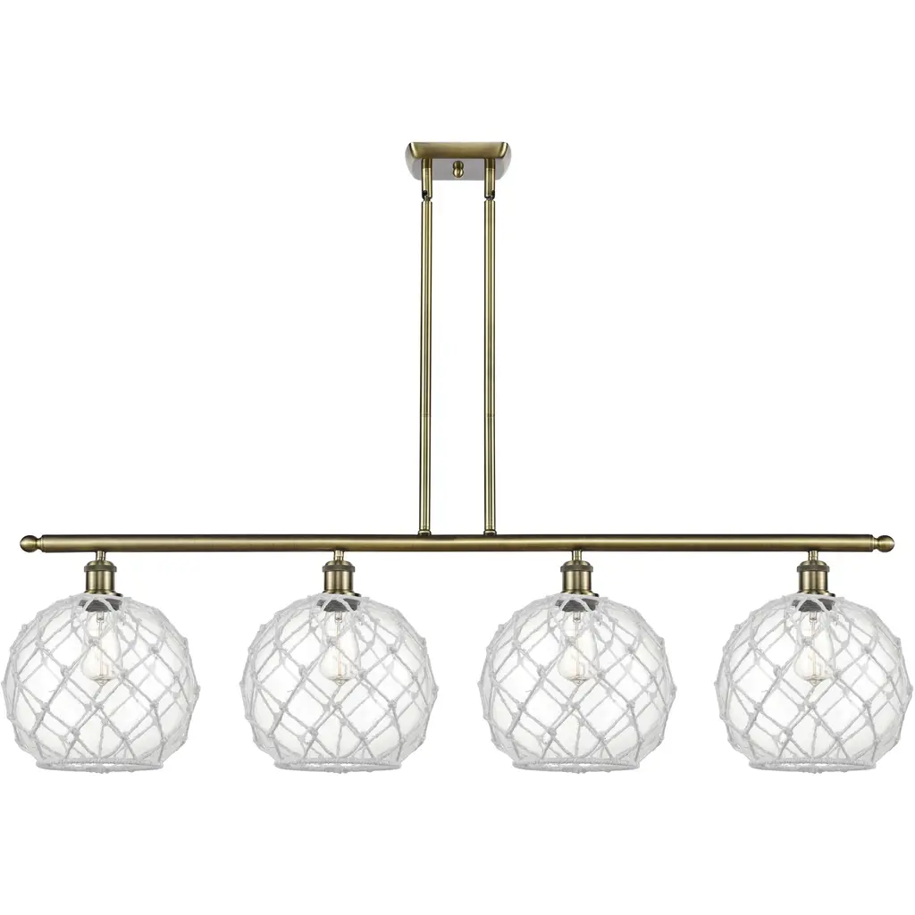 The Large Farmhouse Rope 3 Light Island Light is part of the Ballston Collection. Includes 10 Feet Rope. Includes 2-6 and 4-12 inch Stems With Solid Brass 90 Degree Hang Straight Swivels for Sloped Ceilings. Solid Brass 90 Degree Hang Straight Swivel for Sloped Ceilings Included