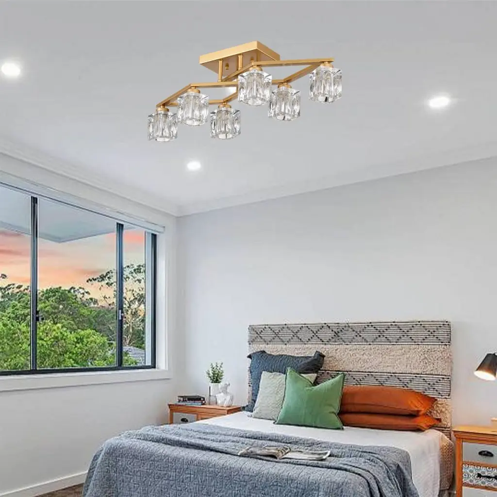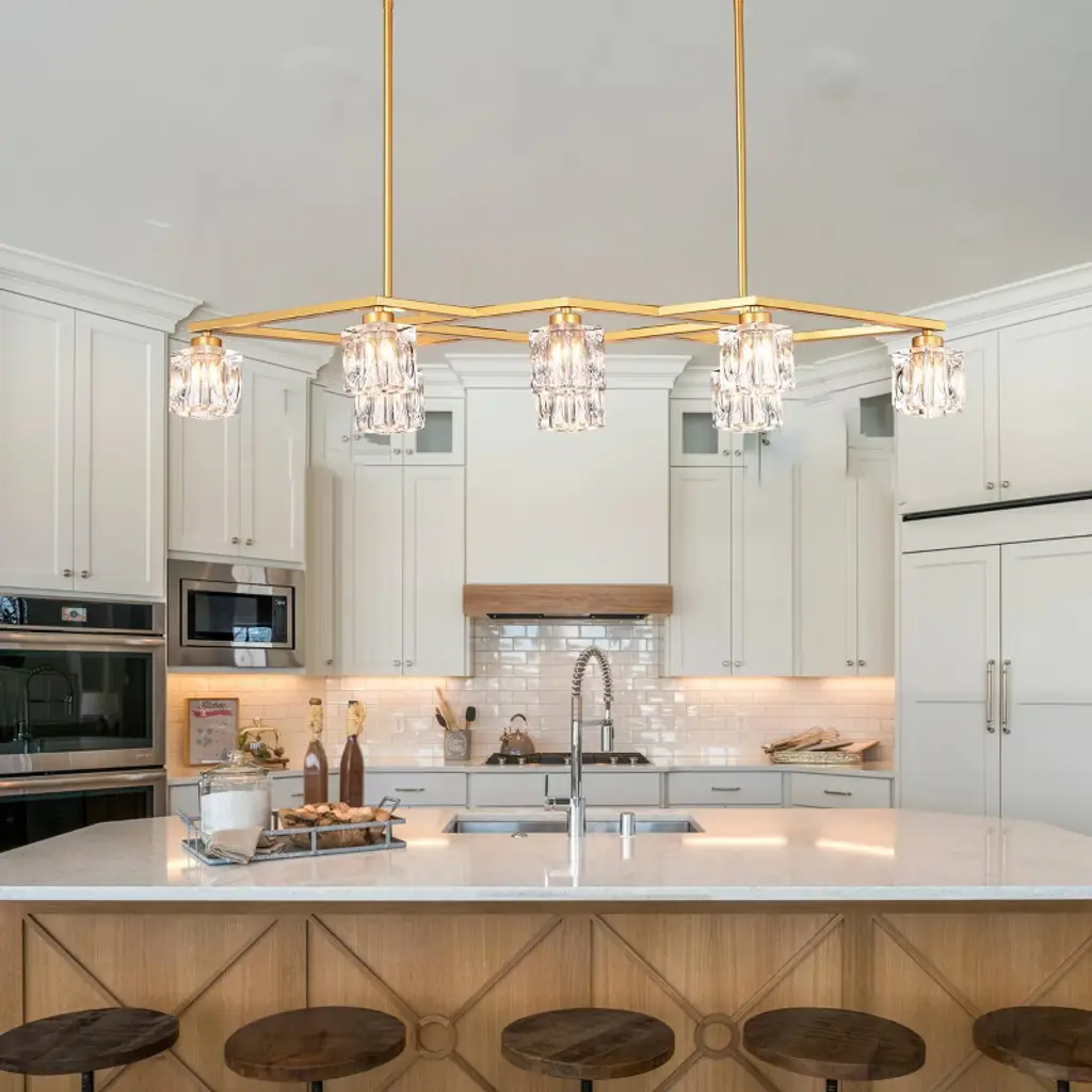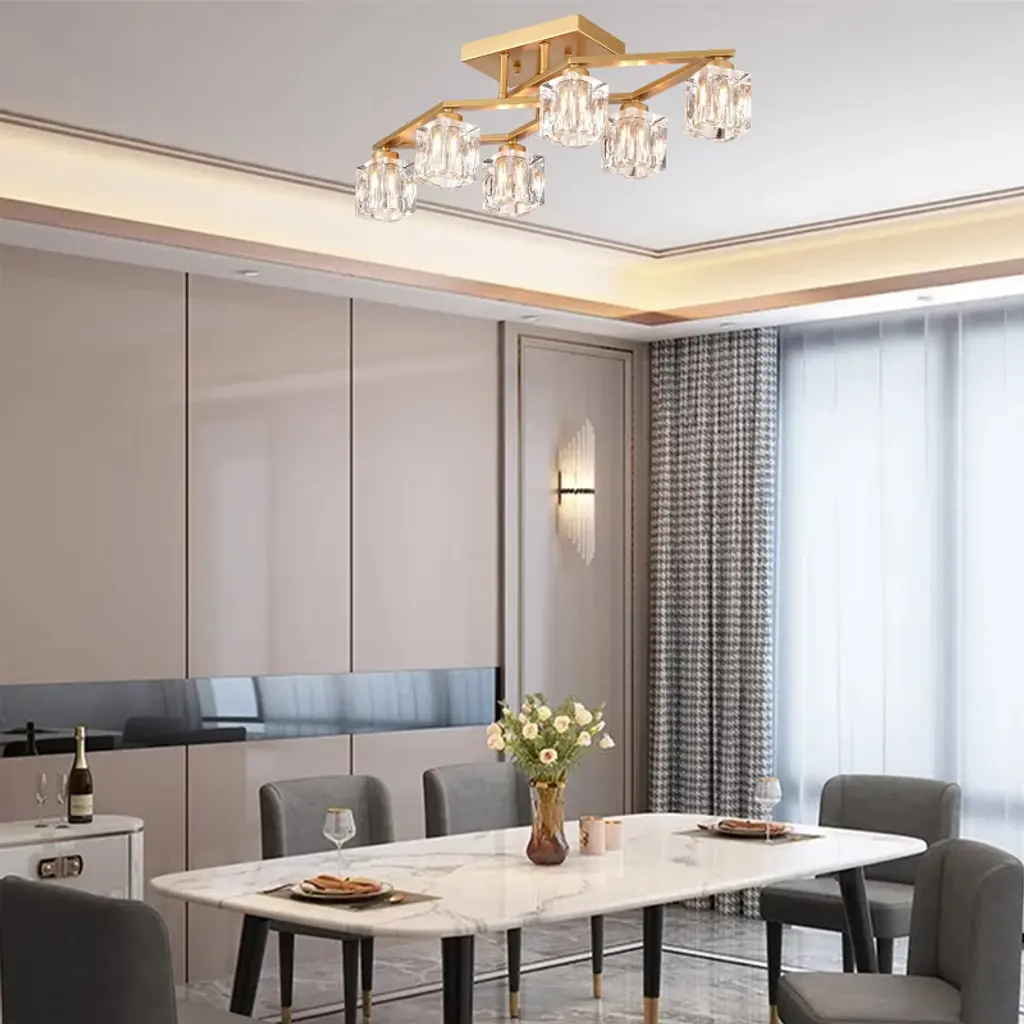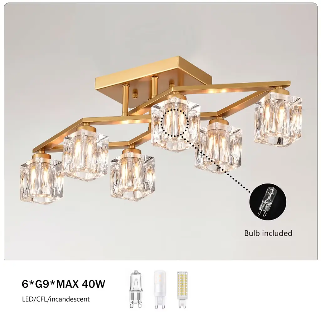 This stunning lantern-style fixture combines modern aesthetics with practical functionality. The matte black finish adds contemporary sophistication to any space, while the six-light design provides ample illumination. Its versatile style complements farmhouse, industrial, and modern decors alike.Technical Specifications:Style: Modern Farmhouse/IndustrialFinish: Gold MetalBulb Requirements: 6 x G9 Base (Bulbs Not Included)Max Wattage: 40W per bulb (240W total)Installation: Hardwired Ceiling MountCeiling Compatibility: Works with flat or sloped ceilingsIdeal For:Kitchen IslandsDining RoomsLiving RoomsEntryways/FoyersBedroomsOffice/Conference RoomsStairwellsPro Tip: For warm ambient lighting, use 2700K-3000K G9 LED bulbs. For brighter task lighting, opt for 4000K-5000K bulbs.