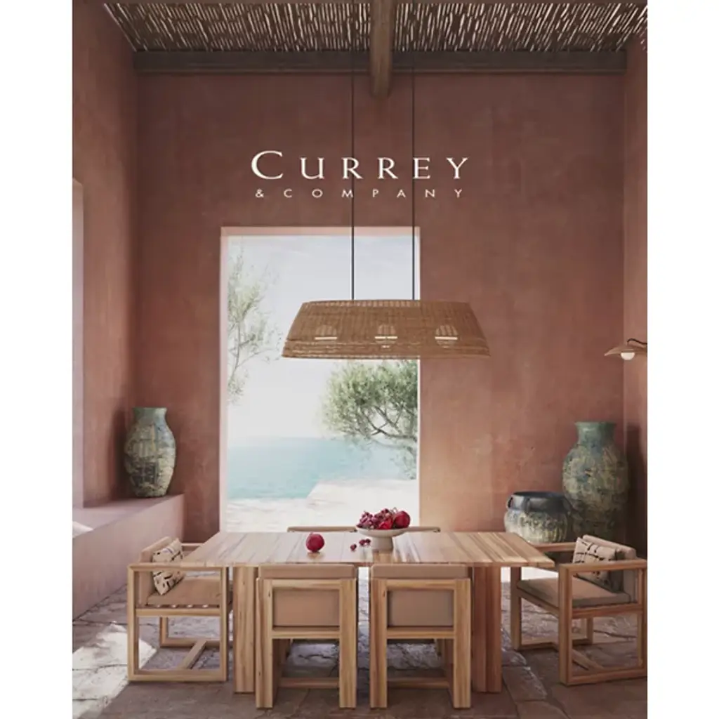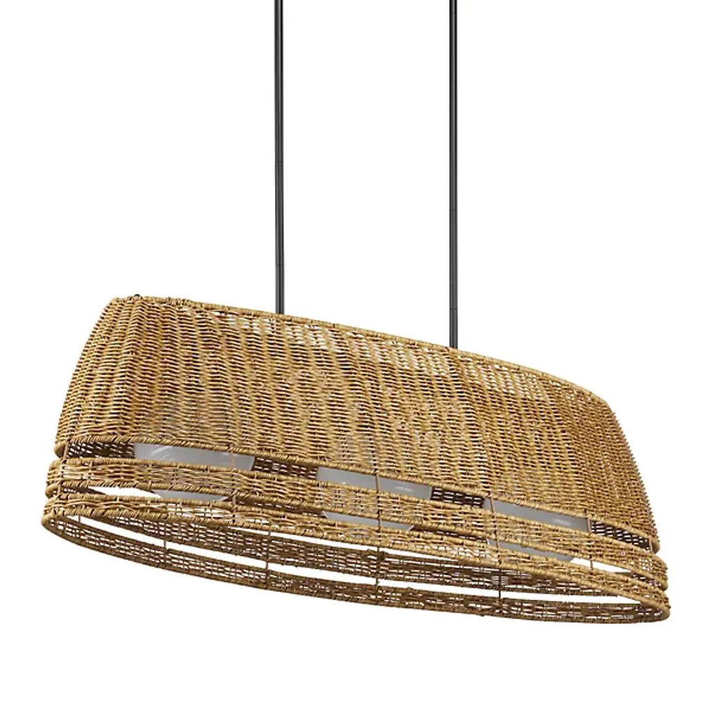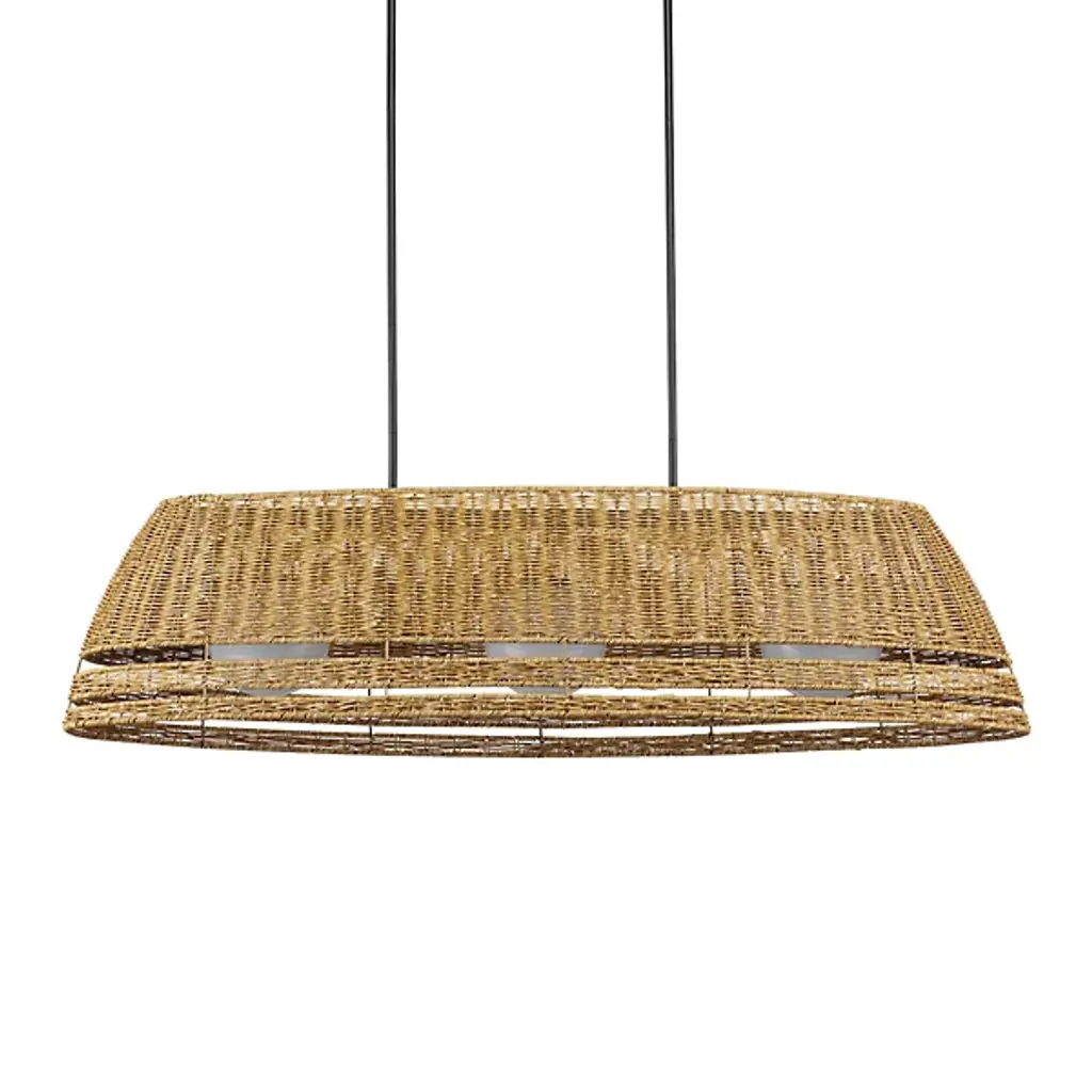 The Barbary Outdoor Linear Suspension from Currey & Company features an elongated boat-shaped design that brings artisanal appeal to outdoor dining areas. Handwoven synthetic wicker forms the inverted shade, while three milk glass globes provide illumination through circular openings. The tight weave demonstrates skilled craftsmanship and creates interesting shadows when lit. This dimmable three-light chandelier is wet-location tested for covered outdoor spaces. Height adjusts to accommodate various ceiling configurations, making it perfect for pergolas, covered terraces, or outdoor dining rooms where linear lighting enhances both function and aesthetic appeal.