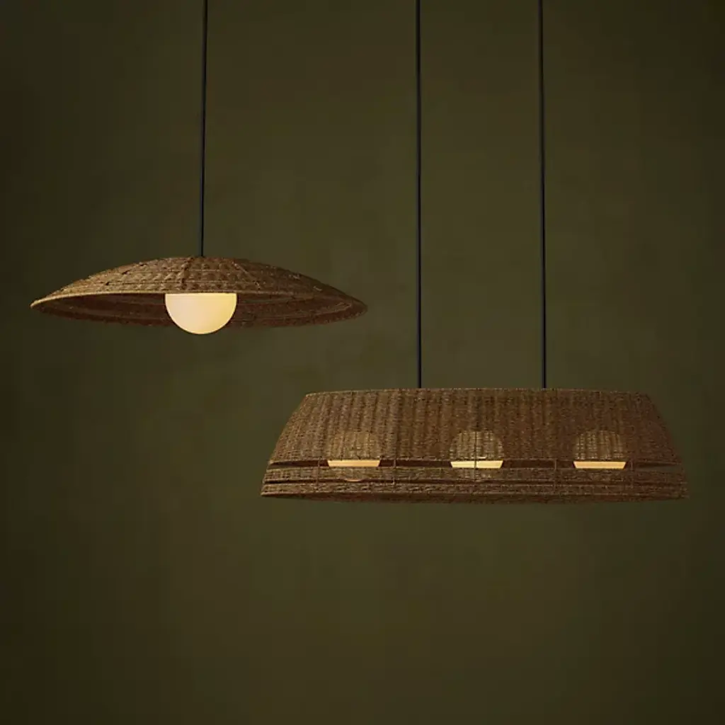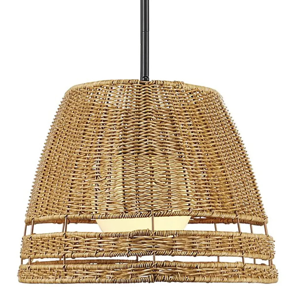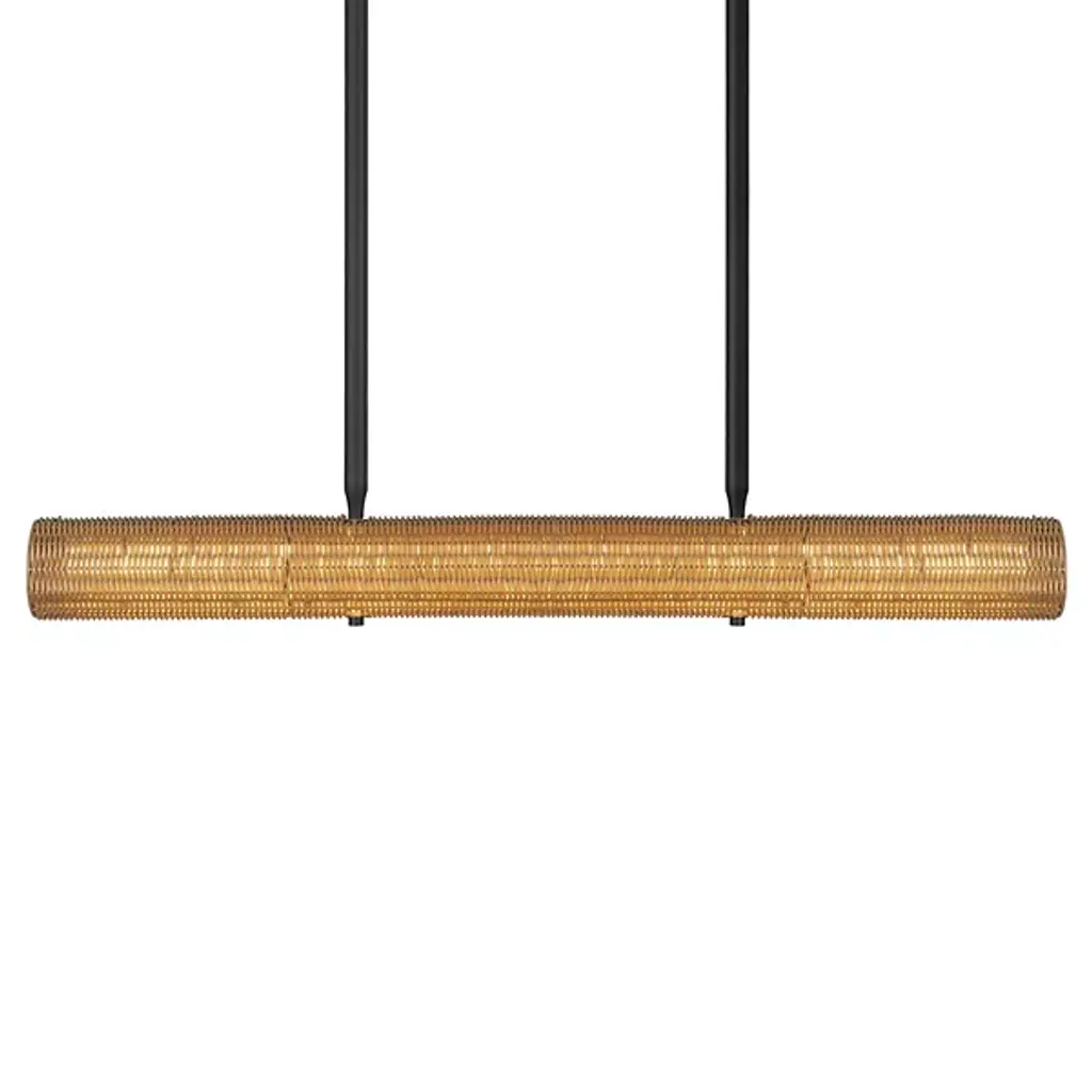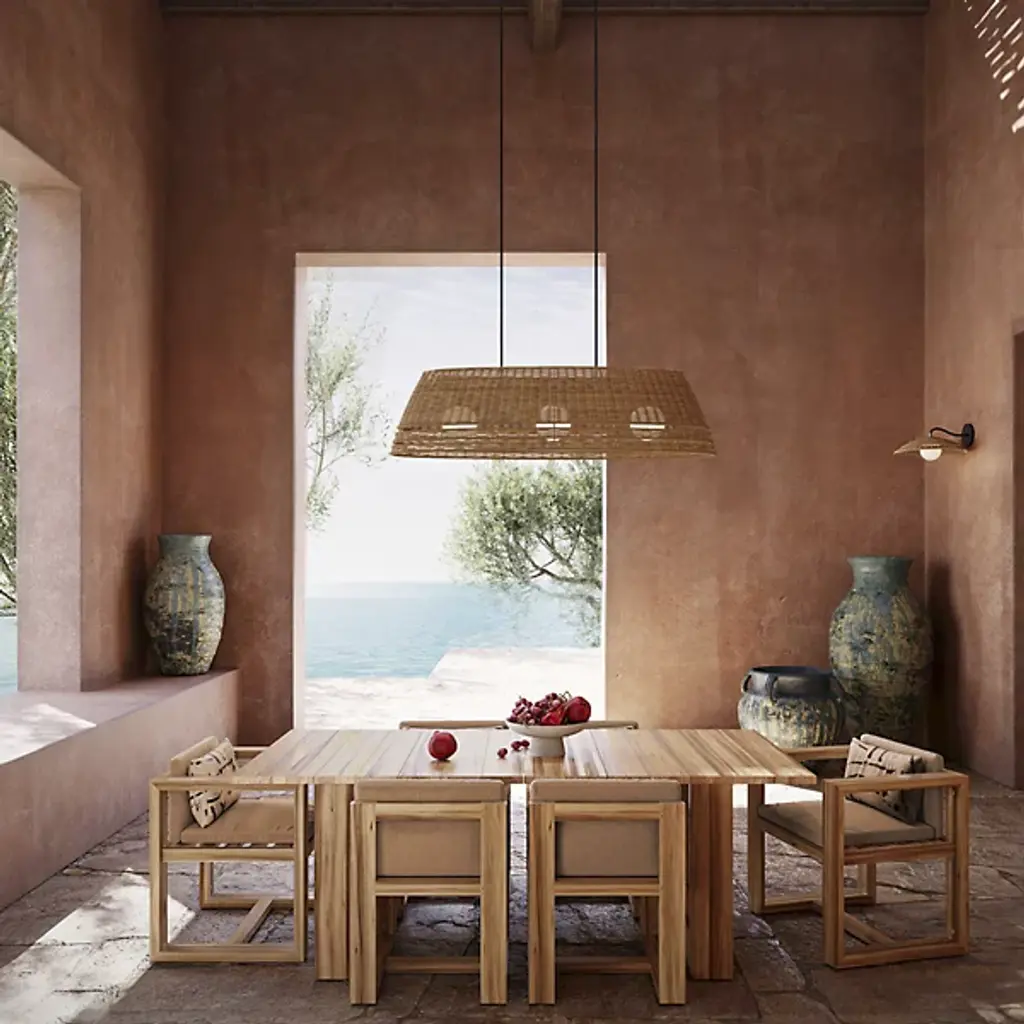 The Barbary Outdoor Linear Suspension from Currey & Company features an elongated boat-shaped design that brings artisanal appeal to outdoor dining areas. Handwoven synthetic wicker forms the inverted shade, while three milk glass globes provide illumination through circular openings. The tight weave demonstrates skilled craftsmanship and creates interesting shadows when lit. This dimmable three-light chandelier is wet-location tested for covered outdoor spaces. Height adjusts to accommodate various ceiling configurations, making it perfect for pergolas, covered terraces, or outdoor dining rooms where linear lighting enhances both function and aesthetic appeal.