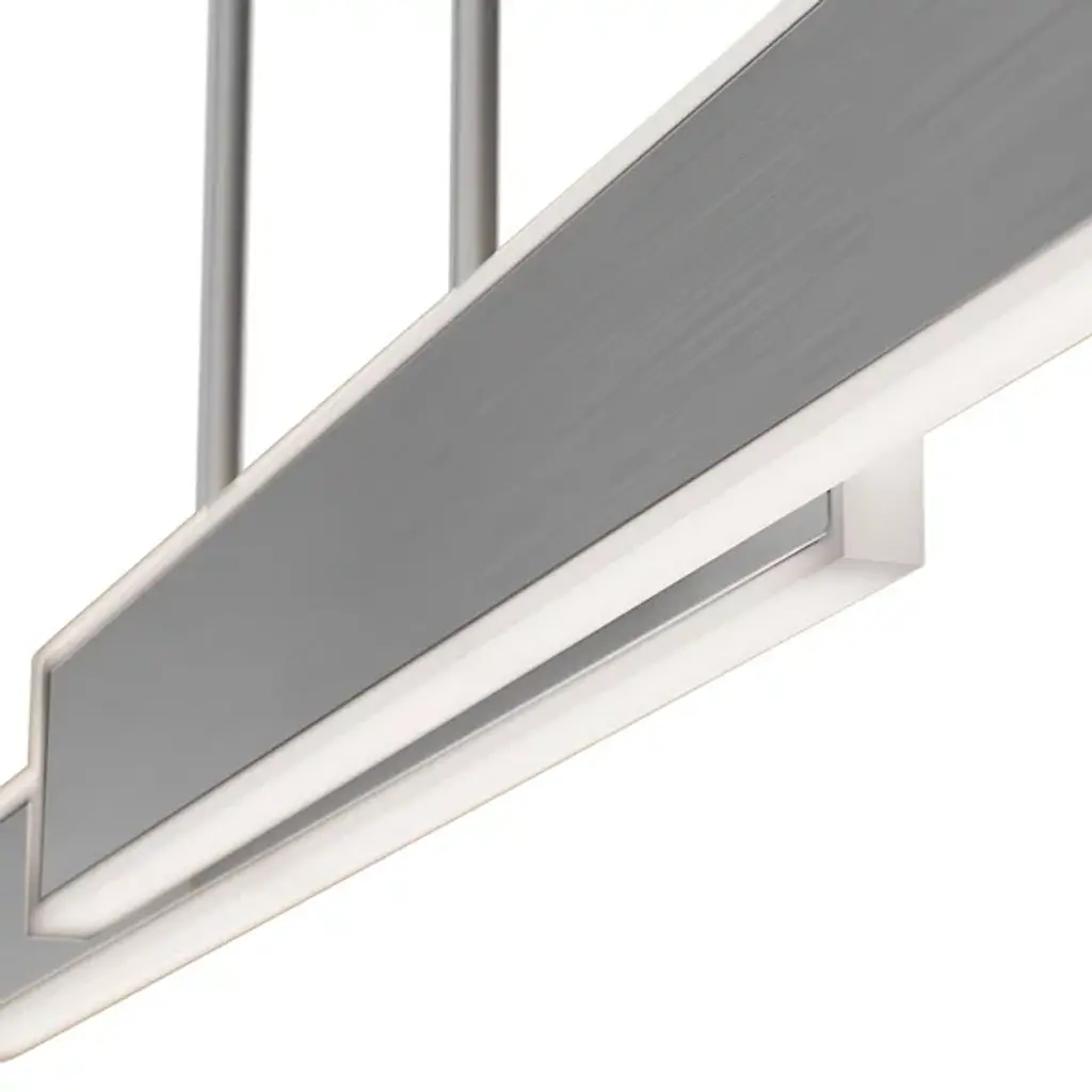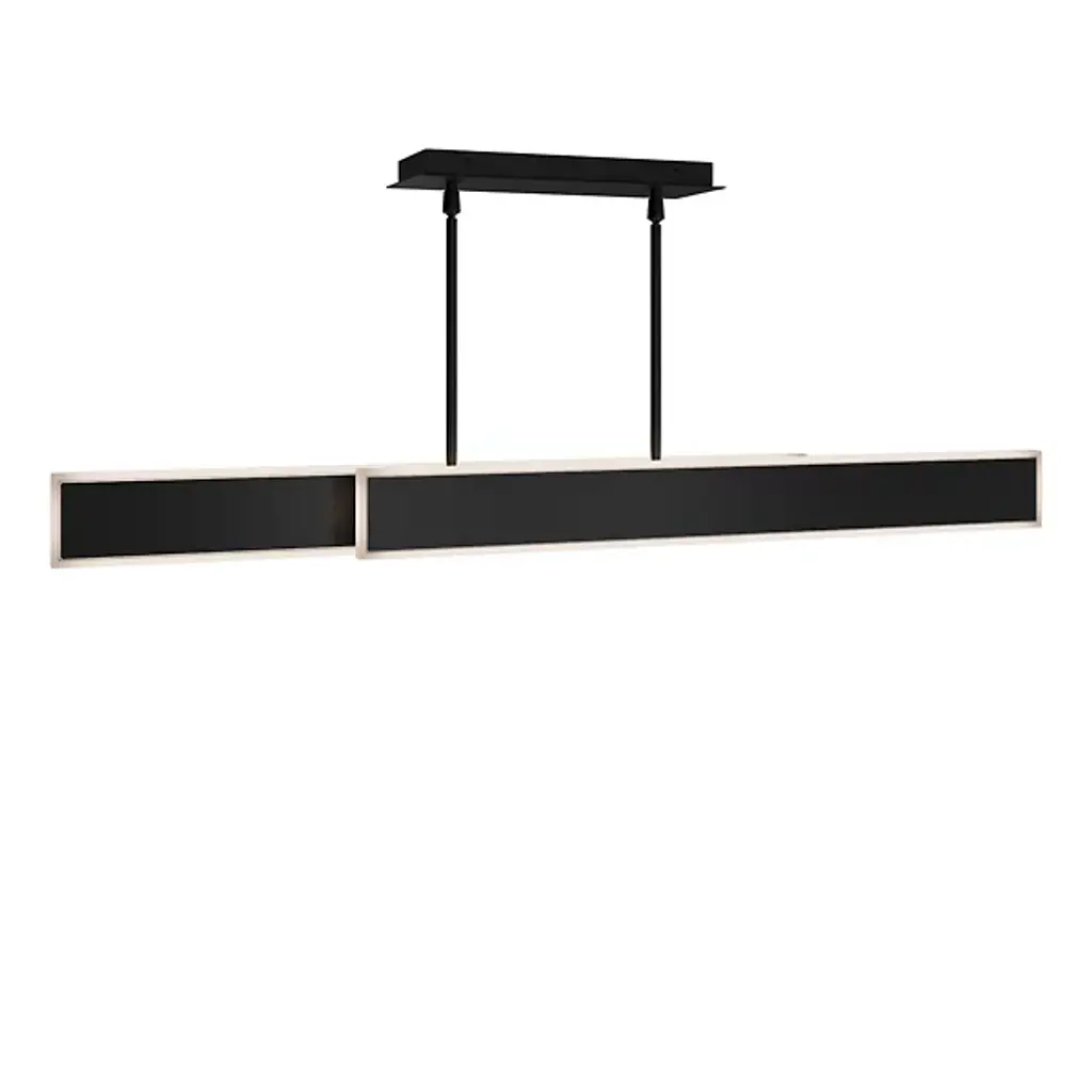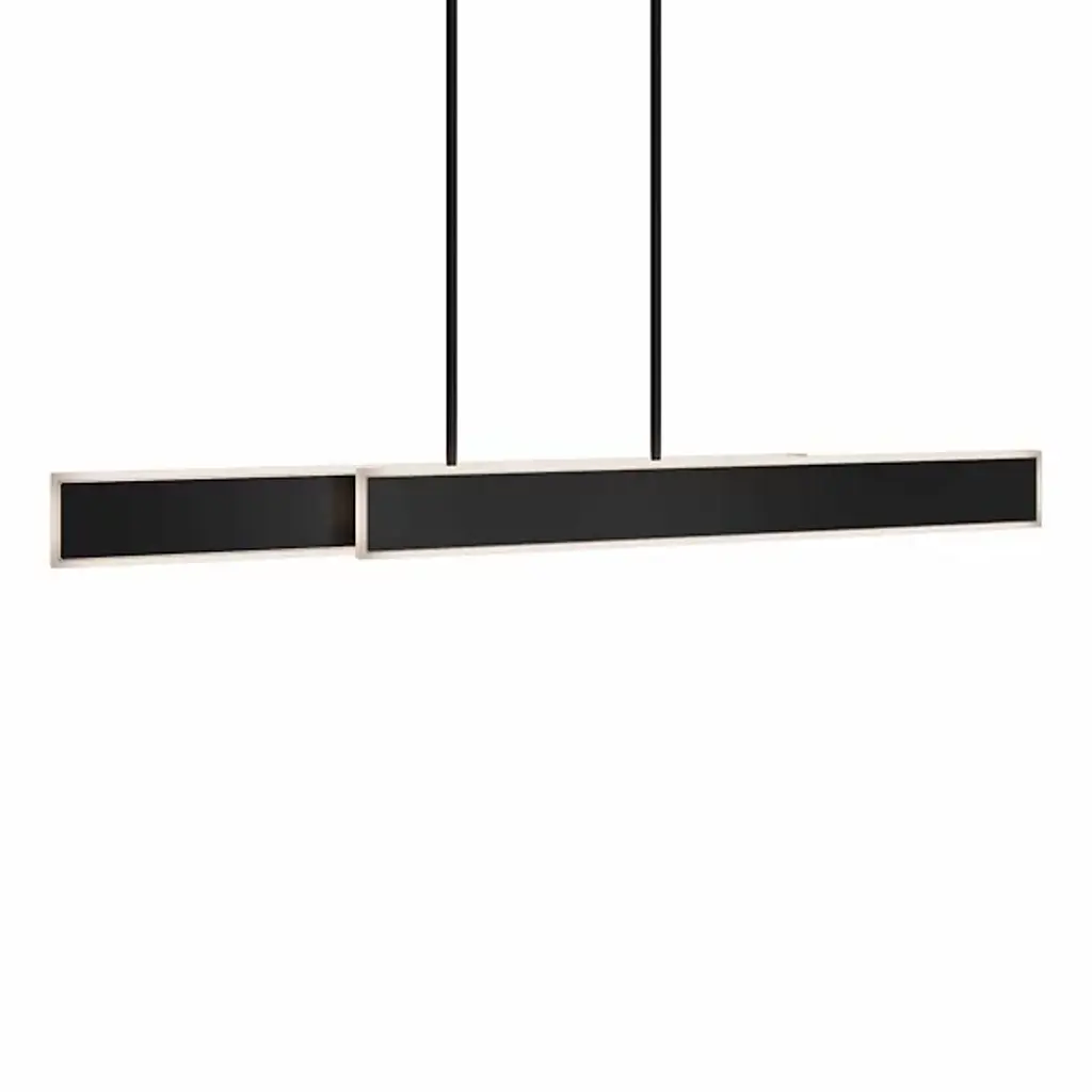 The Bastone LED Linear Suspension from dweLED consists of rectangular aluminum sections that slide apart to adjust the overall length. Two thin bars run parallel to each other, with LEDs embedded along their edges to provide both uplight and downlight. The sections can be positioned closer together or farther apart, depending on the dimensions of the table or counter below. Aluminum construction keeps the profile narrow, while the down rods connect the horizontal bars to the canopy, and the driver remains concealed above.