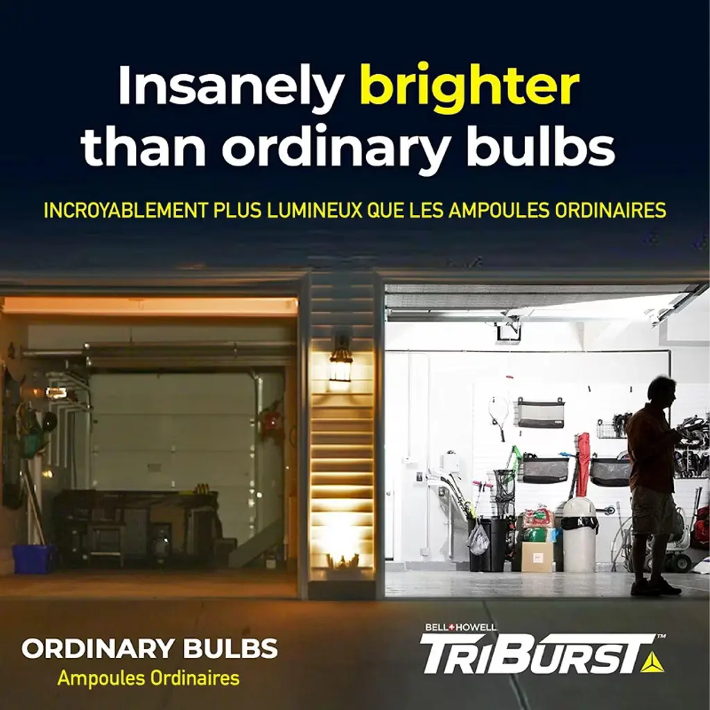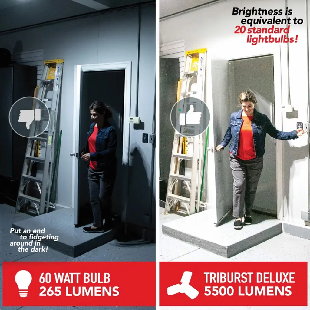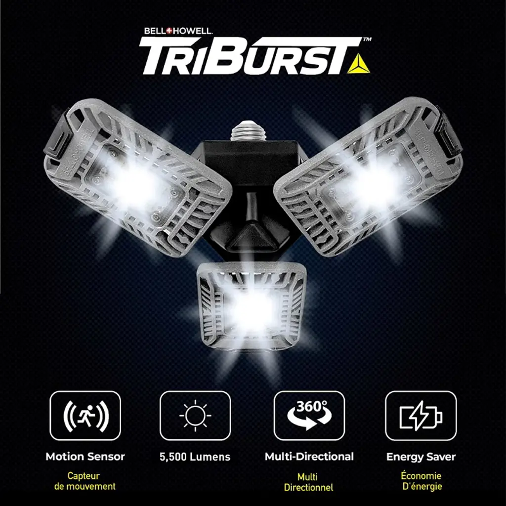 Light up your space instantly with the Bell + Howell Triburst Active Deluxe Motion Sensor LED Light. This ultra-bright 5500 lumen ceiling light installs just like a standard bulb but delivers powerful illumination across garages, workshops, basements, closets, attics, and more. Designed with three adjustable aluminum LED panels and a 360° radar motion sensor that detects movement up to 26 feet, it turns on when needed and shuts off automatically after 30 seconds. Perfect for hands-free operation in utility spaces, this energy-efficient LED shop light combines motion-activated convenience with serious brightness, offering an easy lighting upgrade with zero tools required.