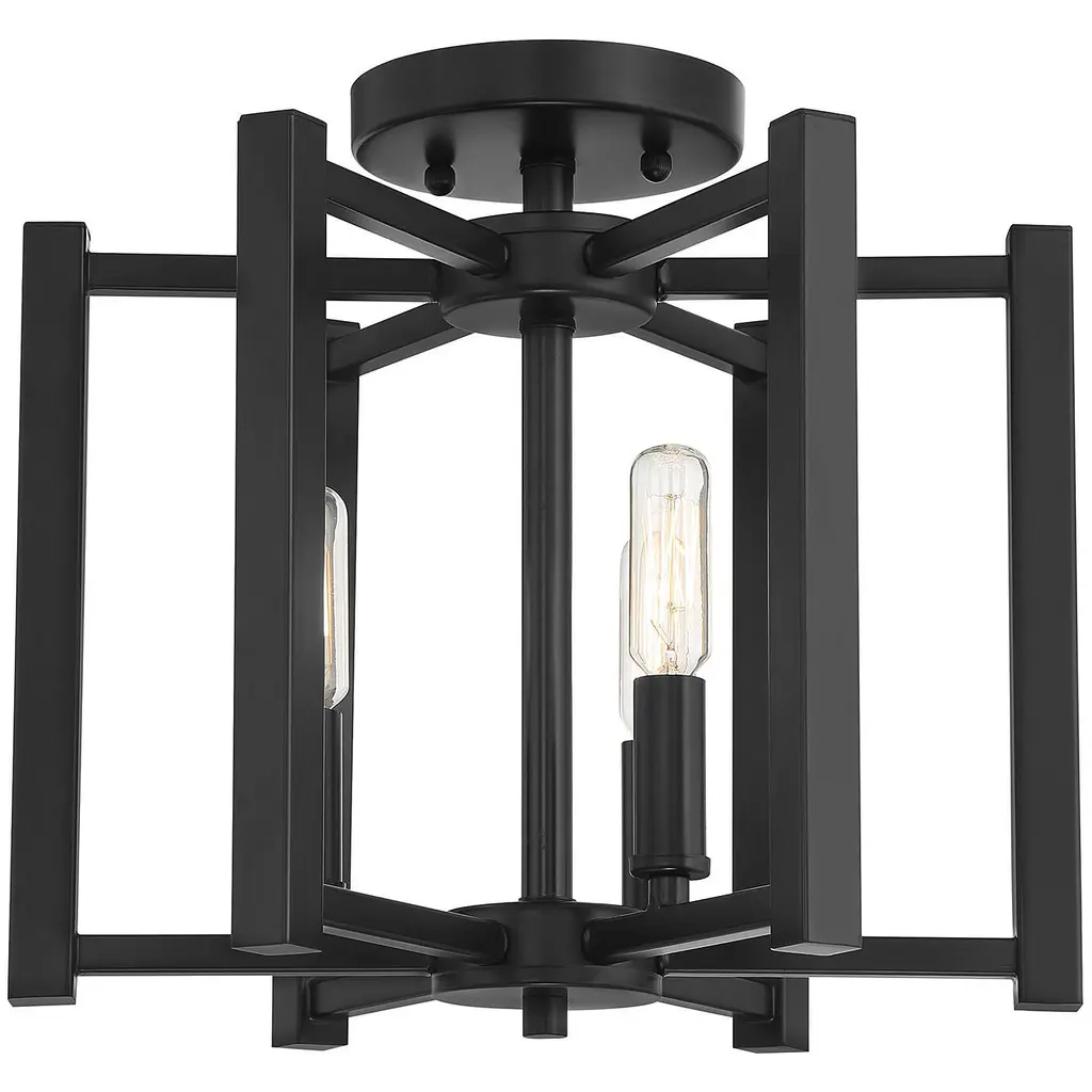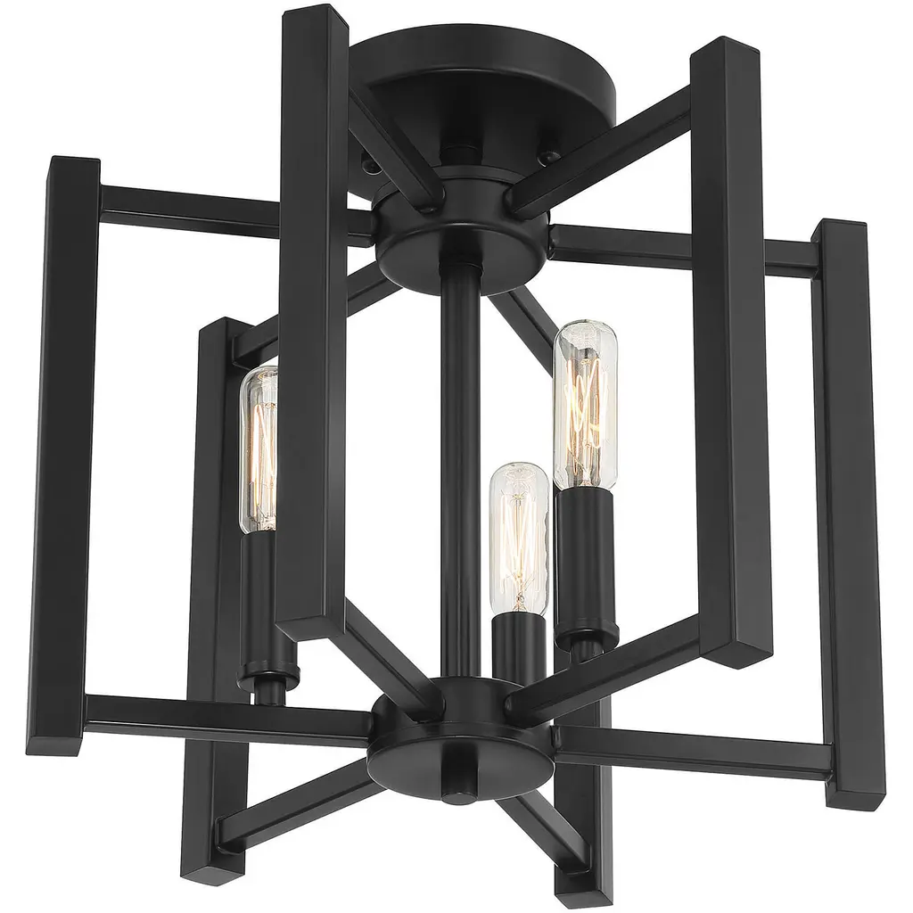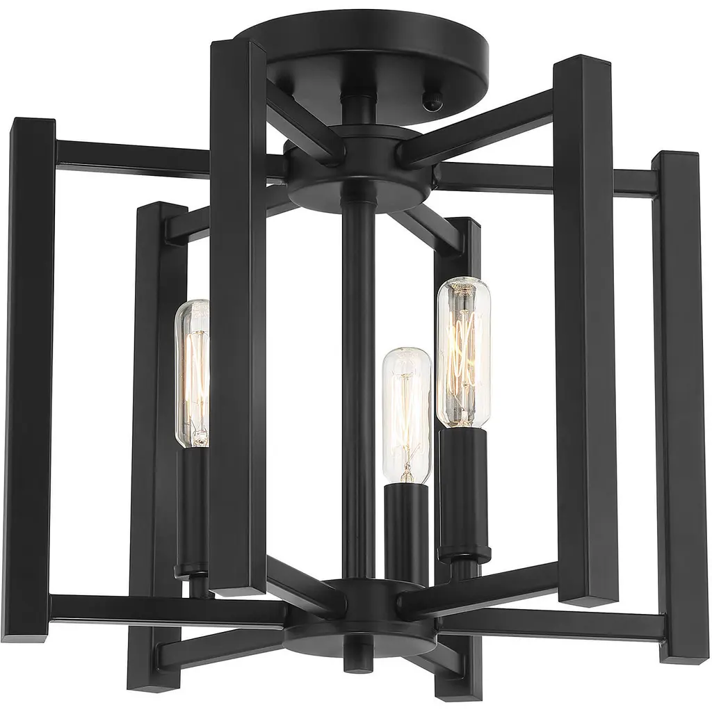 A simple cage with modern flair defines the Benson collection. This universally flattering three-light semi-flush mount in a matte black finish measures 12" high x 13" wide. It provides ample illumination from three 60-watt candelabra bulbs.