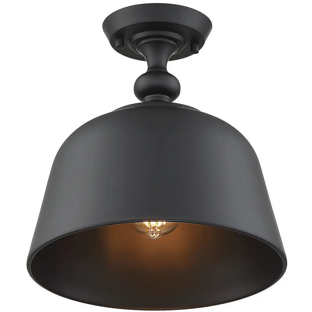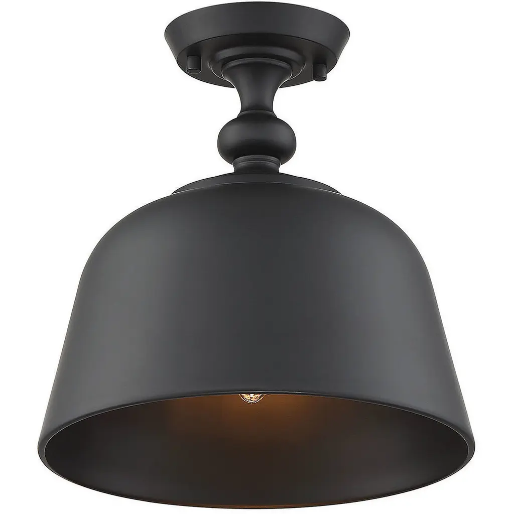 From Savoy House, this Berg 1-light ceiling semi-flush mount is a perfect blend of industrial style and traditional allure. It showcases an oversized metal shade that is finished in matte black, both inside and out, for a bright and focused glow. Above the shade, hardware details recall the curves of an elegant candlestick. Berg is perfect for times when you would like a more directed beam of light, such as in a small entryway or a kitchen. This fixture is 12" in width and 12" in height. Uses one standard size light bulb of up to 60 watts (not included).