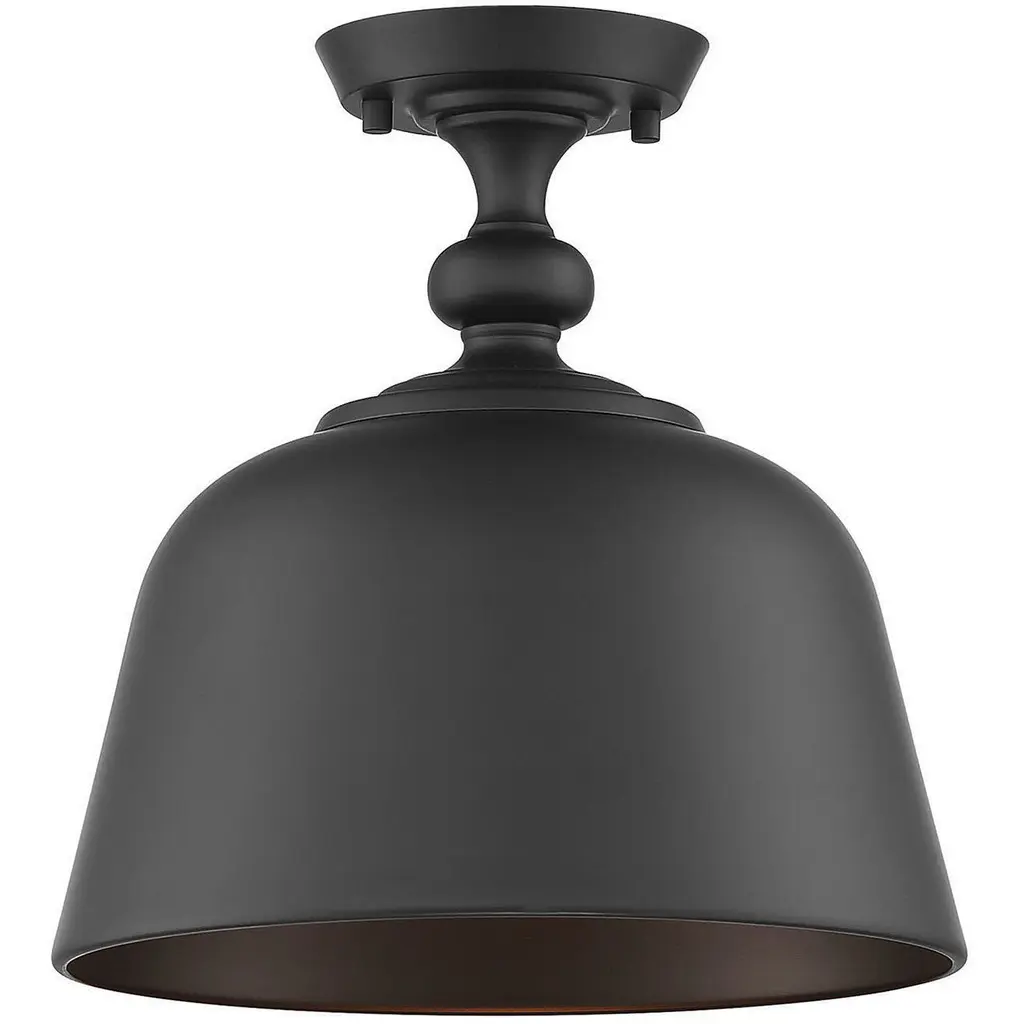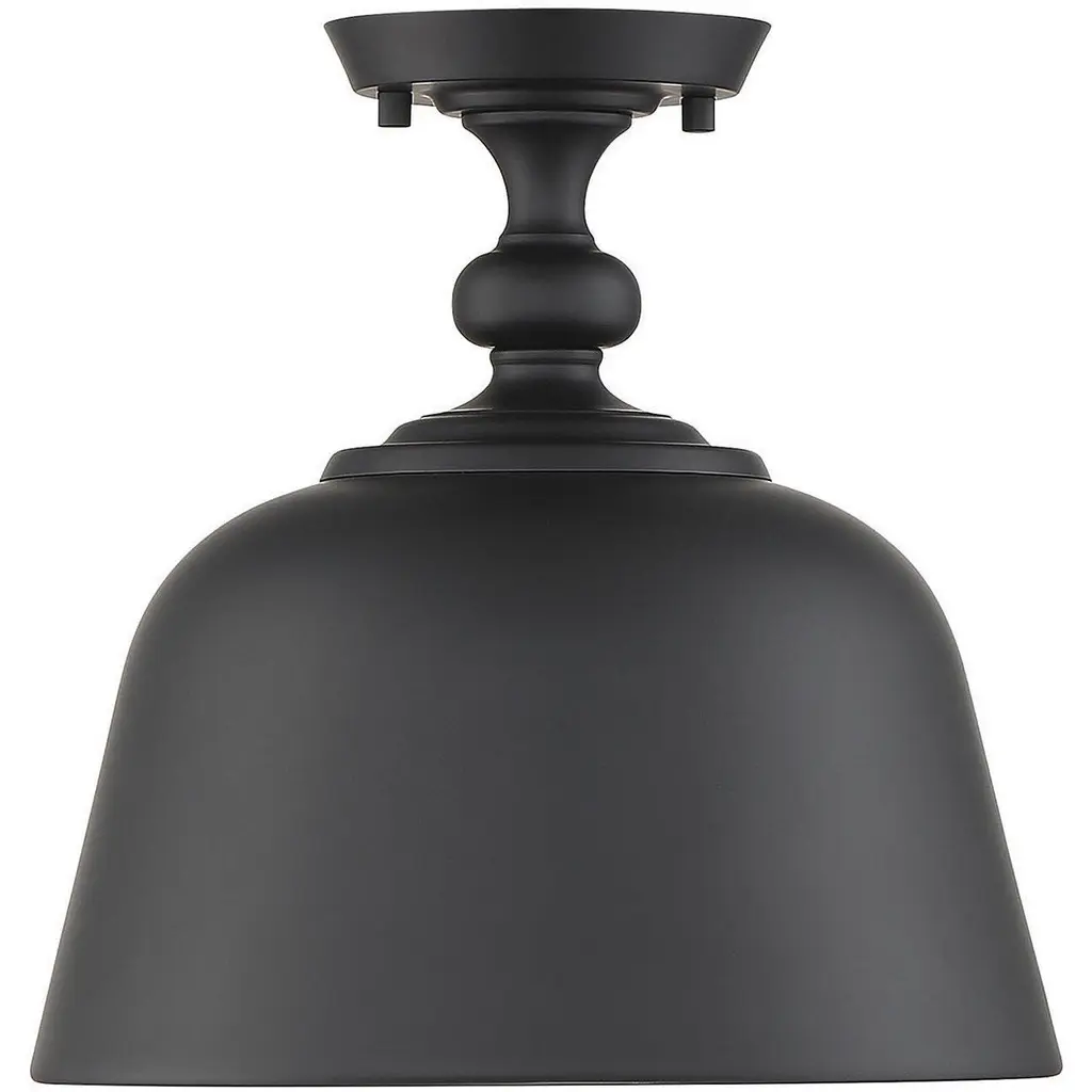 From Savoy House, this Berg 1-light ceiling semi-flush mount is a perfect blend of industrial style and traditional allure. It showcases an oversized metal shade that is finished in matte black, both inside and out, for a bright and focused glow. Above the shade, hardware details recall the curves of an elegant candlestick. Berg is perfect for times when you would like a more directed beam of light, such as in a small entryway or a kitchen. This fixture is 12" in width and 12" in height. Uses one standard size light bulb of up to 60 watts (not included).