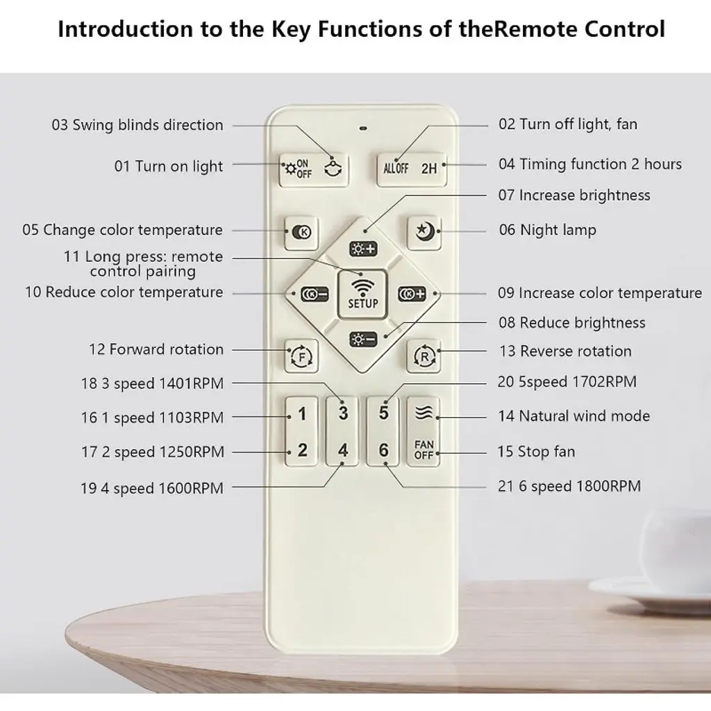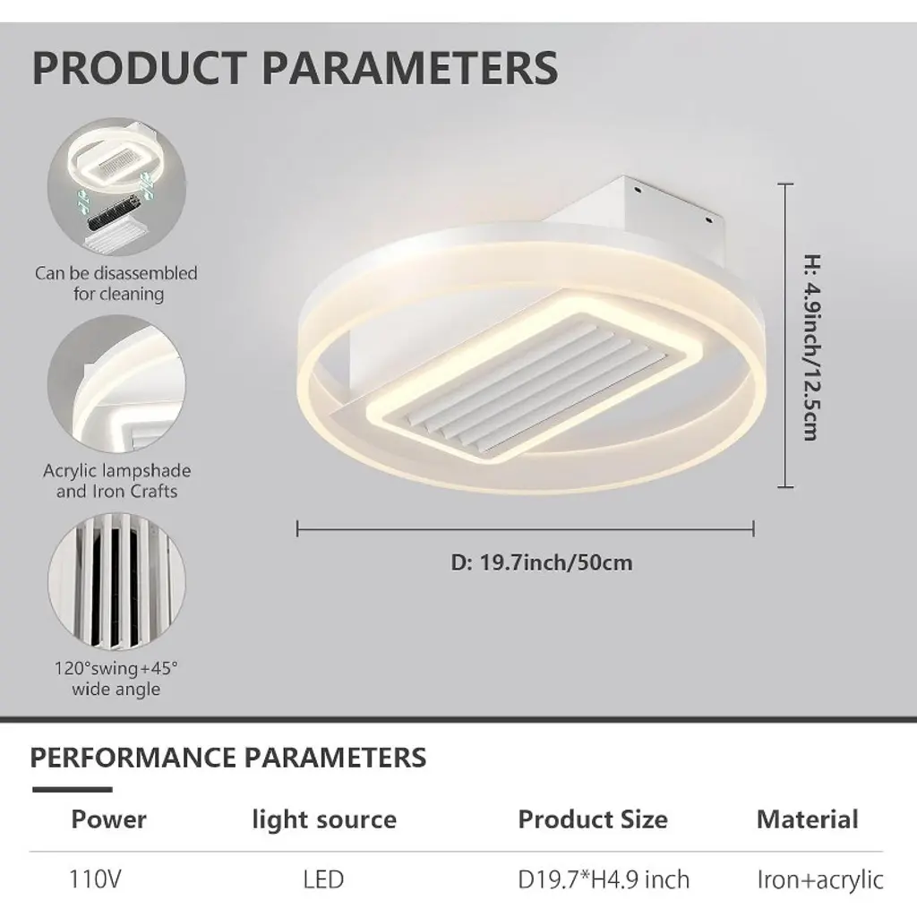 Product FeatureModern style fan cools down your room.Forward/reverse 6-speed fan control (if you want to reverse, please adjust the AC motor manually.Fan or lighting can be turned on individually.This ceiling fan is perfect for your kitchen, dining room, living room, bedroom and indoor spaces.Product InformationColor: WhiteMaterial: IronStyle: ModernLight fixture form: CeilingProduct Dimensions: 19.7"L x 19.7"W x 4.9"HItem Weight: 12.13 PoundsPower Source: Corded ElectricIncluded Components: Remote ControlPackage List1 x Bladeless Fan Lamp1 x User Manual