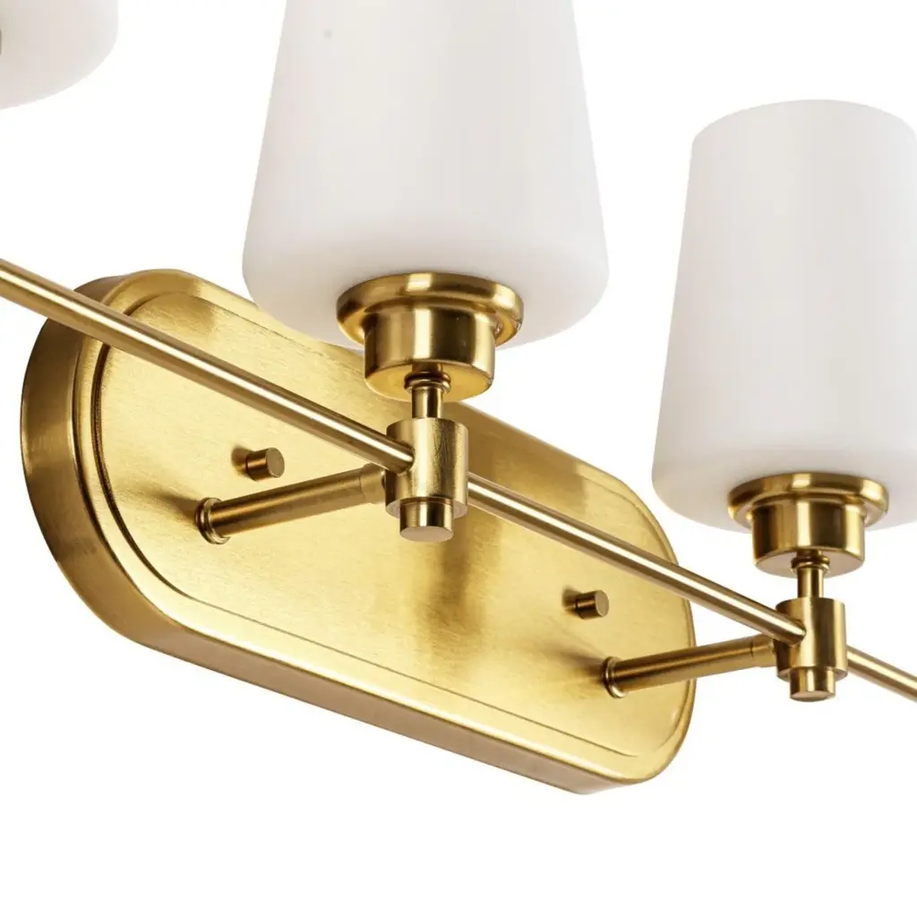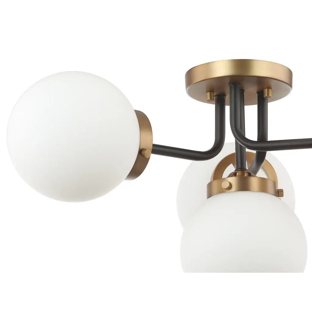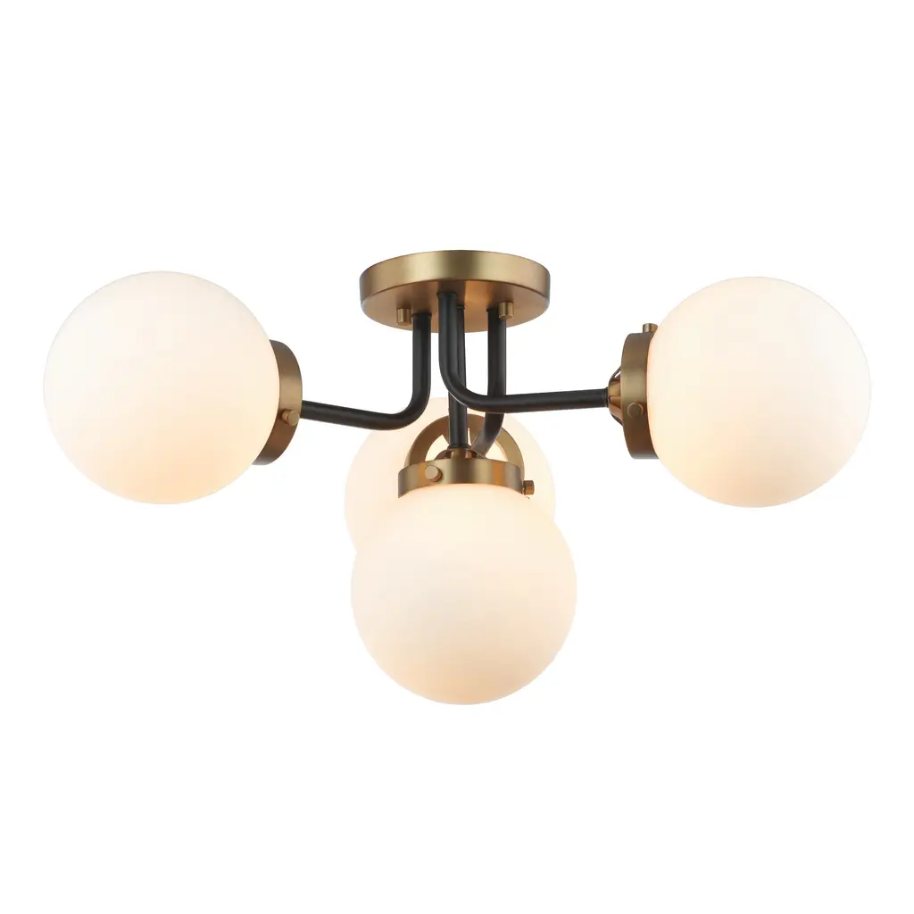 Add bright eye-catching lighting to your space with this mid-century modern 4 light semi flush ceiling light. This simple circular, retro-style lighting fixture uses a mix of antique brass and matte black finishes and a linear design for a transitional and modern appeal to your space. The frosted bubble glass shades are installed using the traditional glass screws for that classic finishing detail.Features: