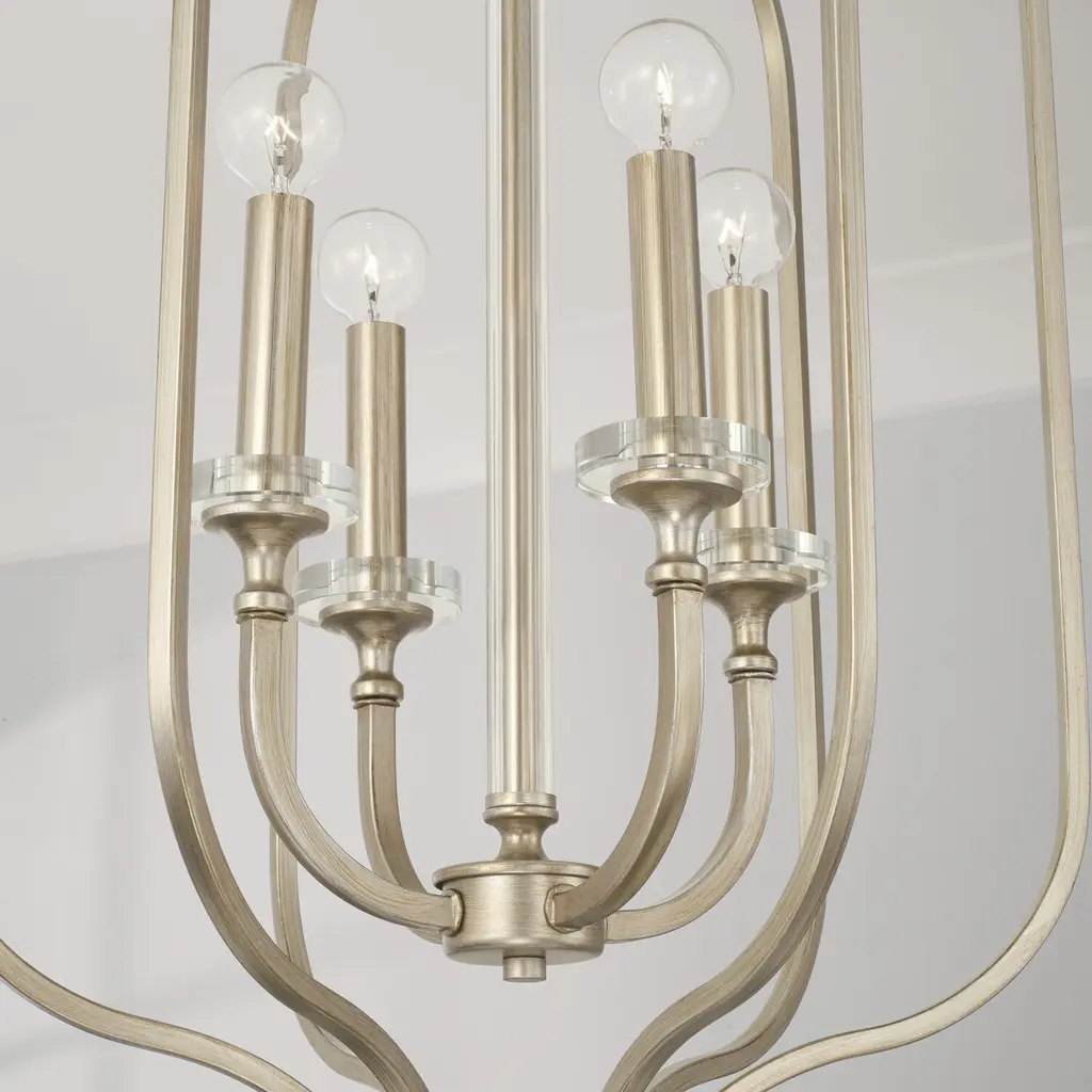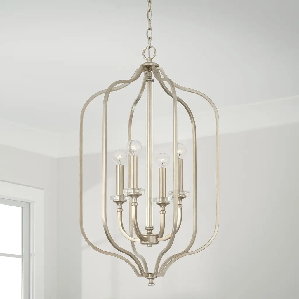 The soft curves of the Breigh Foyer put a romantic twist on the lantern silhouette. The Brushed Champagne finish adds a subtle texture and glistens off the acrylic accents for a style with understated glamour.