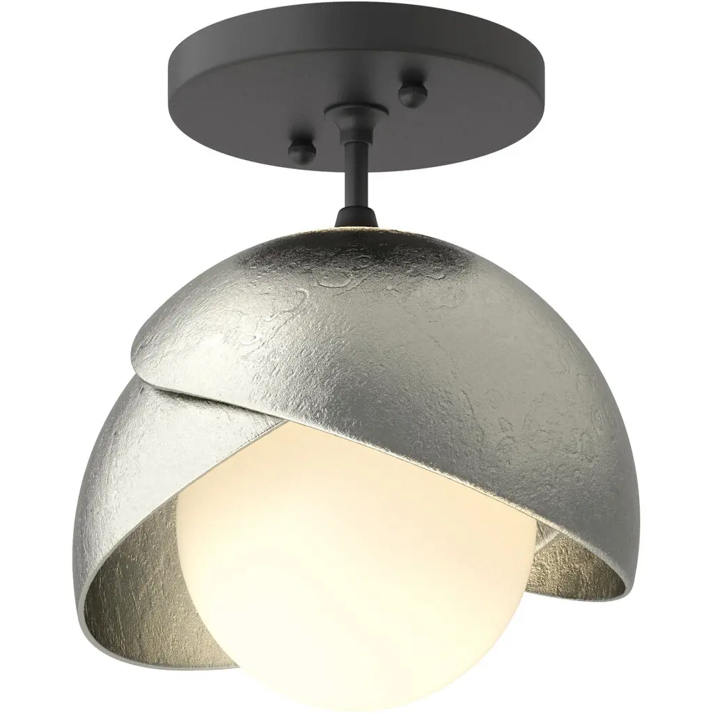 The Brooklyn Double Shade Semi-Flush brings a bit of whimsy to its space. Some see it as "botanical" with cupping leaves, others see it as a bit of a "wink", the Brooklyn lights up its space. With the option of a two-toned finish, with a choice of accent color for one of the forged and textured shades, this ceiling fixture offers functional yet stylish light. Available in all standard finishes.