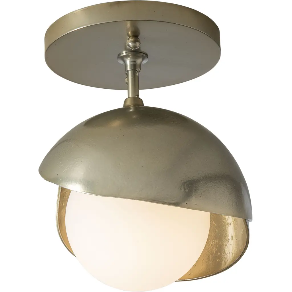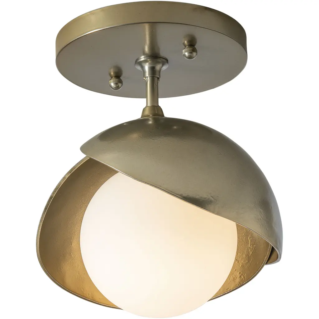 The Brooklyn Double Shade Semi-Flush brings a bit of whimsy to its space. Some see it as "botanical" with cupping leaves, others see it as a bit of a "wink", the Brooklyn lights up its space. With the option of a two-toned finish, with a choice of accent color for one of the forged and textured shades, this ceiling fixture offers functional yet stylish light. Available in all standard finishes.