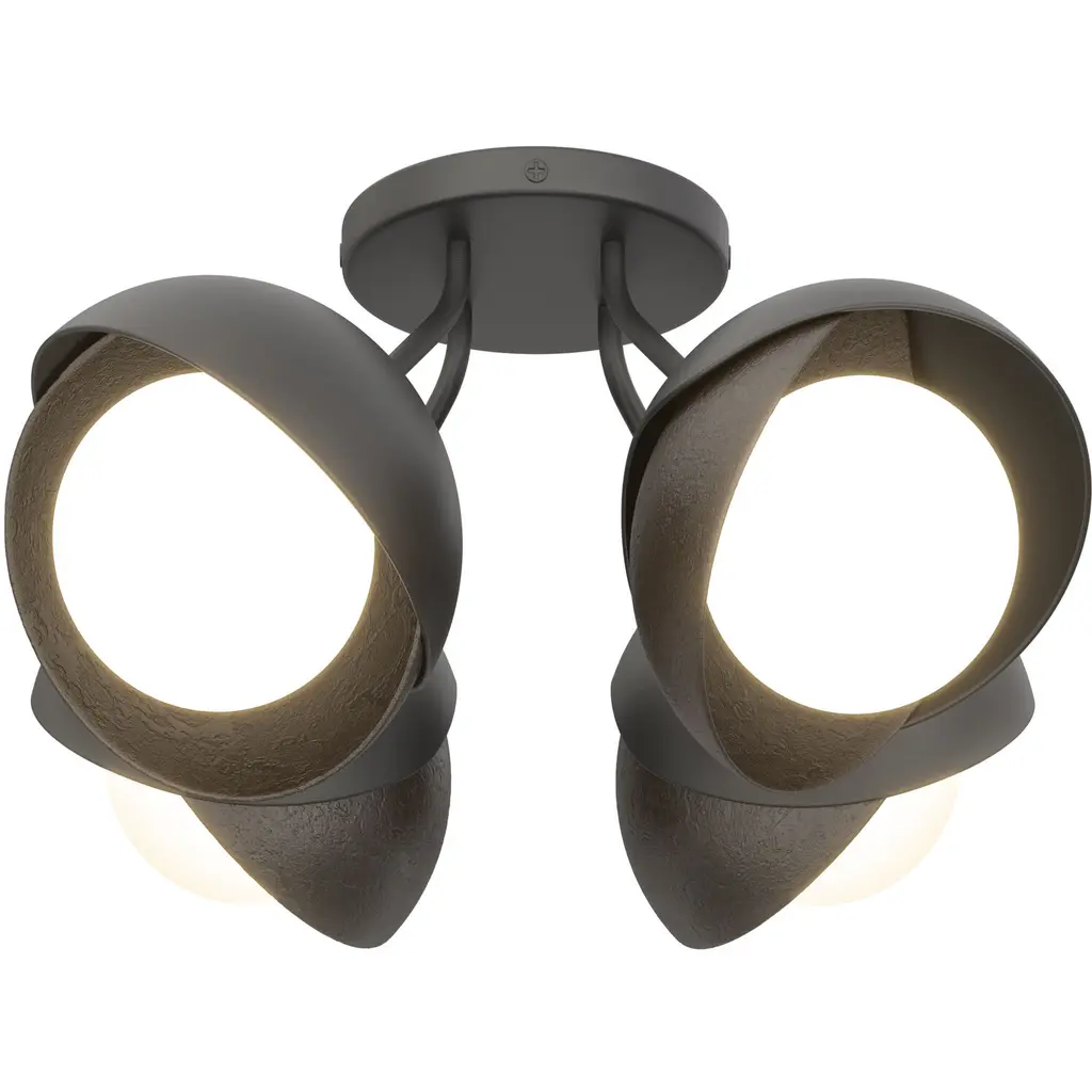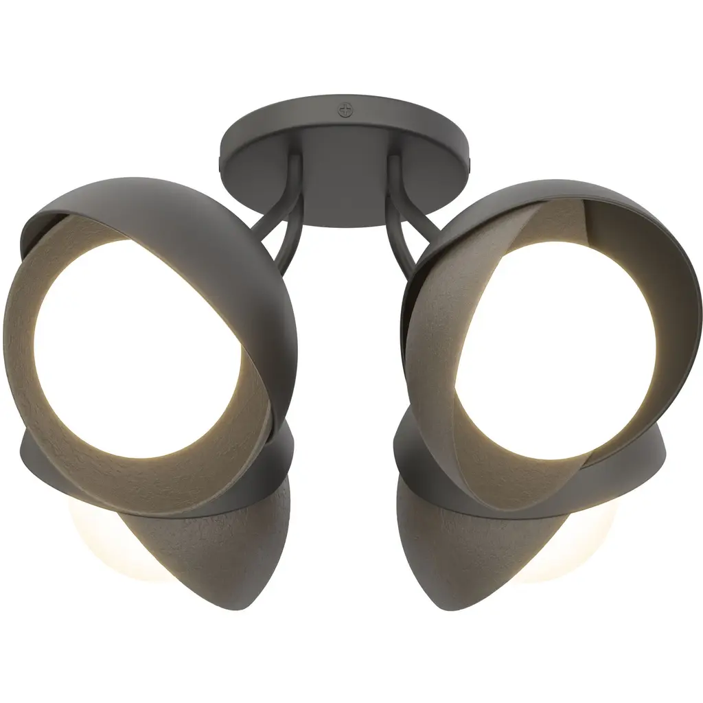 Each of this Brooklyn Double Shade Semi-Flush's four glass globes are shrouded by two hand-forged shades, each hammered from a flat plate of steel. Steel arms are angled out from the canopy, giving a broad range of illumination from a seemingly small cluster of lights. This ceiling fixture is available as a two-tone finish, with forged and textured shades that may be in different colors for dramatic effect. Available in all standard finishes.