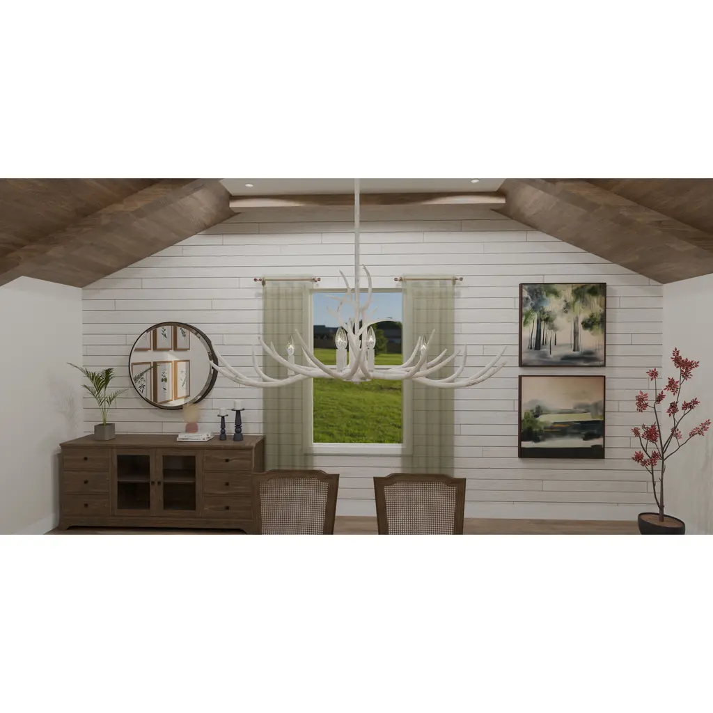 Inspired by nature, the Brosh chandelier pairs traditional lighting design with rustic style elements. Faux antlers make up the linear silhouette, finished in antique white for a cozy cabin feel. Hang Brosh over any kitchen island, small table, or any living space where you want to add a touch of rugged style.