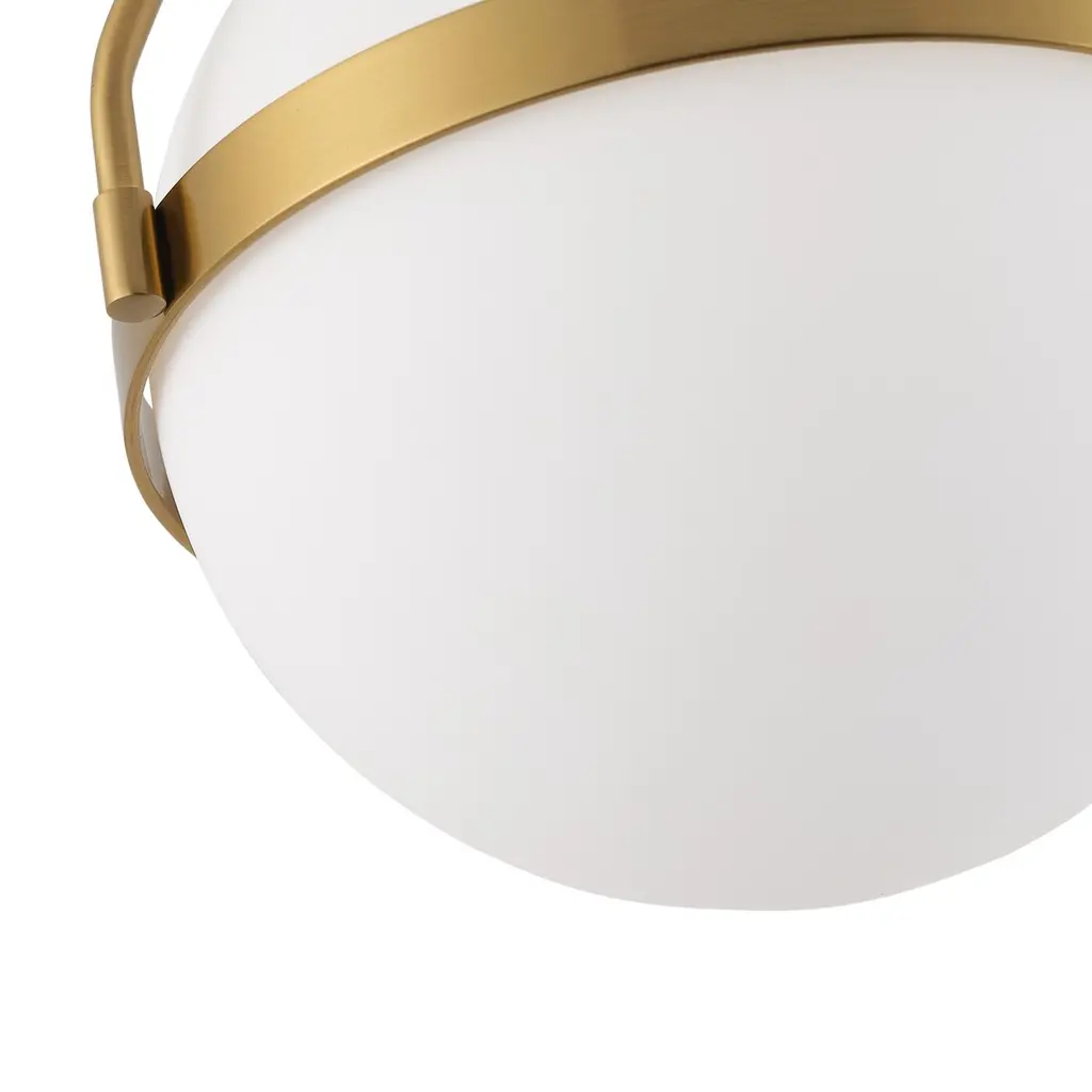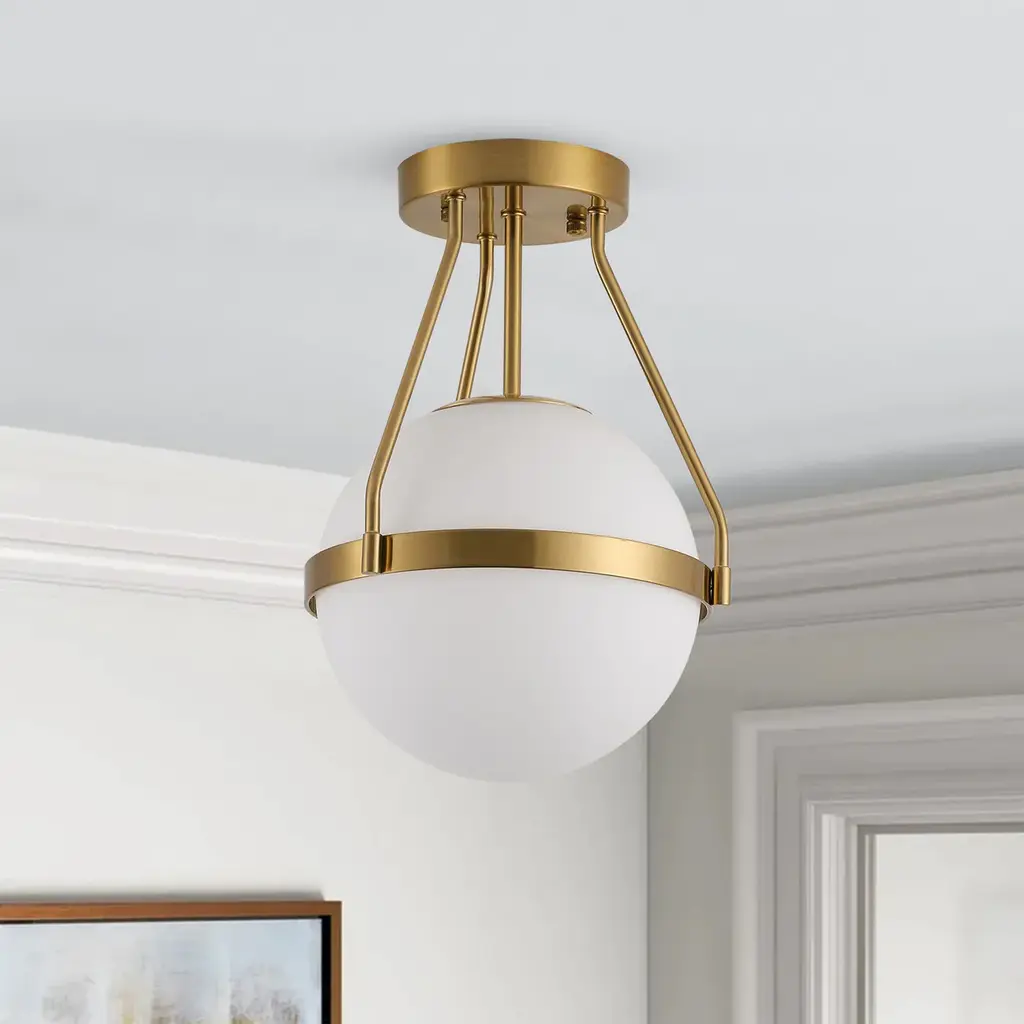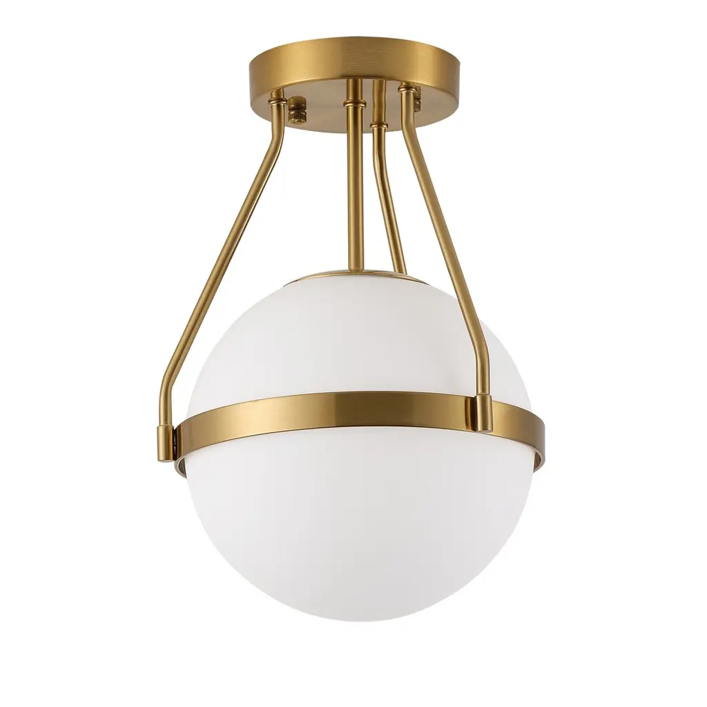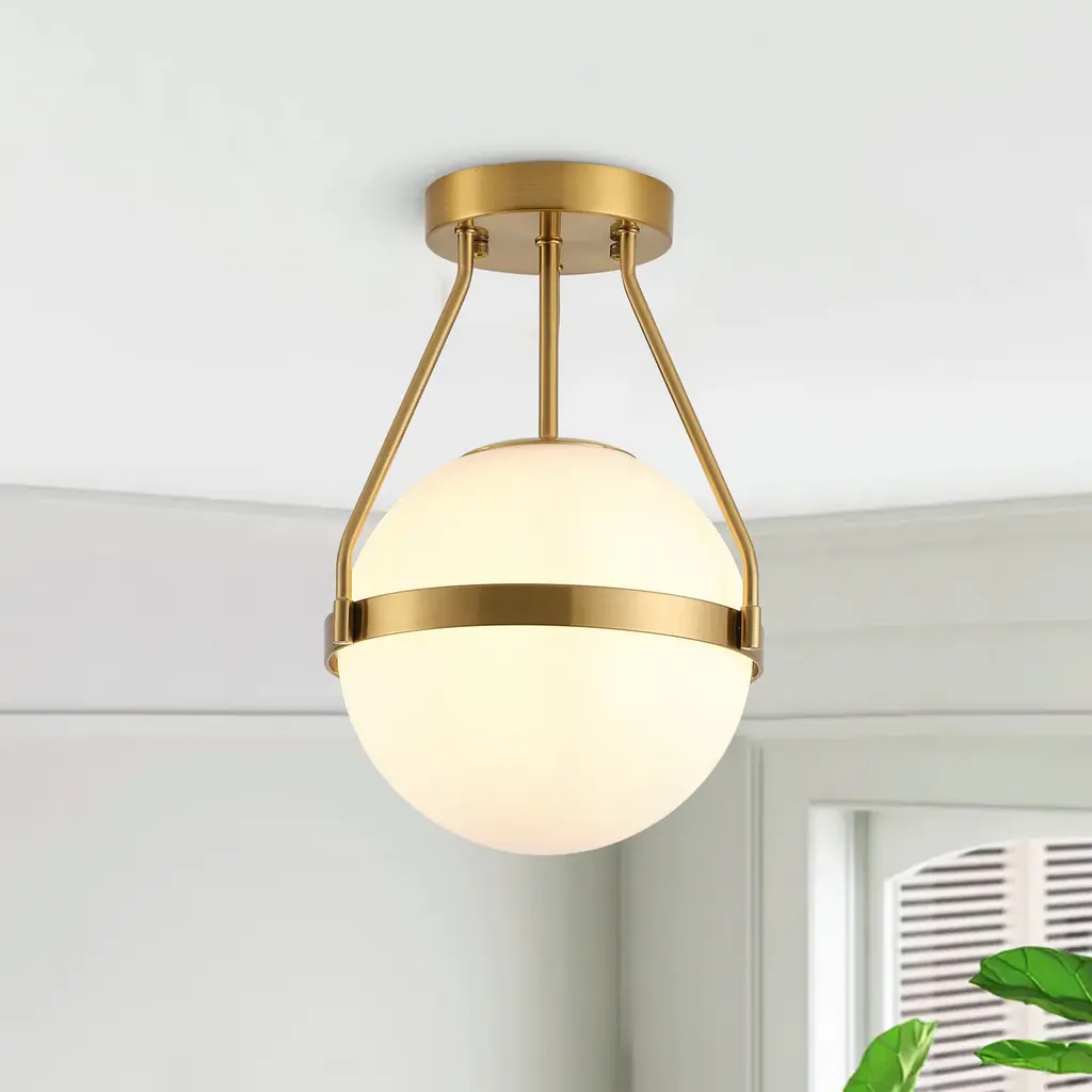Brushed Brass 1-Light Semi Flush Mount Ceiling Light With White Globe Glass Shade - Brass