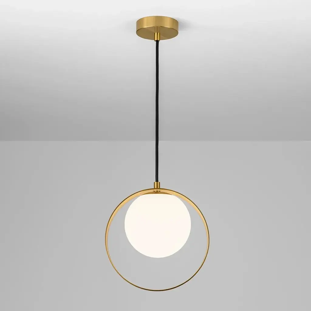 A Decorative Guestroom Or Public Area Ceiling Fitting Which Features A Warmly Lit Matt Opal Globe Set Asymmetrically Within A Brass Ring.