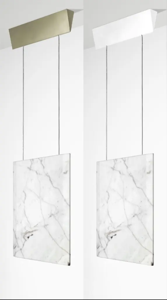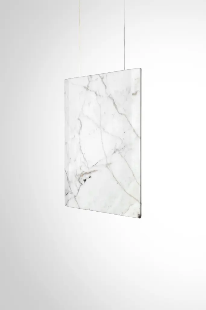 I know, it's a strange title "Marble Lamp"But, I wanted it strongly,I dreamed of being able to see a piece of marble, suspended like a sculpture, and that it could secretly illuminate my work area.It wasn't easy, hiding so much light inside,to be released both above and below.Even bringing the marble to less than a centimeter/a inch was not easy,but the result is poetic, suspended, not heavy, non-invasive, and rich in details, full of depth and nuances,Structure composed of a thin square in marble, double emission of LED light, suspension with steel wires. A lamp with an essential geometry that enhances the quality of handcrafted marble and the high technology of the LED lighting system. An object that does not invade the environment but furnishes it with class, thanks also to an enveloping and discreet light that guarantees a high visual comfort.Marble "White Calacatta" White Calacatta Gold marble is a precious and refined marble, used since the Renaissance for the creation of interior furnishing projects and luxury objects. The indisputable beauty of this precious stone makes it one of the most used marbles for its scenographic effect, ideal for works in precious marble.The peculiarities of Calacatta Gold are the crystalline white background with elegant yellow-gold veins, characteristics that make this precious marble a suitable material for the realization of projects such as marble stairs, fireplaces, marble coverings but also ornamental objects for decorating the interiors.you can choose the ceiling-Matt white-Matt brassDrivers 110/220v - 13 w LED - 2700 kPrice including taxes.