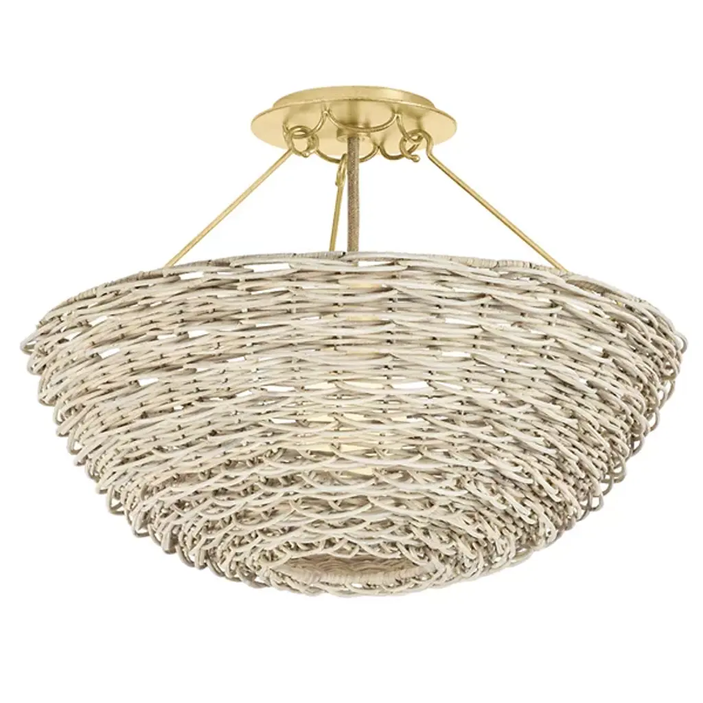 Woven in a unique scalloped pattern, the whitewash rattan of Campo makes for a highly textural and beautiful flush mount shade. The loose weave allows light to radiate through the negative space, casting mesmerizing lighting effects on the walls and ceiling. Vintage Gold Leaf metalwork supports the fixture, adding a touch of shine. Due to the one-of-a-kind nature of the medium, exact colors and patterns may vary slightly from the image shown.