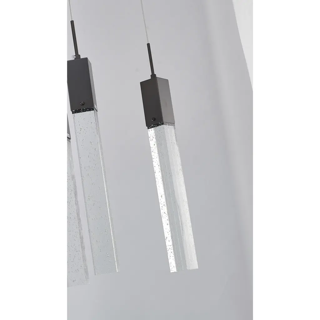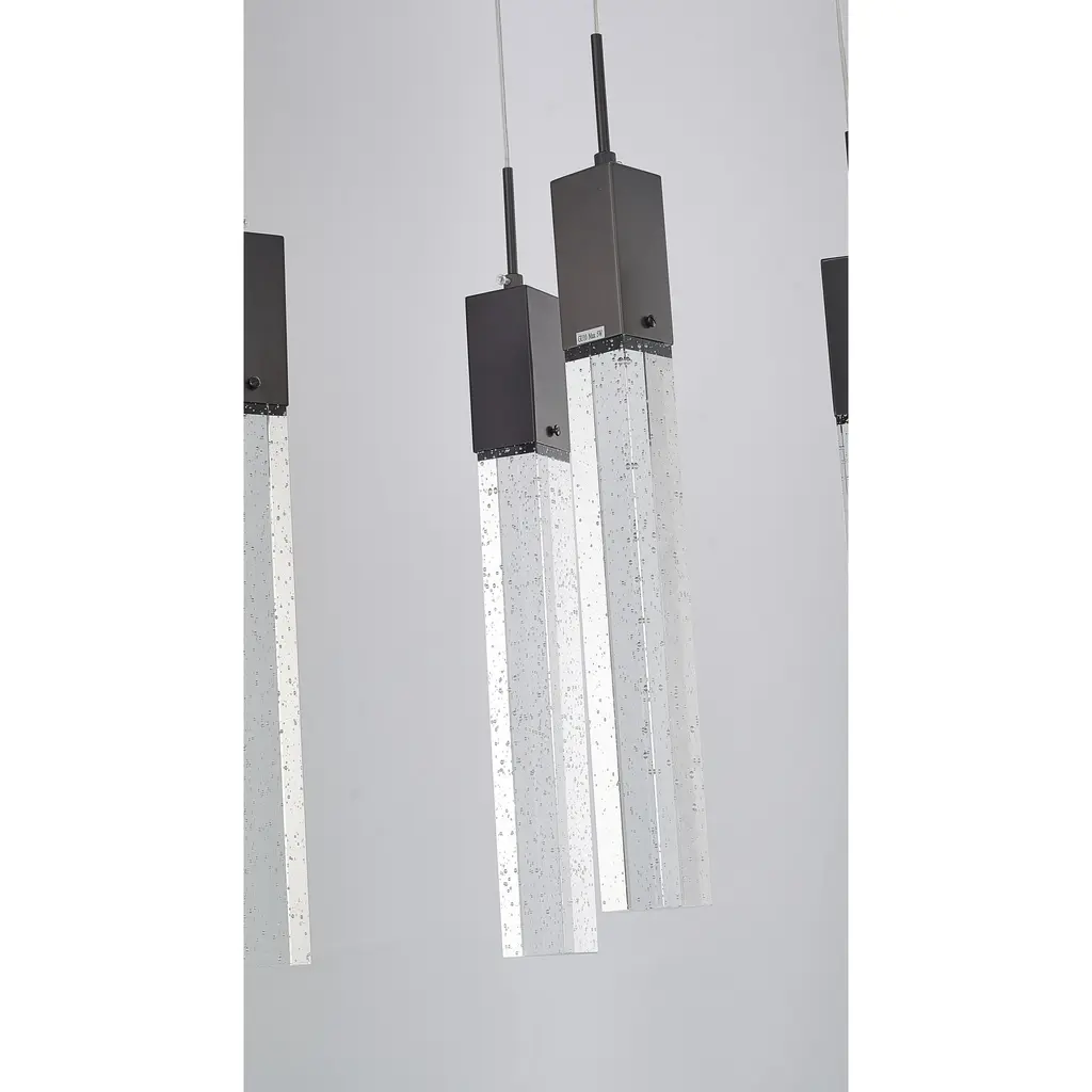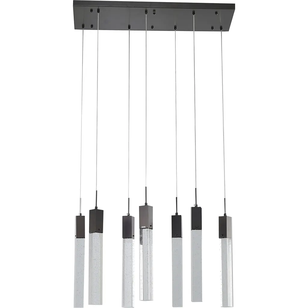 This 7-Light clear bubble Crystal transitional Island Lighting with a rectangular matte black frame is a stunning and modern lighting fixture that's sure to be a conversation starter in any room such as kitchen island, living room, dinning room, or entryway. Its sleek design and energy-efficient bulbs make it a great addition to any space that wants to add a touch of elegance and sophistication. The clear bubble crystal accents add a touch of luxury and sophistication to the design, while the rectangular matte black frame provides a modern and sleek contrast