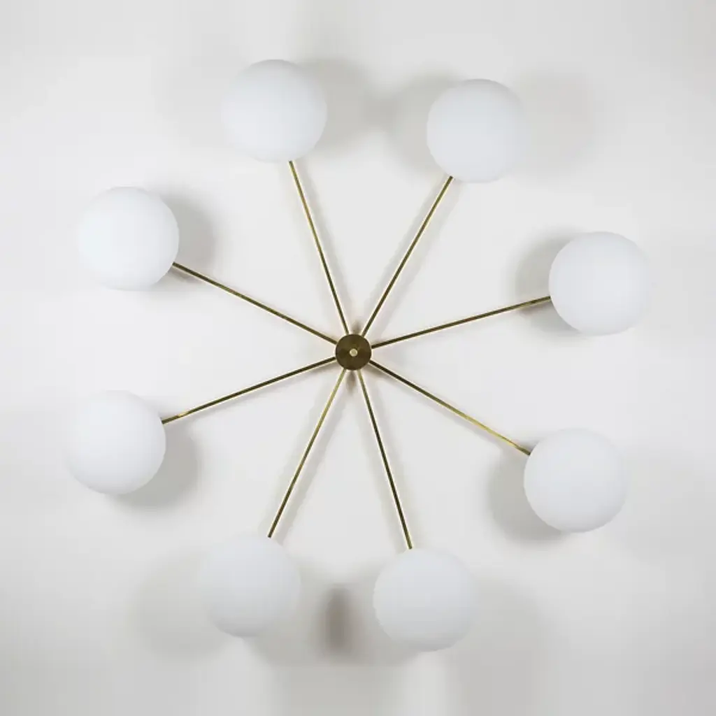 Present a balanced, bold character to inside spaces with the expansive lines of the Canopy Wall / Ceiling Light from Design For Macha. Eight slender brass arms extend from a round central hub at even intervals, each one terminating in bright lamping beneath a rounded shade of Opal glass. The fixture can be mounted as a horizontal wall mount or vertically as a conventional ceiling lamp, splashing out a vibrant glow that dances across the bold brass surface.