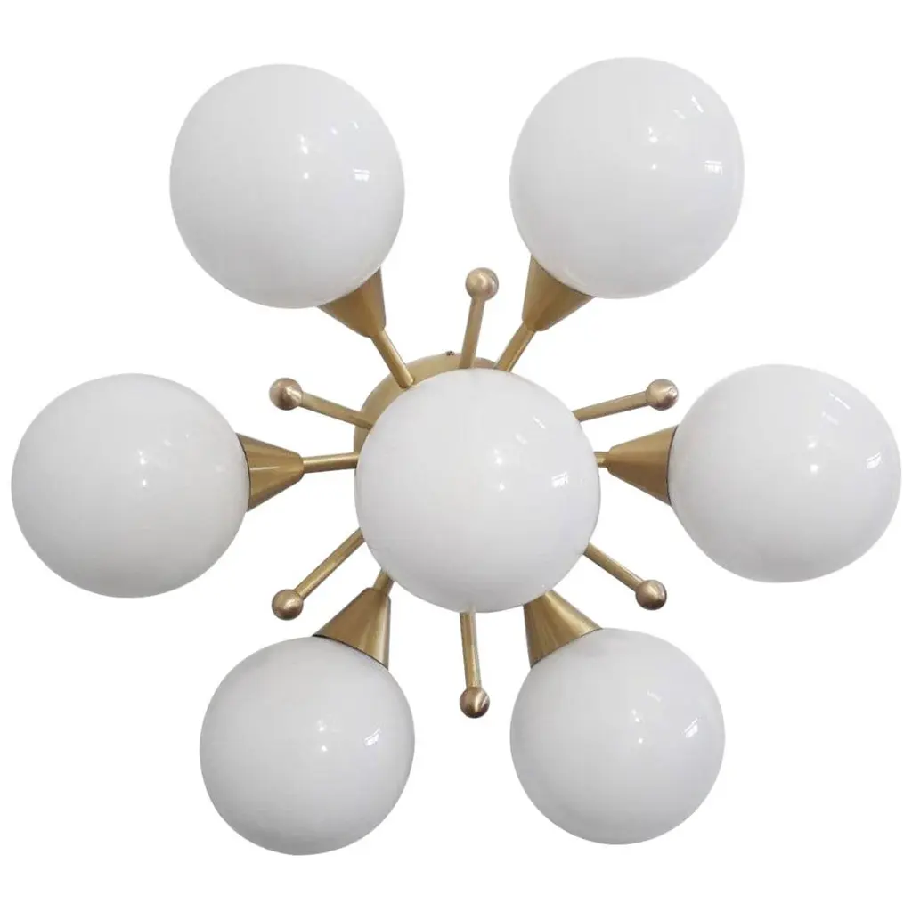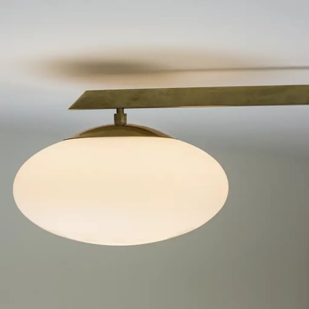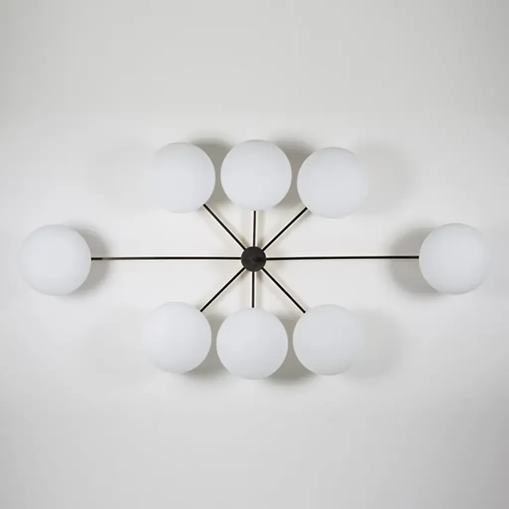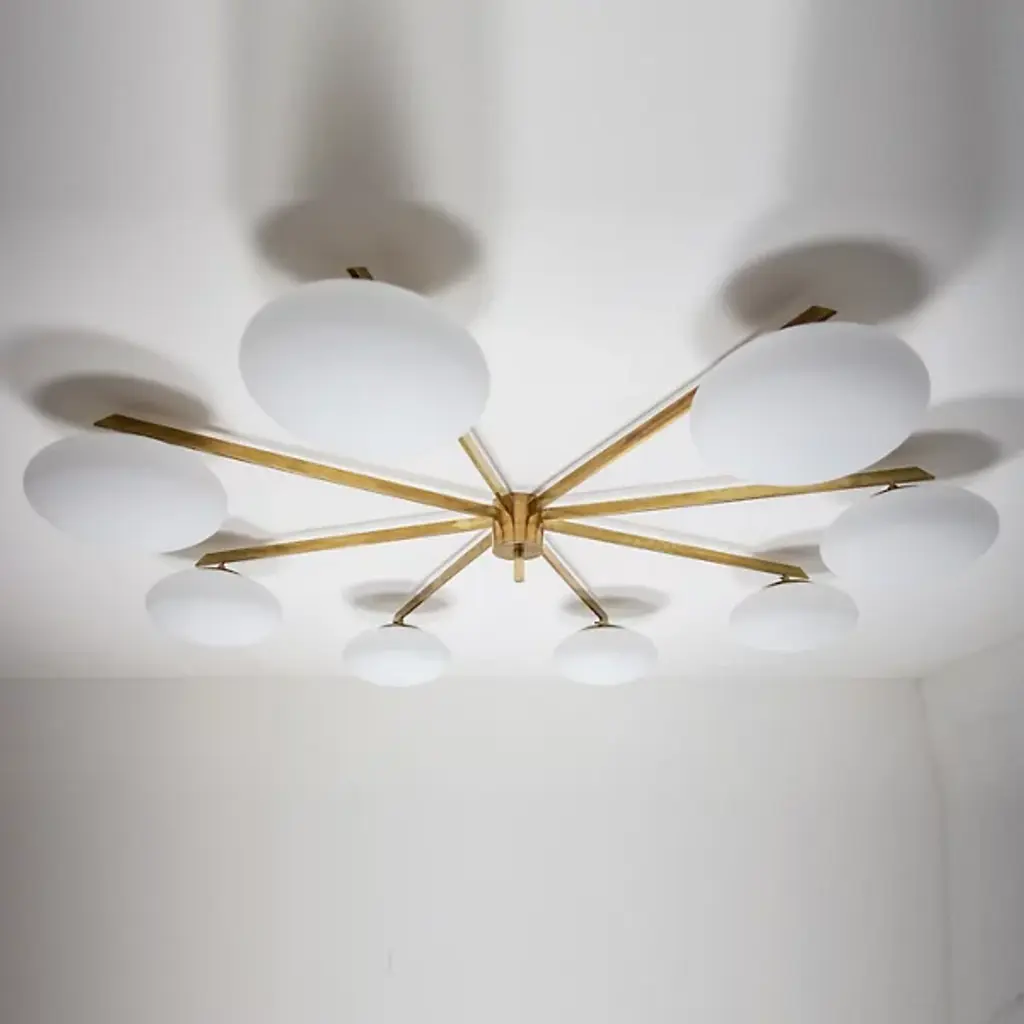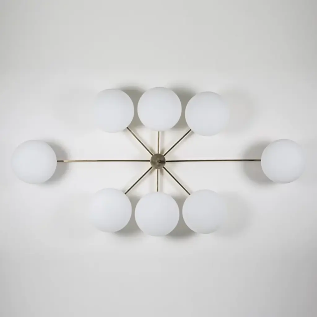 Present a balanced, bold character to inside spaces with the expansive lines of the Canopy Wall / Ceiling Light from Design For Macha. Eight slender brass arms extend from a round central hub at even intervals, each one terminating in bright lamping beneath a rounded shade of Opal glass. The fixture can be mounted as a horizontal wall mount or vertically as a conventional ceiling lamp, splashing out a vibrant glow that dances across the bold brass surface.