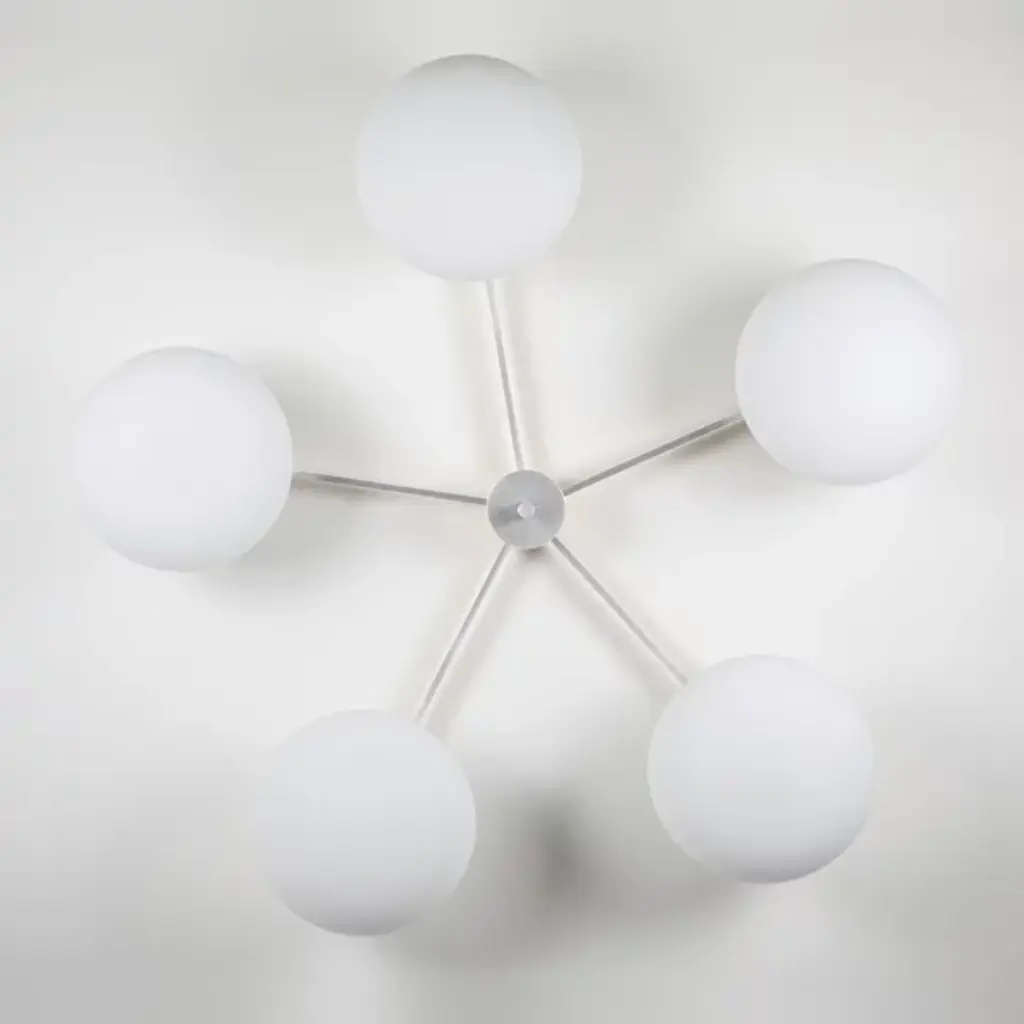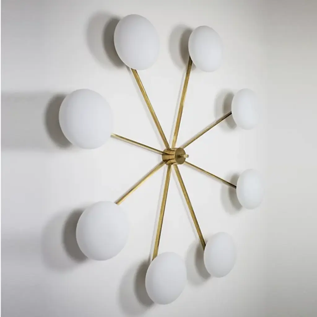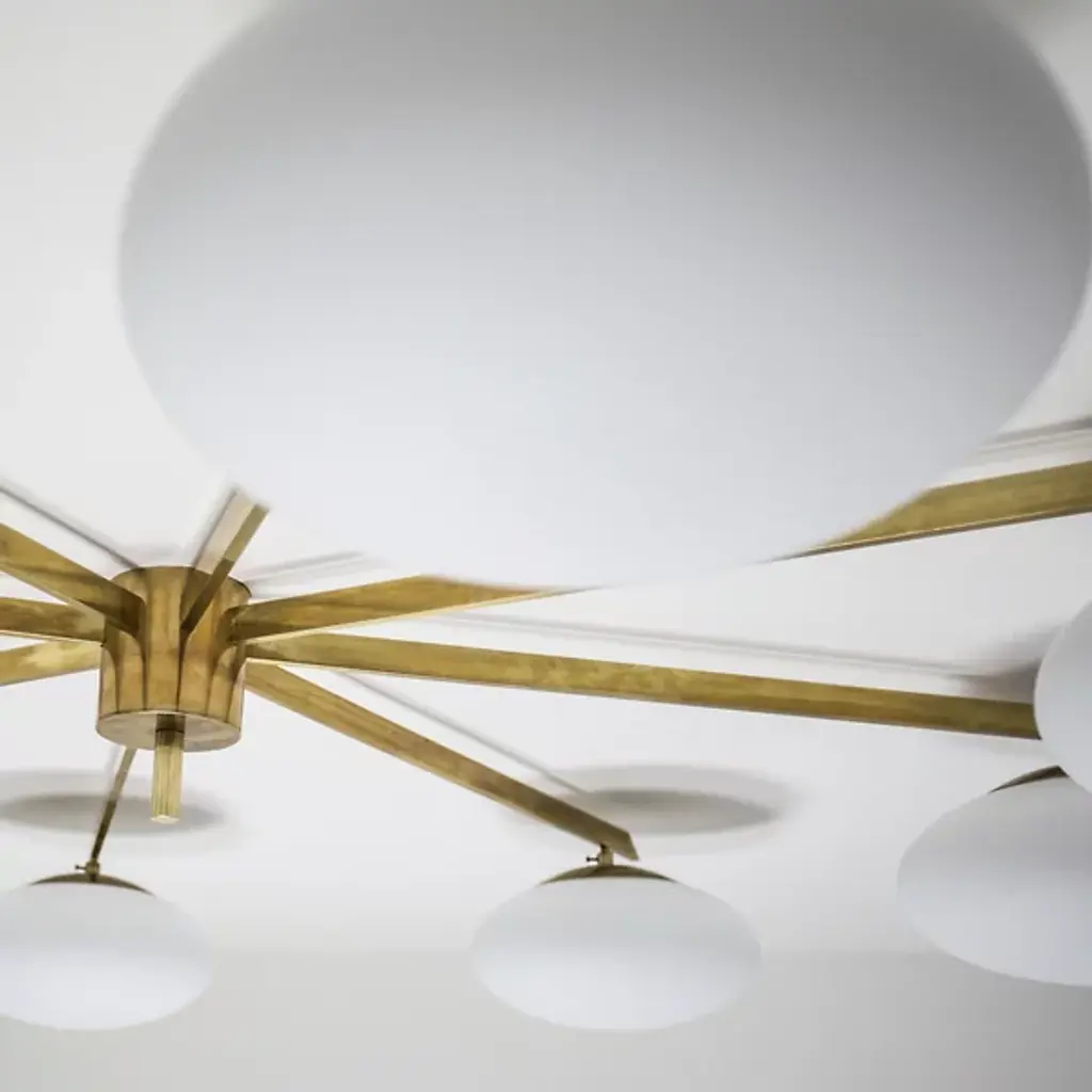 Present a balanced, bold character to inside spaces with the expansive lines of the Canopy Wall / Ceiling Light from Design For Macha. Eight slender brass arms extend from a round central hub at even intervals, each one terminating in bright lamping beneath a rounded shade of Opal glass. The fixture can be mounted as a horizontal wall mount or vertically as a conventional ceiling lamp, splashing out a vibrant glow that dances across the bold brass surface.