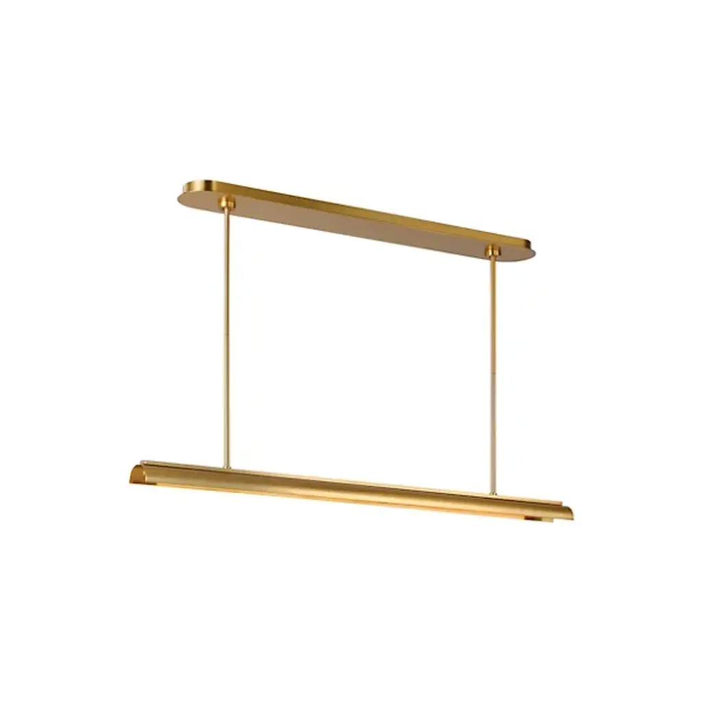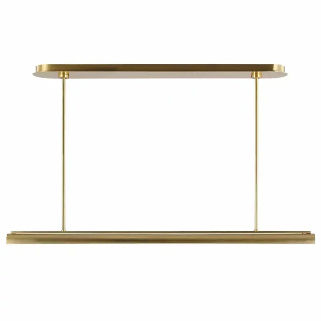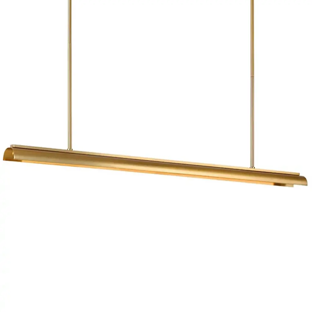 Sabers of pure seduction. Let yourself be entranced by the upsurging light passages of the Carson LED Linear Suspension from Visual Comfort Studio, formerly known as Kelly by Kelly Wearstler, The chandelier heightens the room’s spacious aura as a collection of slender contours. Its metal body sends down a radiating series of arms that curve upward to accentuate the towering lamping. Standing half-cylindrical shades serve as a light-directing and catching background for the linear bulbs. Creating a pristine silhouette, these LED rods give off a tight spread of illumination that combines to surround the room.