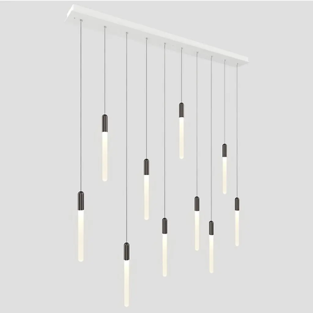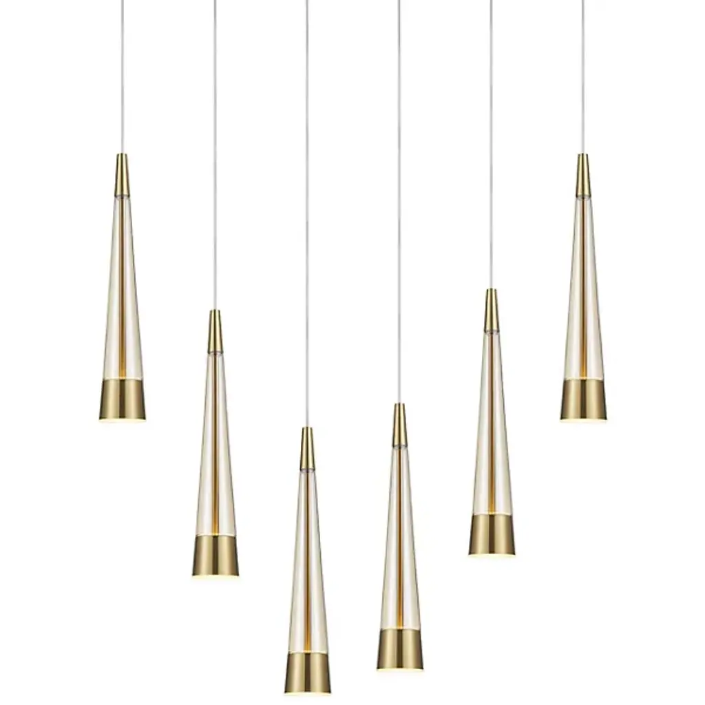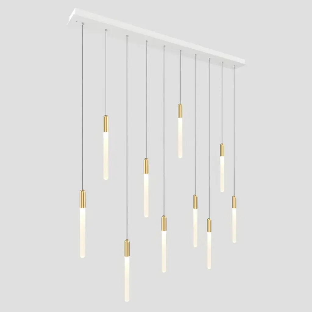 The Cascadia Linear Suspension from Matthew McCormick Studio inspires wonder like the snow-topped Canadian Cascades' mountain range with smooth passes of crisp illumination. While Matthew McCormick's work finds the magic of transforming form through light, he uses this piece as an homage to nature and its effortless beauty. It starts with a geometric canopy for a pure look. Slender wire suspends the slim elements below with a floating quality. Brass fitting pop in contrast against the handcrafted glass diffusers. Like a shining waterfall, light flows down with a smooth and energetic quality.