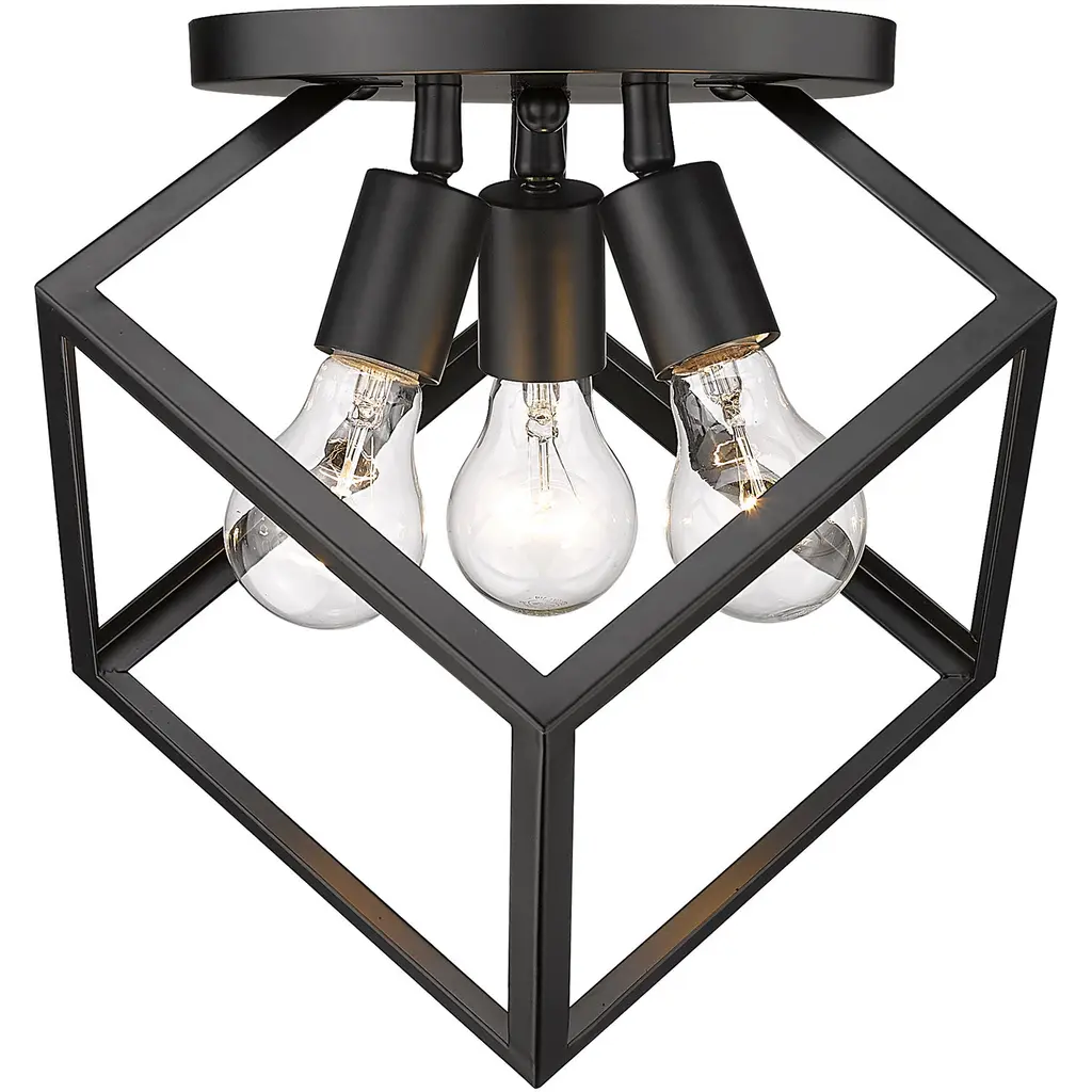 Introduce an Industrial edge to your home with the Golden Lighting Cassio 3-light Semi-Flush Mount. The raw, textured design and open-frame structure create a striking statement piece that enhances any modern decor. Featuring a durable metal construction, this fixture showcases its authentic design with exposed bulbs, ensuring a captivating illumination effect. The smooth Matte Black finish is both timeless and versatile, absorbing light while providing a sophisticated aesthetic.Ideal for entryways, bedrooms, kitchens, and living areas with mid-height ceilings, this damp location rated fixture is suitable for covered and semi-enclosed spaces, such as bathrooms and porches. It efficiently requires 3 E26 Medium base bulbs (not included) with a maximum wattage of 60 per bulb.Overall dimensions are 13.13"W x 12.5"H x 11.38"D, making it an ideal fit for various settings. Experience quality craftsmanship with this stylish fixture that complements industrial and contemporary designs.
