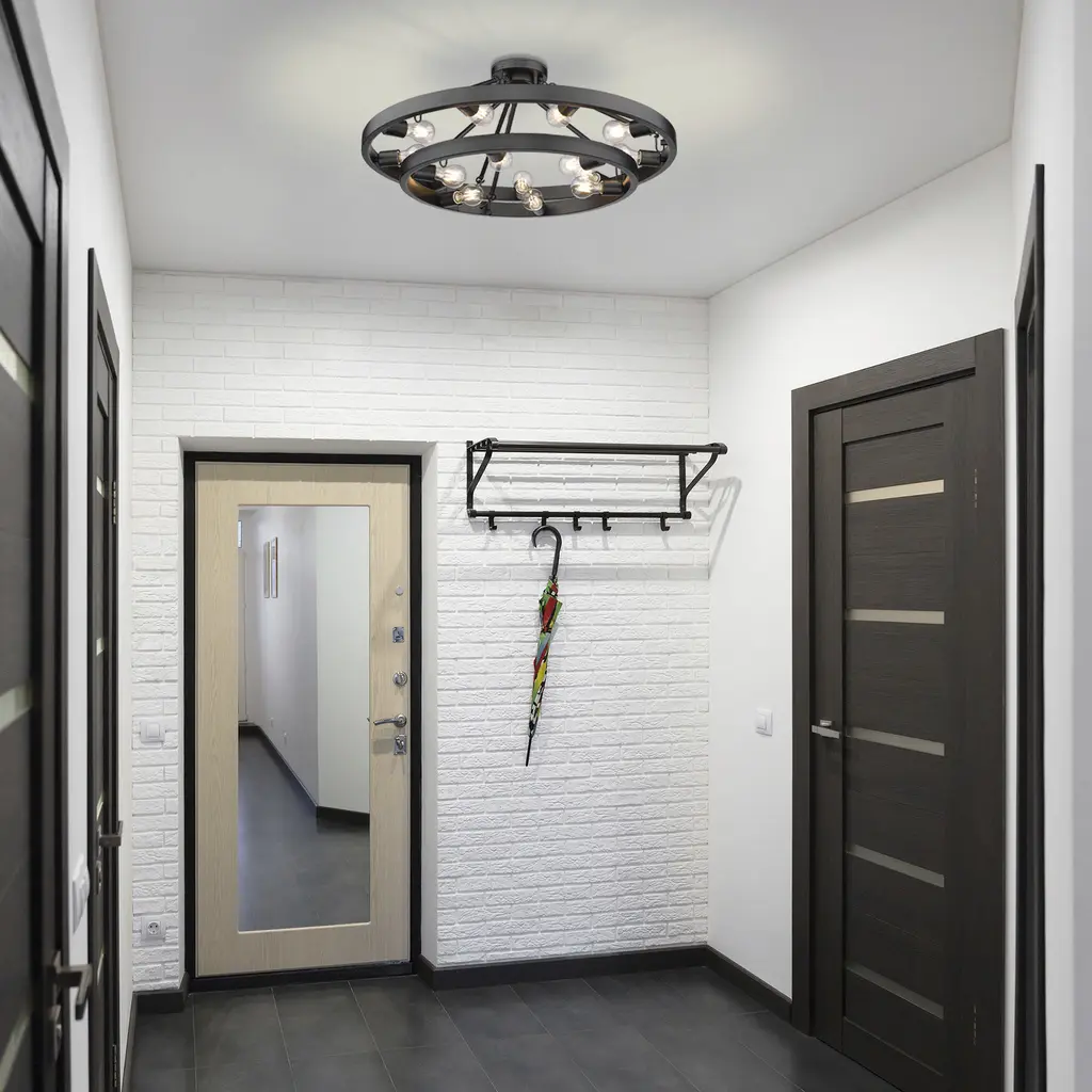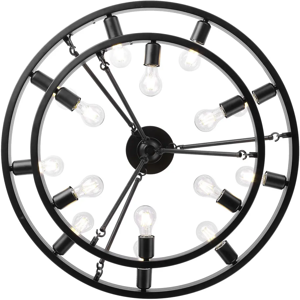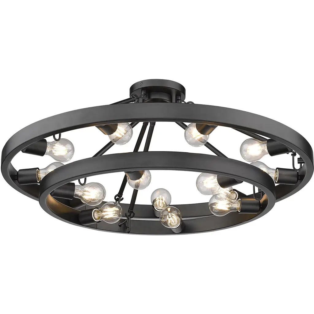 Bring modern elegance into your home with the Golden Lighting Castile 15-light Semi-Flush Mount. Featuring a Matte Black finish, it creates a welcoming atmosphere without the distraction of a shade.The design boasts a low-profile silhouette, ideal for spaces with lower ceilings, providing ample light without overwhelming the room. The Matte Black finish, with its smooth texture and non-reflective surface, offers a timeless appeal suited to any decor style, seamlessly blending traditional charm with contemporary flair.Versatile enough for entryways, bedrooms, kitchens, and living areas, this fixture is damp location rated, making it suitable for covered and semi-enclosed spaces. Requires 15 E26 medium base bulbs (not included), maximum wattage of 60 per bulb, delivering plenty of illumination for your spaces.With overall dimensions of 32"W x 13.38"H x 32"D, the Castile fixture presents a sophisticated yet functional centerpiece for your home. Experience quality lighting that merges style and practicality with this exquisite lighting piece.