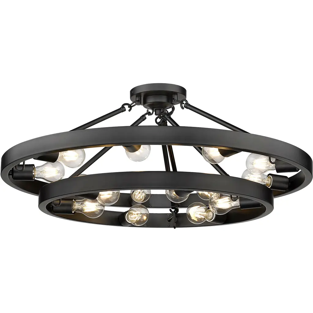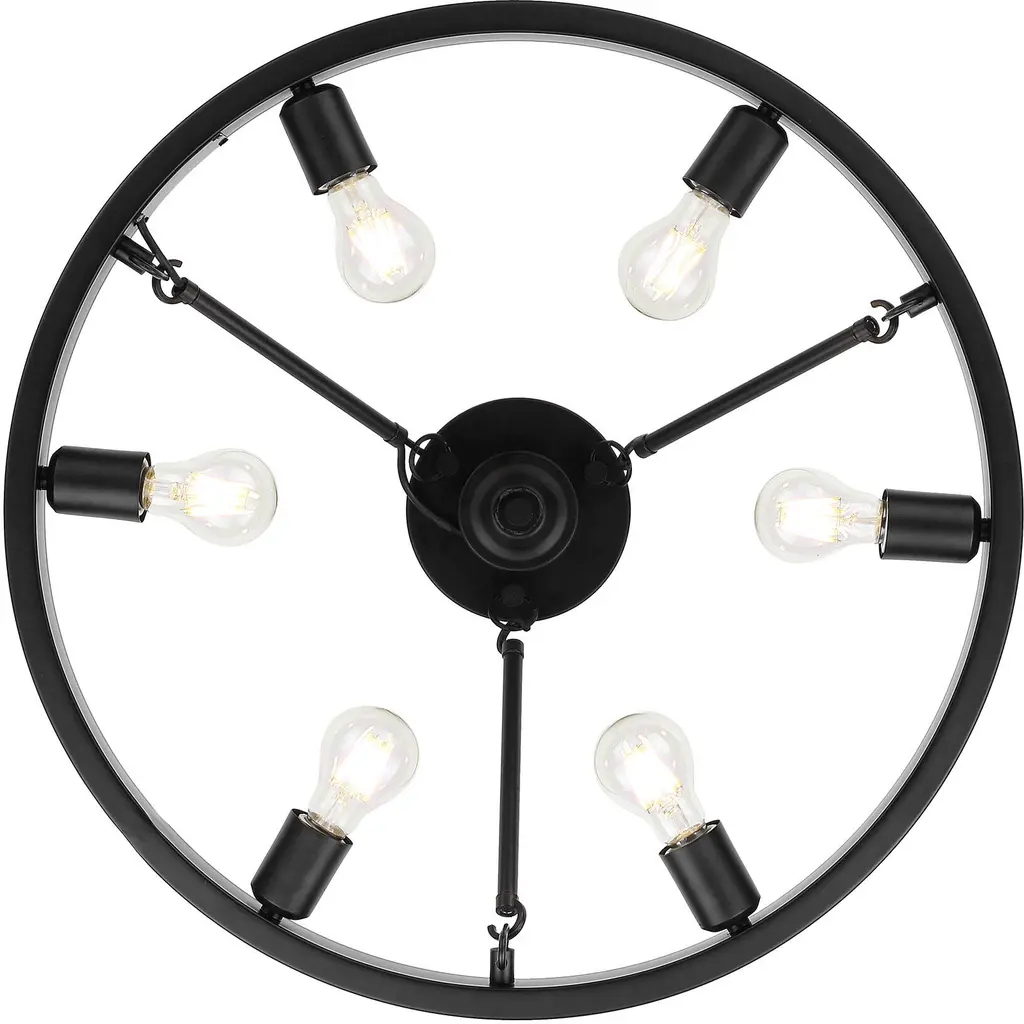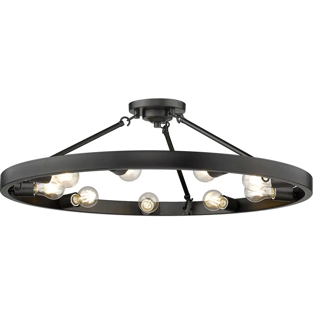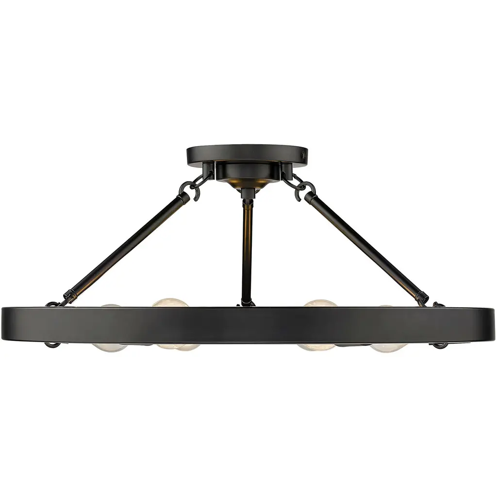 Bring modern elegance into your home with the Golden Lighting Castile 6-light Semi-Flush Mount. Featuring a low-profile design and a matte black frame, it creates a welcoming atmosphere without overwhelming your space.This fixture, designed without a shade, offers a clean and unobstructed light effect, ideal for illuminating your rooms. The wide-diameter rings are perfect for spaces with height constraints, allowing ample light to diffuse pleasantly throughout the area.The matte black finish epitomizes timeless style, seamlessly fitting into various decors, from minimalist to contemporary. Its smooth and non-reflective surface absorbs light, creating a sophisticated touch.Perfect for entryways, bedrooms, kitchens, and living areas with mid-height ceilings, this damp location rated fixture is suitable for covered and semi-enclosed spaces. With overall dimensions of 24"W x 9.5"H x 24"D, and requiring 6 E26 Medium base bulbs (not included), this semi-flush mount light is an excellent choice for illuminating your home with style and quality.