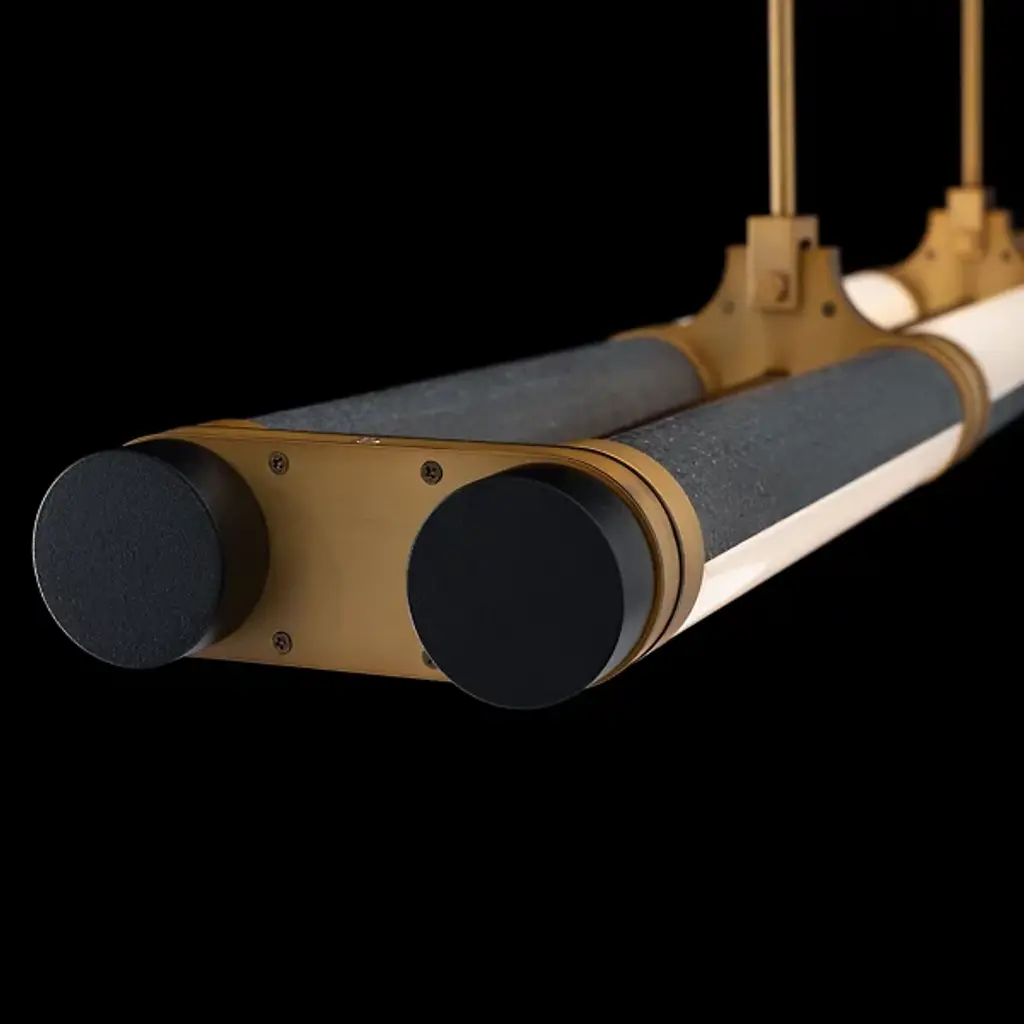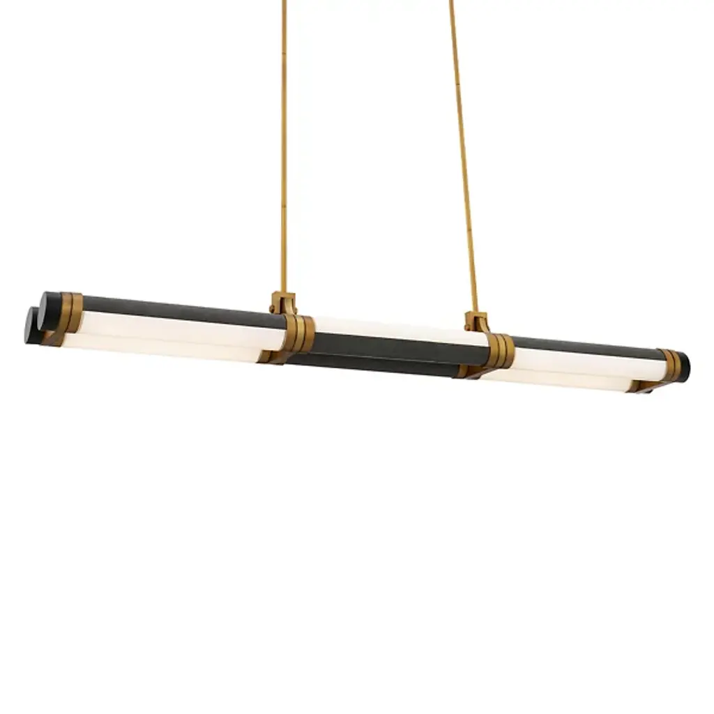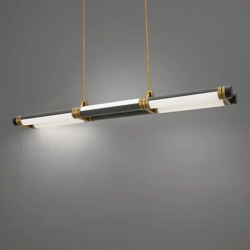 The Catania LED Linear Suspension from Modern Forms alternates black basalt stone half-circles with etched cast glass segments, creating striking material contrast along its linear framework. Each segment can rotate 180 degrees, allowing customizable configuration and visual variety according to user preference. Lustrous, aged brass hardware connects the individual elements, housing the LED technology that illuminates the translucent glass portions. Four selectable color temperatures enable lighting adjustment through canopy controls, while the rotatable segments add kinetic possibility to the suspended composition.