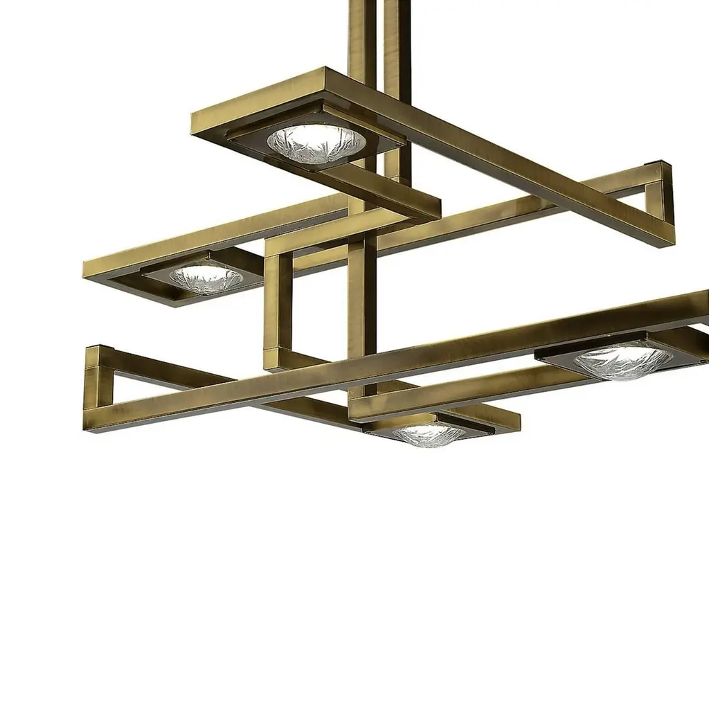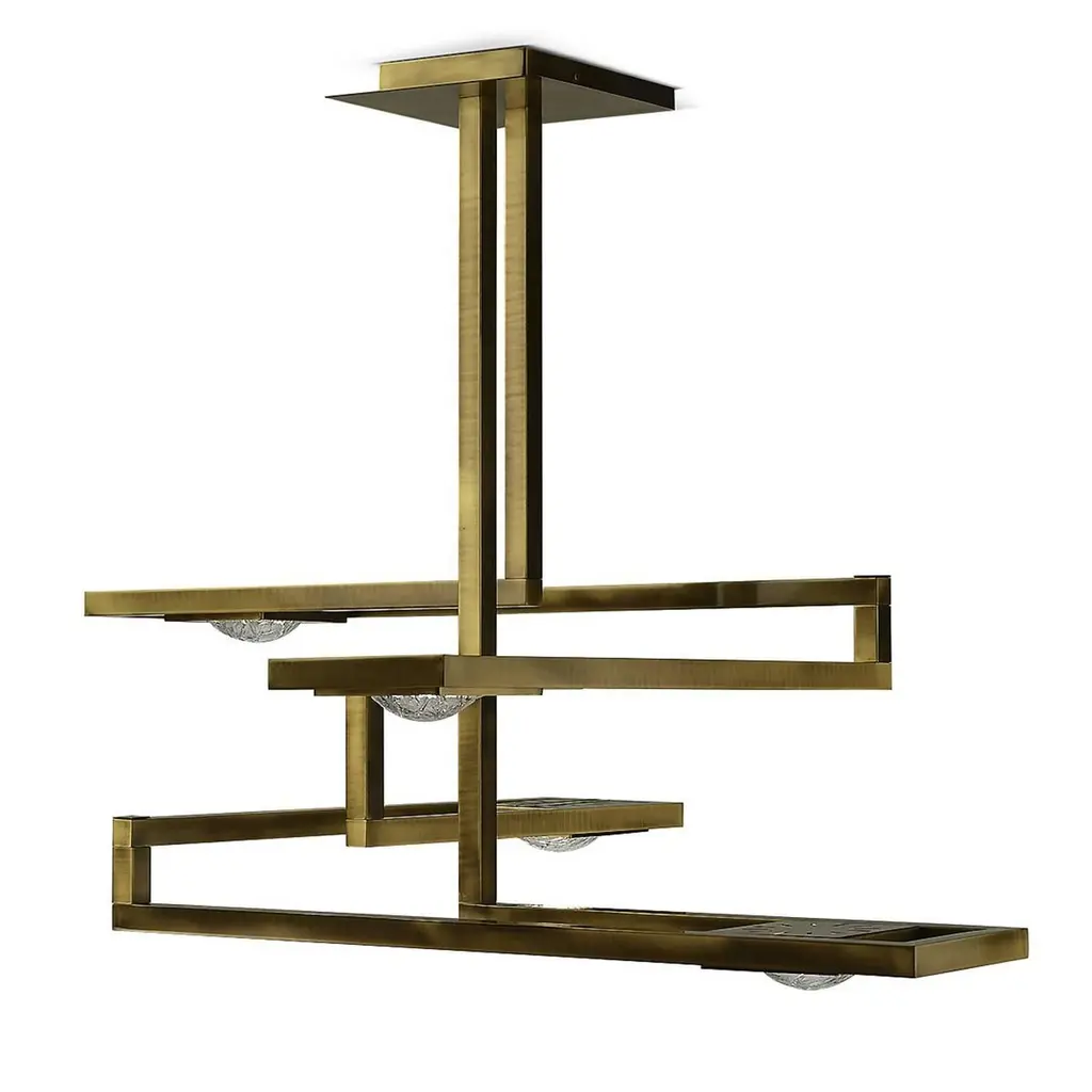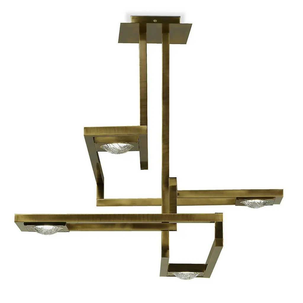 This stunning ceiling lamp is made entirely of brass with a square base attached to the ceiling from which two vertical elements stem, creating a series of legs positioned at different heights in the shape of a rectangle. At the edges of each arm, a light shines, diffused by a shade in highly durable polycarbonate with a transparent, ice-like finish. A striking addition to an entryway, a living room, or a dining room, this lamp can be combined with other pieces from the Cecile collection.
