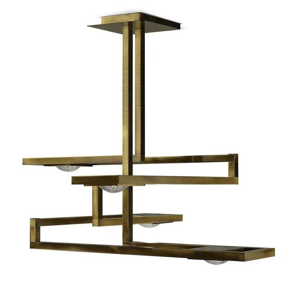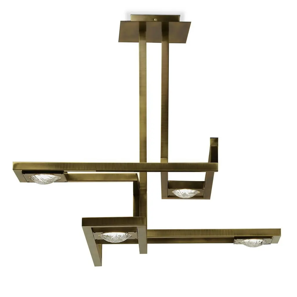 This exquisite lamp was entirely made of brass. It is attached to the ceiling through a square base, from which two vertical elements hang, creating a Minimalist structure with four arms that create a square Silhouette, hanging at different heights at 90 degrees angles from each other, each supporting a light. The shades of the lights are in polycarbonate, a thermoplastic material that is durable and resistant, and have an ice-like finish.