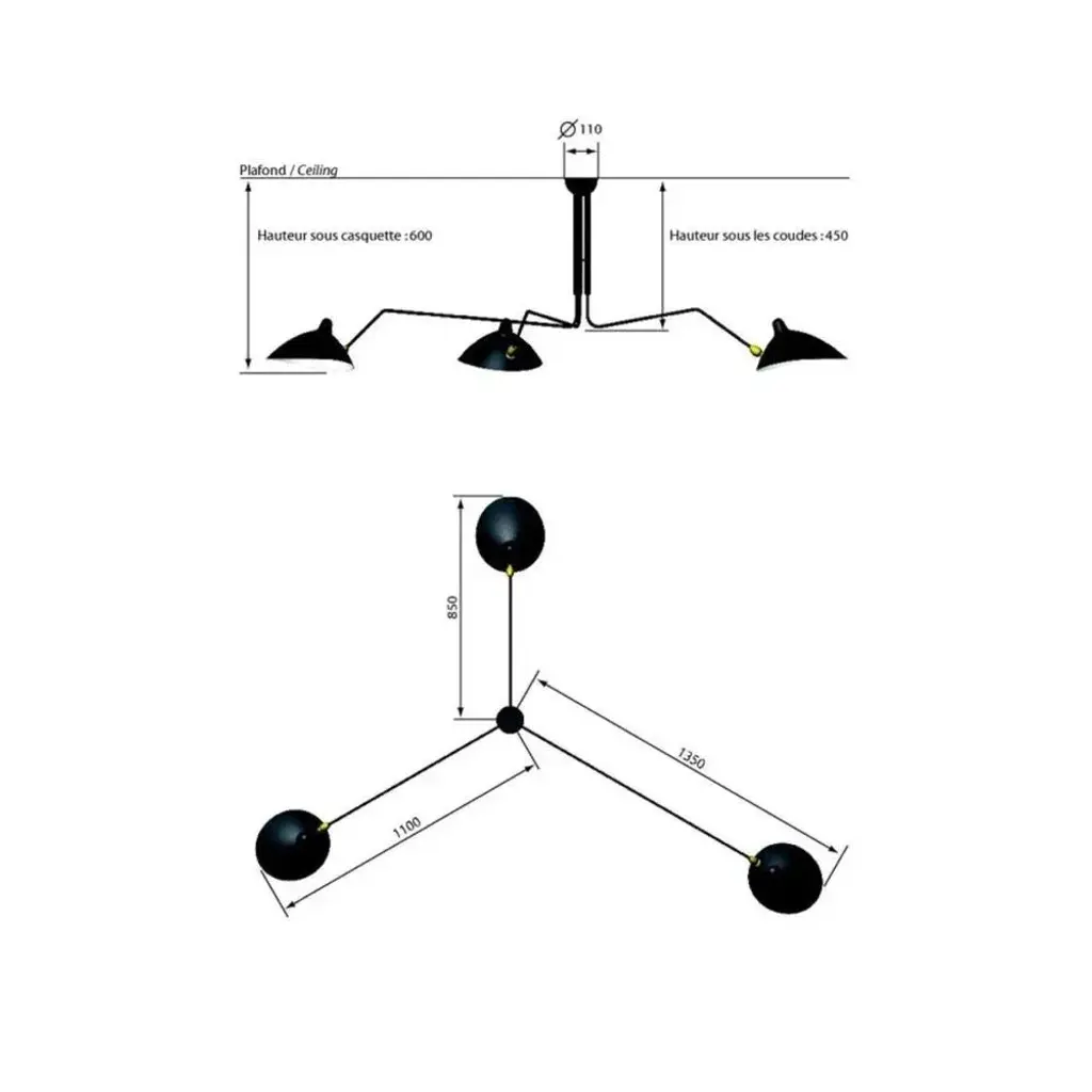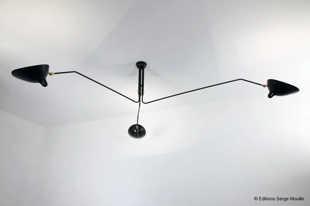 Ceiling lamp 3 rotating arms by serge mouille dimensions: d245 x h60 cm materials: brass, steel, aluminium one of a king. Numbered. Also available in different colour. All our lamps can be wired according to each country. If sold to the usa it will be wired for the usa for instance. Made in france by éditions serge mouille with the same integrity as the period models, this serge mouille 3 pivoting arm ceiling light is a reissue of an iconic model from 1958. Featuring 3 curved steel pivoting arms, it features 3 reflectors in aluminum adjustable thanks to a brass ball joint. Available in black or white, this numbered model is delivered quickly with its certificate of authenticity. up to 250v (europe/uk standard).