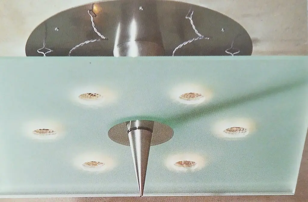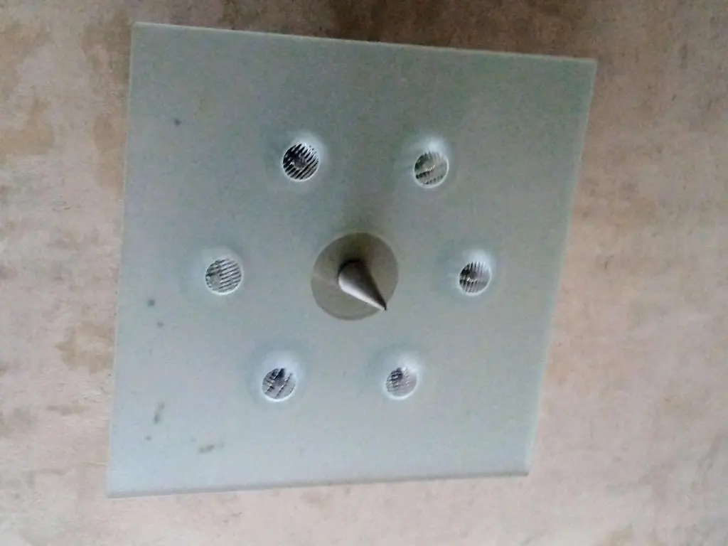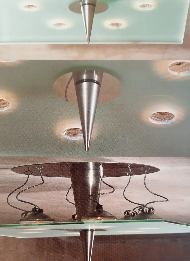 Ceiling light, acidified glass plate which hangs 20 cm from ceiling. With inox pin and inox plate on ceiling. Connected by wires to 6 par 36 lamps 12v, also available in led lamp. Overall height is 38 cm.